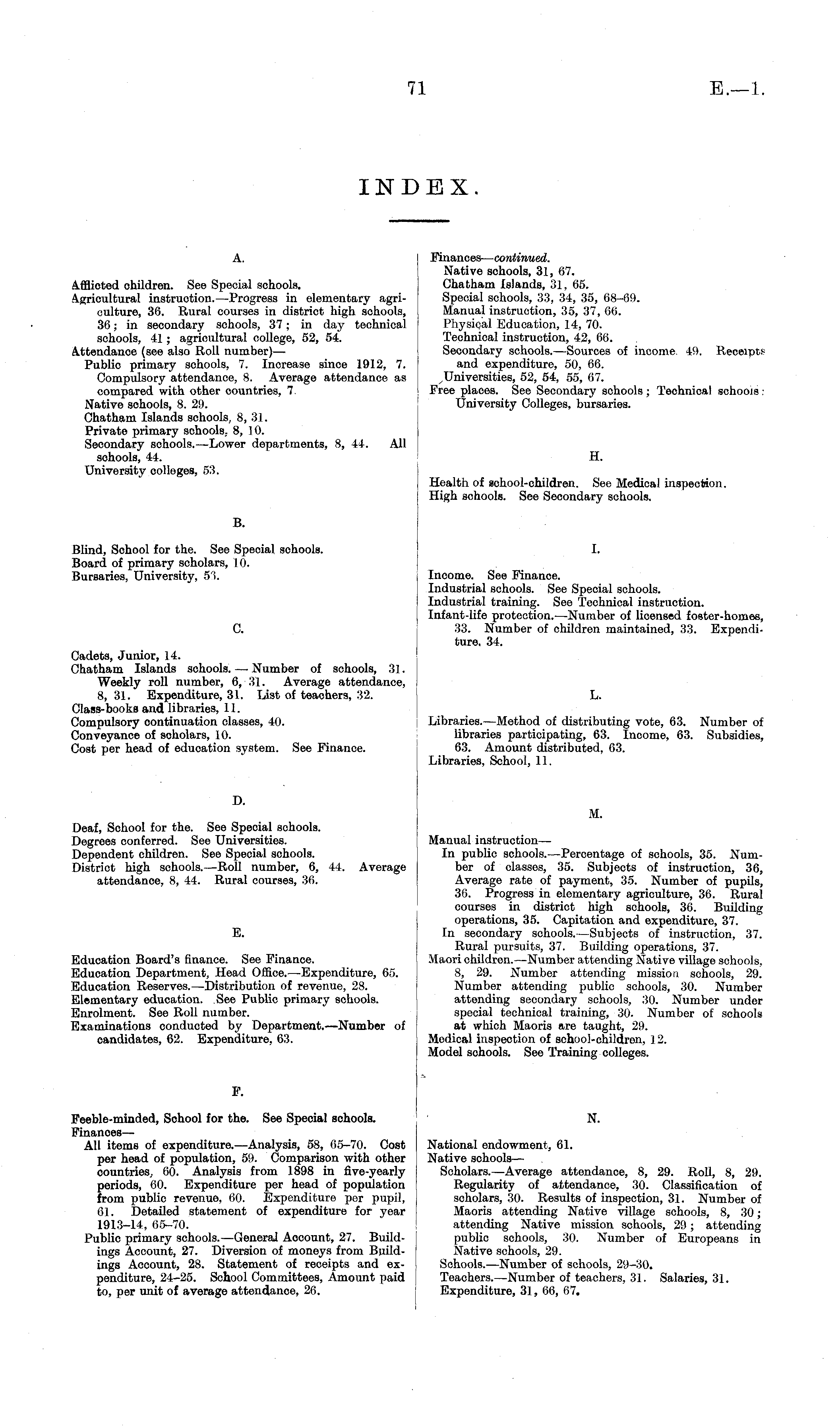 Finances— continued. Native schools, 31, 67. Chatham Islands, 31, 65. Special schools, 33, 34, 35, 68-69. Manual instruction, 35, 37, 66. Physical Education, 14, 70. Technical instruction, 42, 66. Secondary schools.—Sources of income. 49. Receipt*? and expenditure, 50, 66. 52, 54, 55, 67. Free places. See Secondary schools ; Technical schools : University Colleges, bursaries. H. Health of school-children. See Medical inspection. High schools. See Secondary schools. I. Income. See Finance. Industrial schools. See Special schools. Industrial training. See Technical instruction. Infant-life protection.—Number of licensed foster-homes, 33. Number of children maintained, 33. Expenditure, 34. L. Libraries.—Method of distributing vote, 63. Number of libraries participating, 63. Income, 63. Subsidies, 63. Amount distributed, 63. Libraries, School, 11. M. Manual instruction— In public schools.—Percentage of schools, 35. Number of classes, 35. Subjects of instruction, 36, Average rate of payment, 35. Number of pupils, 36. Progress in elementary agriculture, 36. Rural courses in district high schools, 36. Building operations, 35. Capitation and expenditure, 37. In secondary schools.—Subjects of instruction, 37. Rural pursuits, 37. Building operations, 37. ! Maori children.—Number attending Native village schools, 8, 29. Number attending mission schools, 29. Number attending public schools, 30. Number attending secondary schools, ,'SO. Number under special technical training, 30. Number of schools at which Maoris are taught, 29. Medical inspection of school-children, 12. Model sohools. See Training colleges. N. National endowment, 61. Native schools— Scholars.—Average attendance, 8, 29. Roll, 8, 29. Regularity of attendance, 30. Classification of scholars, 30. Results of inspection, 31. Number of Maoris attending Native village schools, 8, 30; attending Native mission schools, 29; attending public schools, 30. Number of Europeans in Native schools, 29. Schools.—Number of schools, 29-30. Teachers.—Number of teachers, 31. Salaries, 31. Expenditure, 31, 66, 67.