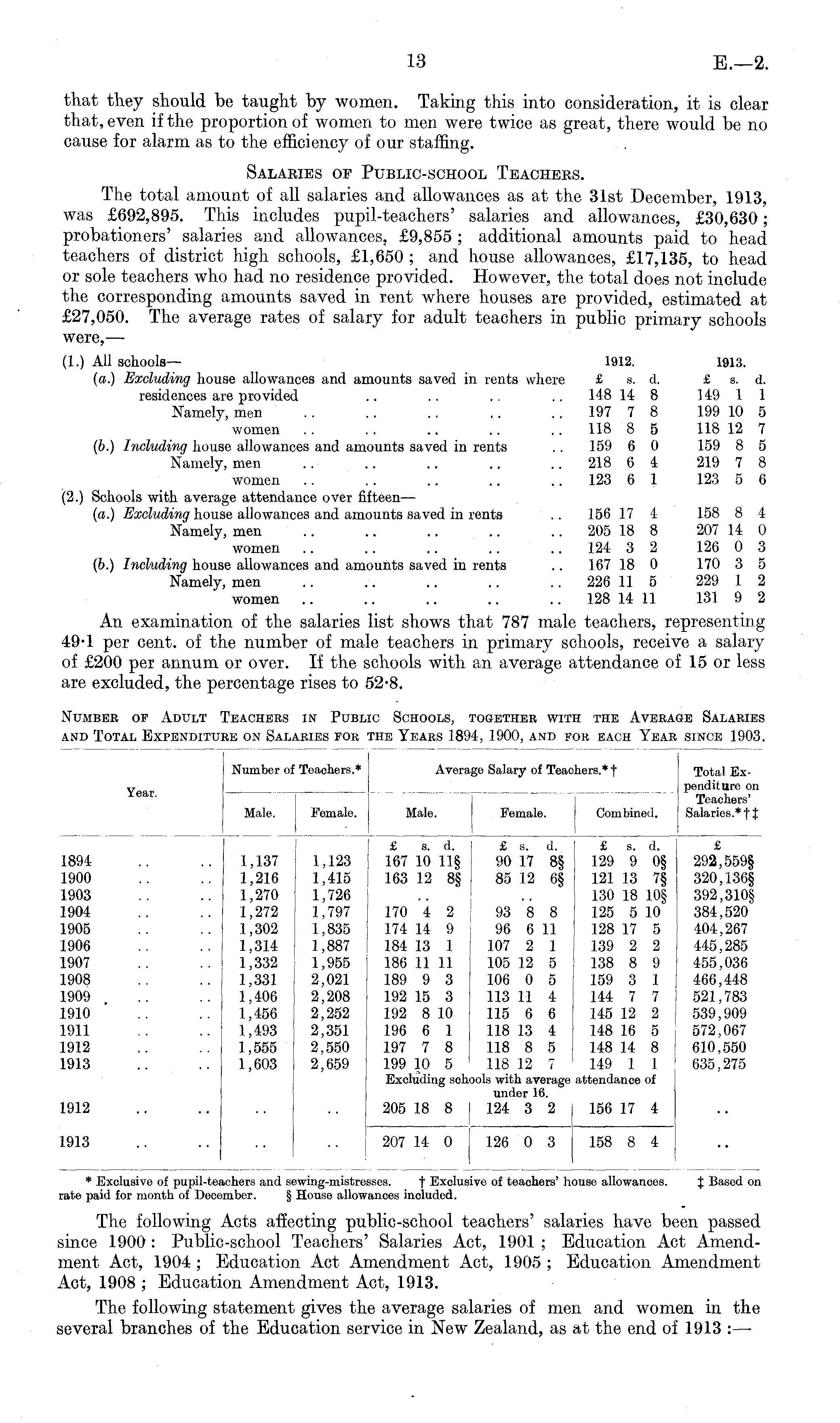 Number of Teachers.* Average Salary of Teac] iers.* f Total Expenditure on Teachers' Salaries.* f J Male. Female. Male. Female. Combined. 1894 1900 1903 1904 1905 1906 1907 1908 1909 . 1910 1911 1912 1913 1,137 1,216 1,270 1,272 1,302 1,314 1,332 1,331 1,406 1,456 1,493 1,555 1,603 1,123 1,415 1,726 1,797 1,835 1,887 1,955 2,021 2,208 2,252 2,351 2,550 2,659 £ s. d. 167 10 11§ 163 12 8§ £ s. d. £ s. d. 90 17 8§ 129 9 0§ 85 12 6§ 121 13 7§ 130 18 10§ 93 8 8 125 5 10 96 6 11 128 17 5 107 2 1 139 2 2 105 12 5 138 8 9 106 0 5 159 3 1 113 11 4 144 7 7 115 6 6 145 12 2 118 13 4 148 16 5 118 8 5 148 14 8 118 12 7 149 1 1 iols with average attendance of under 16. 124 3 2 156 17 4 I £ 292,559§ 320,136§ 392,310§ 384,520 404,267 445,285 455,036 466,448 521,783 539,909 572,067 610,550 635,275 170 4 2 174 14 9 184 13 1 186 11 11 189 9 3 192 15 3 192 8 10 196 6 1 197 7 8 199 10 5 Excluding sohc 1912 205 18 8 1913 207 14 0 126 0 3 158 8 4 * Exclusive of pupil-tei rate paid for month of Dece sachers and se iember. § 3wing-mistr( House alloT isses. f Exclui ranees included. jive of teachers' house allowances. { Based on