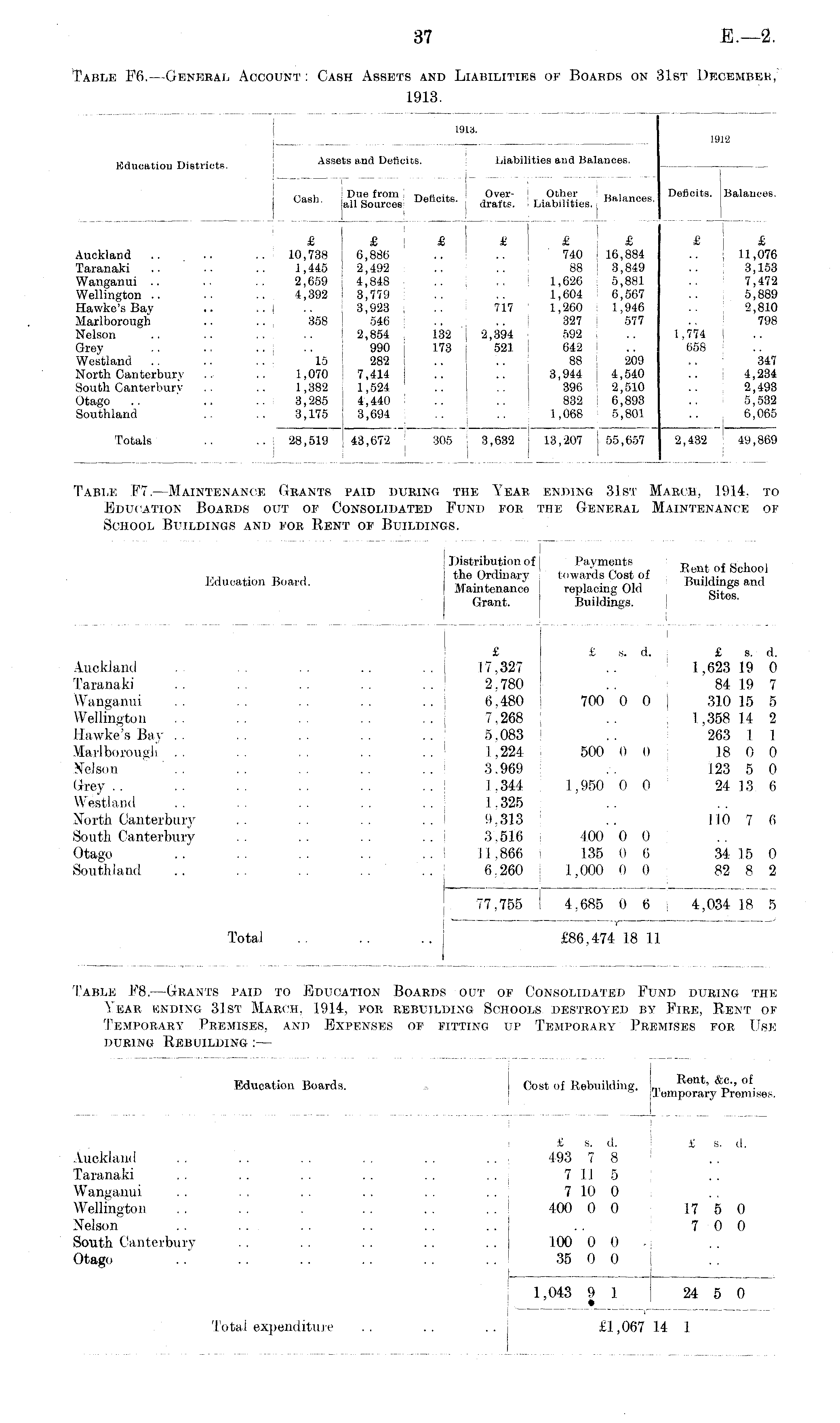 Table F8. —Grants paid to Education Boards out of Consolidated Fund during the Year ending 31st March, 1914, for rebuilding Schools destroyed by Fire, Rent of Temporary Premises, and Expenses of fitting up Temporary Premises for Use during Rebuilding:—
