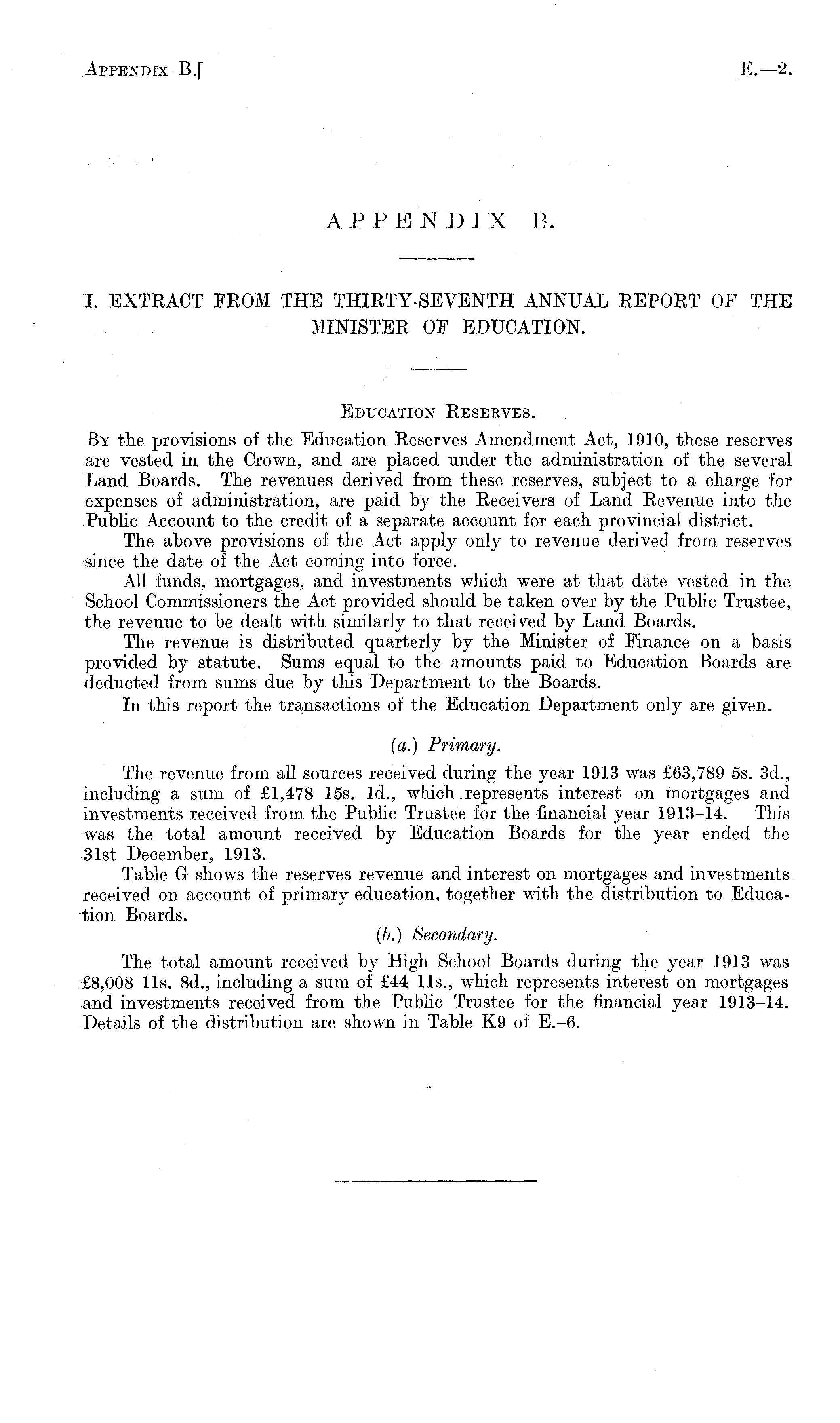 Education Reserves. J3y the provisions of the Education Reserves Amendment Act, 1910, these reserves are vested in the Crown, and are placed under the administration of the several Land Boards. The revenues derived from these reserves, subject to a charge for expenses of administration, are paid by the Receivers of Land Revenue into the Public Account to the credit of a separate account for each provincial district. The above provisions of the Act apply only to revenue derived from reserves since the date of the Act coming into force. All funds, mortgages, and investments which were at that date vested in the School Commissioners the Act provided should be taken over by the Public Trustee, the revenue to be dealt with similarly to that received by Land Boards. The revenue is distributed quarterly by the Minister of Finance on a basis provided by statute. Sums equal to the amounts paid to Education Boards are •deducted from sums due by this Department to the Boards. In this report the transactions of the Education Department only are given. (a.) Primary. The revenue from all sources received during the year 1913 was £63,789 ss. 3d., including a sum of £1,478 15s. Id., which. represents interest on mortgages and investments received from the Public Trustee for the financial year 1913-14. This was the total amount received by Education Boards for the year ended the 31st December, 1913. Table G- shows the reserves revenue and interest on mortgages and investments received on account of primary education, together with the distribution to Education Boards. (b.) Secondary. The total amount received by High School Boards during the year 1913 was £8,008 11s. Bd., including a sum of £44 11s., which represents interest on mortgages and investments received from the Public Trustee for the financial year 1913-14. Details of the distribution are shown in Table K9 of E.-6.