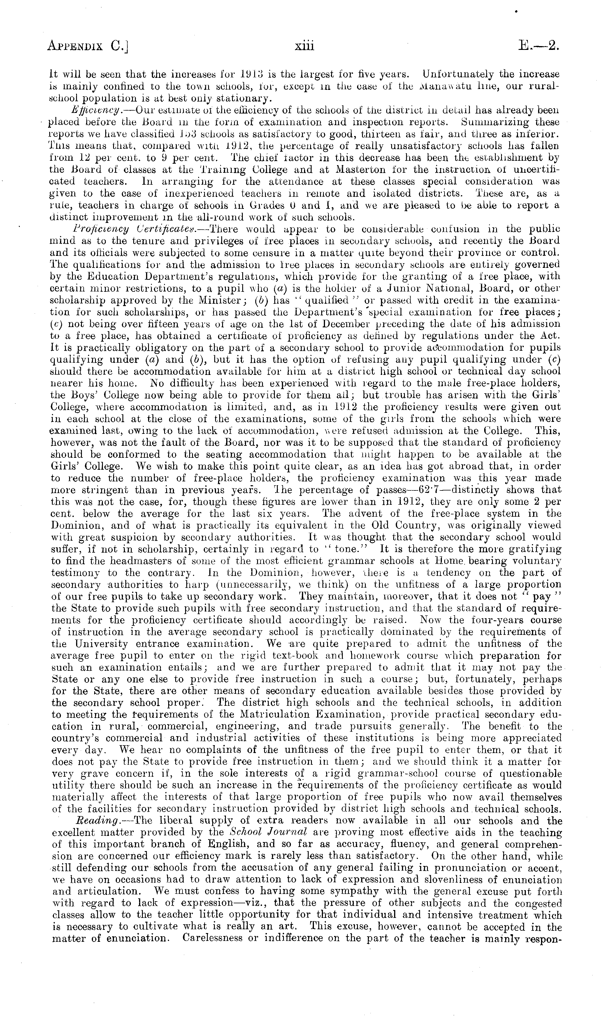 It will be seen that the increases for 1913 is the largest for five years. Unfortunately the increase is mainly confined to the town schools, lor, except in the case of the iVlanawatu line, our ruralschool population is at best only stationary. Efficiency. —Our estimate of the efficiency of the schools of the district in detail has already been placed before the Board m the form of examination and inspection reports. Summarizing these reports we have classified J o 3 schools as satisfactory to good, thirteen as fair, and three as inferior. Tills means that, compared with 1912, the percentage of really unsatisfactory schools has fallen from 12 per cent, to 9 per cent. The chief factor in this decrease has been tht establishment by the Board of classes at the Training College and at Masterton for the instruction of uncertificated teachers. In arranging for the attendance at these classes special consideration was given to the case of inexperienced teachers in remote and isolated districts. These are, as a rule, teachers in charge of schools in Grades 0 and 1, and we are pleased to be able to report a distinct improvement in the all-round work of such schools. Proficiency Certificates. —There would appear to be considerable confusion in the public mind as to the tenure and privileges of free places in secondary schools, and recently the Board and its officials were subjected to some censure in a matter quite beyond their province or control. The qualifications for and the admission to free places in secondary schools are entirely governed by the Education Department's regulations, which provide for the granting of a free place, with certain minor restrictions, to a pupil who (a) is the holder of a Junior National, Board, or other scholarship approved by the Minister; (b) has " qualified " or passed with credit in the examination for sucli scholarships, or has passed the Department's'special examination for free places; (c) not being over fifteen years of age on the Ist of December preceding the date of his admission to a free place, has obtained a certificate of proficiency as defined by regulations under the Act. it is practically obligatory on the part of a secondary school to provide accommodation for pupils qualifying under (a) and (b), but it has the option of refusing any pupil qualifying under (c) should there be accommodation available for him at a district high school or technical day school nearer his home. No difficulty has been experienced with regard to the male free-place holders, the Boys' College now being able to provide for them all; but trouble has arisen with the Girls' College, where accommodation is limited, and, as in 1912 the proficiency results were given out in each school at the close of the examinations, some of the girls from the schools which were examined last, owing to the lack of accommodation, were refused admission at the College. This, however, was not the fault of the Board, nor was it to be supposed that the standard of proficiency should be conformed to the seating accommodation that might happen to be available at the Girls' College. We wish to make this point quite clear, as an idea has got abroad that, in order to reduce the number of free-place holders, the proficiency examination was this year made more stringent than in previous years. The percentage of passes —62"7 —distinctly shows that this was not the case, for, though these figures are lower than in 1912, they are only some 2 per cent, below the average for the last six years. The advent of the free-place system in the Dominion, and of what is practically its equivalent in the Old Country, was originally viewed with great suspicion by secondary authorities. It was thought that the secondary school would suffer, if not in scholarship, certainly in regard to " tone." It is therefore the more gratifying to find the headmasters of some of the most efficient grammar schools at Home, bearing voluntarytestimony to the contrary. In the Dominion, however, there is a tendency on the part of secondary authorities to harp (unnecessarily, we think) on the unfitness of a large proportion of our free pupils to take up secondary work. They maintain, moreover, that it does not " pay " the State to provide such pupils with free secondary instruction, and that the standard of requirements for the proficiency certificate should accordingly be raised. Now the four-years course of instruction in the average secondary school is practically dominated by the requirements of the University entrance examination. We are quite prepared to admit the unfitness of the average free pupil to enter on the rigid text-book and homework course which preparation for such an examination entails; and we are further prepared to admit that it may not pay the State or any one else to provide free instruction in such a course; but, fortunately, perhaps for the State, there are other means of secondary education available besides those provided by the secondary school proper. The district high schools and the technical schools, in addition to meeting the requirements of the Matriculation Examination, provide practical secondary education in rural, commercial, engineering, and trade pursuits generally. The benefit to the country's commercial and industrial activities of these institutions is being more appreciated every day. We hear no complaints of the unfitness of the free pupil to enter them, or that it does not pay the State to provide free instruction in them; and we should think it a matter for very grave concern if, in the sole interests of a rigid grammar-school course of questionable utility there should be such an increase in the requirements of the proficiency certificate as would materially affect the interests of that large proportion of free pupils who now avail themselves of the facilities for secondary instruction provided by district high schools and technical schools. Beading. —The liberal supply of extra read