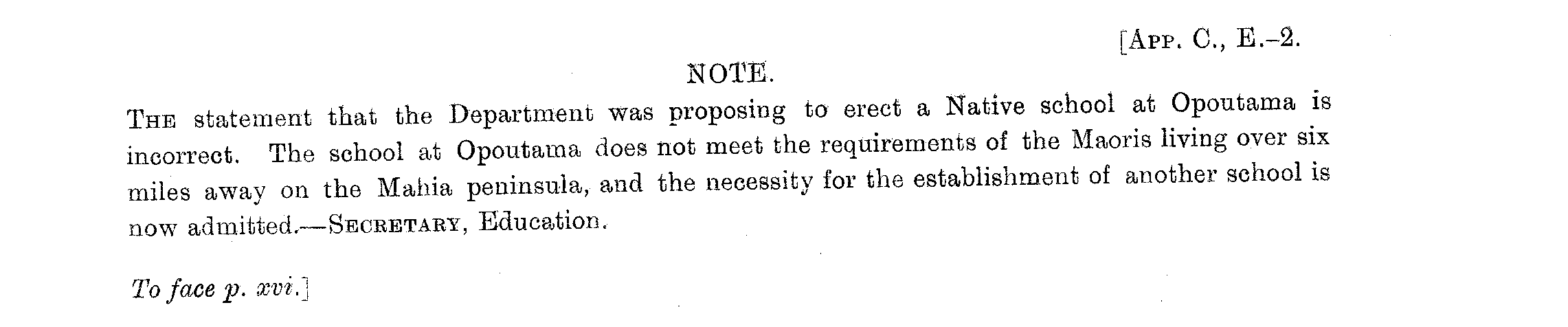 [App. C, E.-2. NOTE. The statement that the Department was proposing to erect a Native school at Opoutama is incorrect. The school at Opoutama does not meet the requirements of the Maoris living over six miles away on the Mahia peninsula, and the necessity for the establishment of another school 1S now admitted. —Secretary, Education. To face f. xvi.]