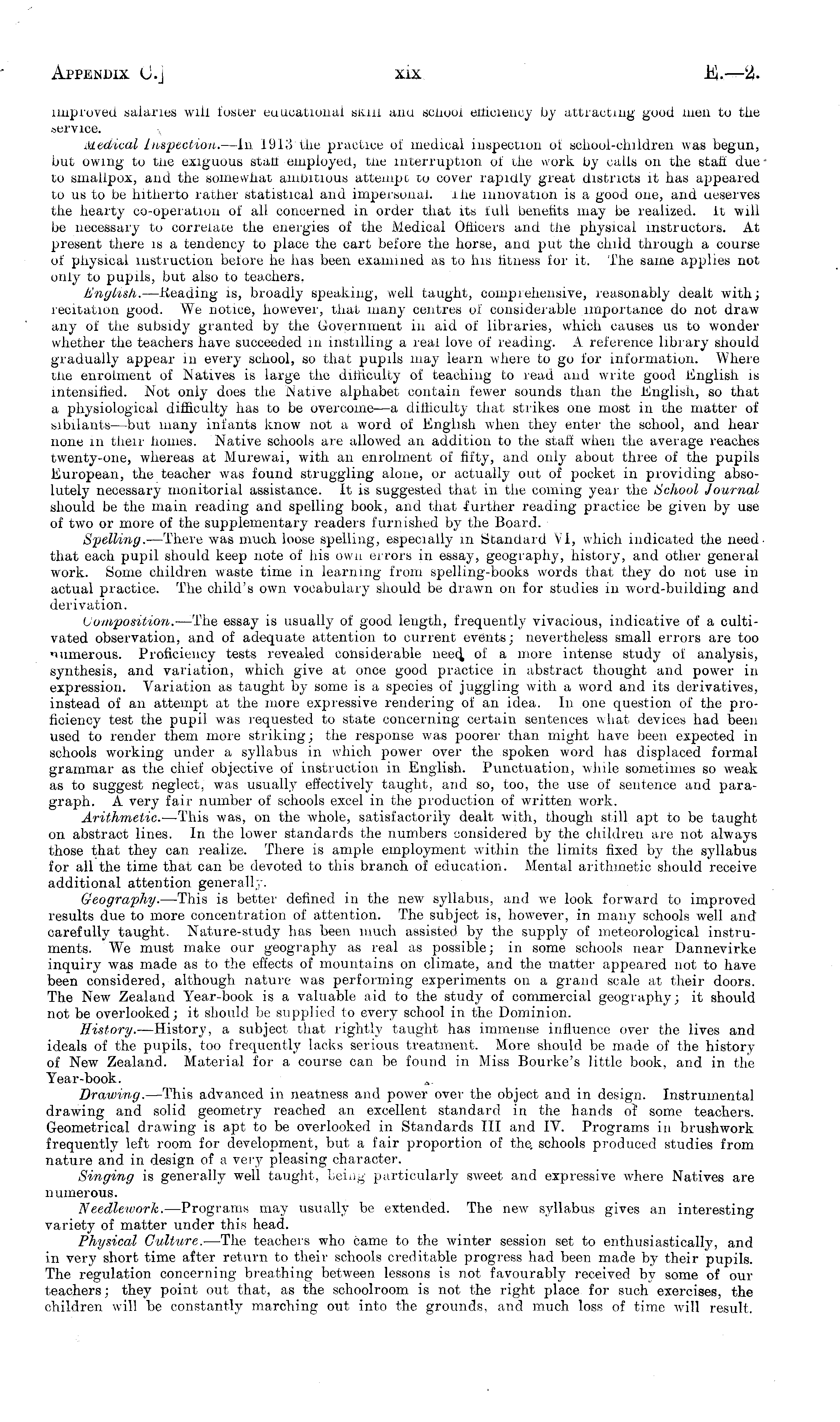 improved salaries will fosoer euuoatiouai sk.Hl ana school efficiency by attracting good men to the service. Medical Inspection. —ln 1913 the practice of medical inspection of school-children was begun, but owing to tiie exiguous staff employed, tne interruption of the work by calls on the staff due to smallpox, and the somewhat ambitious attempt to cover rapidly great districts it has appeared to us to be hitherto rather statistical and impersonal, lhe innovation is a good one, and ueserves the hearty co-operation of all concerned in order that its full benefits may be realized, ft will be necessary to correlate the energies of the Medical Officers and the physical instructors. At present there is a tendency to place the cart before the horse, and put the child through a course of physical instruction before he has been examined as to his fitness for it. The same applies not onfy to pupils, but also to teachers. English. —Heading is, broadly speaking, well taught, compieheiisive, reasonably dealt with; recitation good. We notice, however, that many centres of considerable importance do not draw any of the subsidy granted by the Government in aid of libraries, which causes us to wonder whether the teachers have succeeded in instilling a real love of reading. A reference library should gradually appear in every school, so that pupils may learn where to go for information. Where the enrolment of Natives is large the difficulty of teaching to read and write good English is intensified. Not only does the Native alphabet contain fewer sounds than the English, so that a physiological difficulty has to be overcome —a difficulty that strikes one most in the matter of sibilants —but many infants know not a word of English when they enter the school, and hear none 111 their homes. Native schools are allowed an addition to the staff when the average reaches twenty-one, whereas at Murewai, with an enrolment of fifty, and only about three of the pupils European, the teacher was found struggling alone, or actually out of pocket in providing absolutely necessary monitorial assistance. It is suggested that in the coming year the School Journal should be the main reading and spelling book, and that further reading practice be given by use of two or more of the supplementary readers furnished by the Board. Spelling. —There was much loose spelling, especially in Standard VI, which indicated the need that each pupil should keep note of his own errors in essay, geography, history, and other general work. Some children waste time in learning from spelling-books words that they do not use in actual practice. The child's own vocabulary should be drawn on for studies in word-building and derivation. Composition. —The essay is usually of good length, frequently vivacious, indicative of a cultivated observation, and of adequate attention to current events; nevertheless small errors are too numerous. Proficiency tests revealed considerable need, of a more intense study of analysis, synthesis, and variation, which give at once good practice in abstract thought and power in expression. Variation as taught by some is a species of juggling with a word and its derivatives, instead of an attempt at the more expressive rendering of an idea. In one question of the proficiency test the pupil was requested to state concerning certain sentences what devices had been used to render them more striking; the response was poorer than might have been expected in schools working under a syllabus in which power over the spoken word has displaced formal grammar as the chief objective of instruction in English. Punctuation, while sometimes so weak as to suggest neglect, was usually effectively taught, and so, too, the use of sentence and paragraph. A very fair number of schools excel in the production of written work. Arithmetic. —This was, on the whole, satisfactorily dealt with, though still apt to be taught on abstract lines. In the lower standards the numbers considered by the children are not always those that they can realize. There is ample employment within the limits fixed by the syllabus for all the time that can be devoted to this branch of education. Mental arithmetic should receive additional attention generally. Geography. —This is better defined in the new syllabus, and we look forward to improved results due to more concentration of attention. The subject is, however, in many schools well and carefully taught. Nature-study has been much assisted by the supply of meteorological instruments. We must make our geography as real as possible; in some schools near Dannevirke inquiry was made as to the effects of mountains on climate, and the matter appeared not to have been considered, although nature was performing experiments on a grand scale at their doors. The New Zealand Year-book is a valuable aid to the study of commercial geography; it should not be overlooked; it should be supplied to every school in the Dominion. History. —History, a subject that rightly taught has immense influence over the lives and ideals of the pupils, too frequently lacks serious treatment. More should be made of the history of New Zealand. Material for a course can be found in Miss Bourke's little book, and in the Year-book. Drawing. —This advanced in neatness and power over the object and in design. Instrumental drawing and solid geometry reached an excellent standard in the hands of some teachers. Geometrical drawing is apt to be overlooked in Standards 111 and IV. Programs in brushwork frequently left room for development, but a fair proportion of the, schools produced studies from nature and in design of a very pleasing character. Singing is generally well taught, being particularly sweet and expressive where Natives are numerous. Needle-work. —Programs may usually be extended. The new syllabus gives an interesting variety of matter under this head. Physical Culture. —The teachers who came to the winter session set t