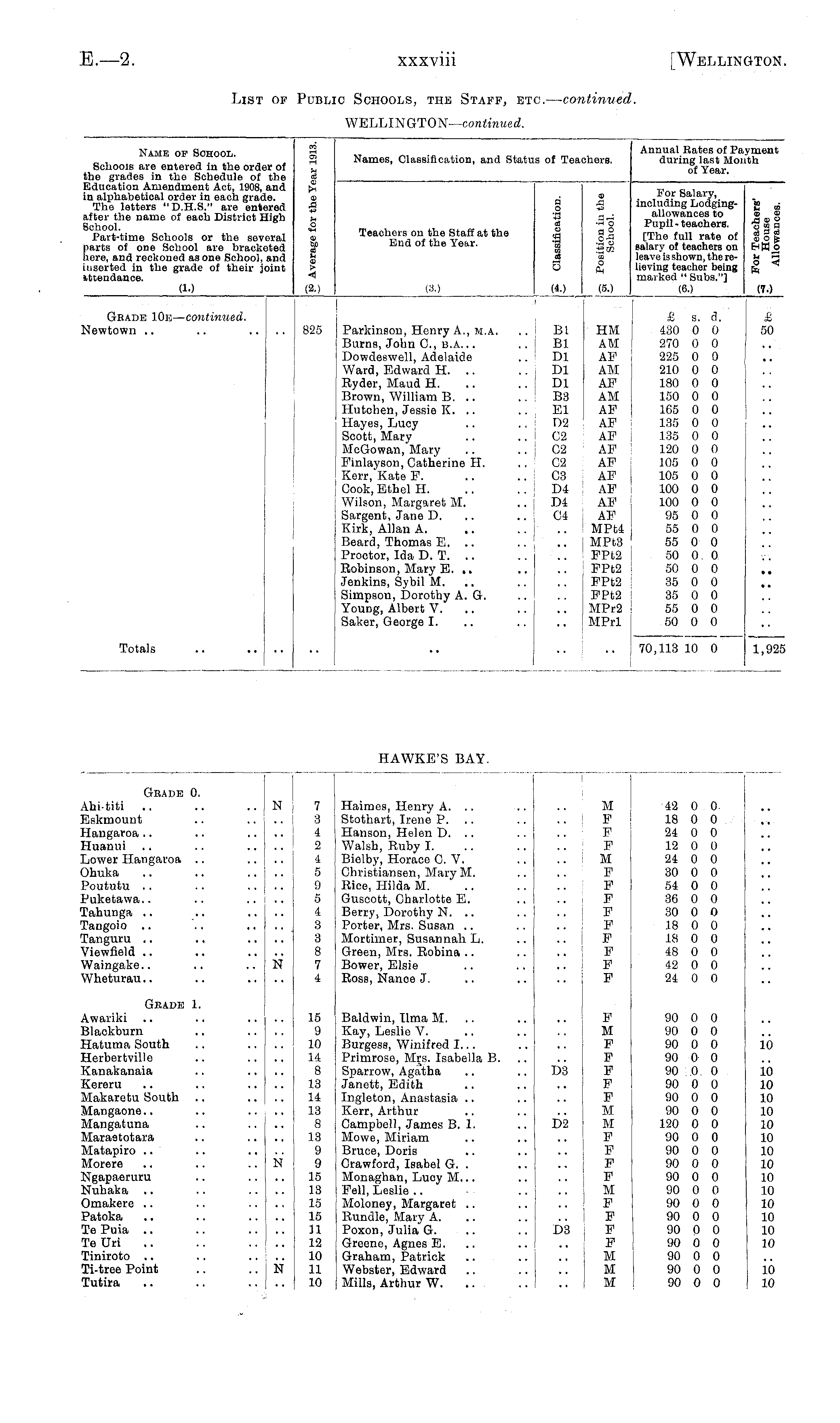 Name of School. Schools are entered in the ordei the grades in the Schedule of Education Amendment Act, 1908, £ in alphabetical order in each gradi The letters "D.H.S." are onte: after the name of each District H School. Part-time Schools or the seve parts of one School are bracke ciere, and reckoned as one School, * inserted in the grade of their jo attendance. !r of the and le. ared ligh so o> I u o I I (2.) Names, Classification, and Stat is of Tea: 1 O D jhers. d ° S For Salary, including Lodgingallowances to Pupil - teachers. [The full rate of salary of teachers on leave is shown, the relieving teacher being marked '* Subs."] (6.) Annual Bates of Pa; during last Moil of Year. yment ith Id - © a> <e a d <D O & EhWo I < eral 3ted and oint Teachers on the Staff at the End of the Year. (3.) (4.) (5.) (T.) (1.) Geadb 10e— continued. Newtown .. 825 Parkinson, Henry A., m.a. Burns, John 0., b.a. .. Dowdeswell, Adelaide Ward, Edward H. .. Ryder, Maud H. Brown, William B. .. Hutohen, Jessie K. .. Hayes, Lucy Scott, Mary McGowan, Mary Finlayson, Catherine H. Kerr, Kate F. Cook, Ethel H. Wilson, Margaret M. Sargent, Jane D. Kirk, Allan A. Beard, Thomas E. .. Proctor, Ida D. T. .. Robinson, Mary E. ,. Jenkins, Sybil M. .. Simpson, Dorothy A. G. Young, Albert V. Saker, George I. Bl HM Bl AM Dl AP Dl AM Dl AP B3 AM El AP D2 AP C2 : AP I C2 AP 02 AP 03 i AP D4 ! AP D4 AP C4 AP MPt4 MPt3 .. PPt2 PPt2 PPt2 PPt2 .. MPr2 ! .. MPrl £ s. d. 430 0 0 270 0 0 225 0 0 210 0 0 180 0 0 150 0 0 165 0 0 135 0 0 135 0 0 120 0 0 105 0 0 105 0 0 100 0 0 100 0 0 95 0 0 55 0 0 55 0 0 50 0, 0 50 0 0 35 0 0 35 0 0 55 0 0 50 0 0 £ 50 Totals 70,113 10 0 1,925