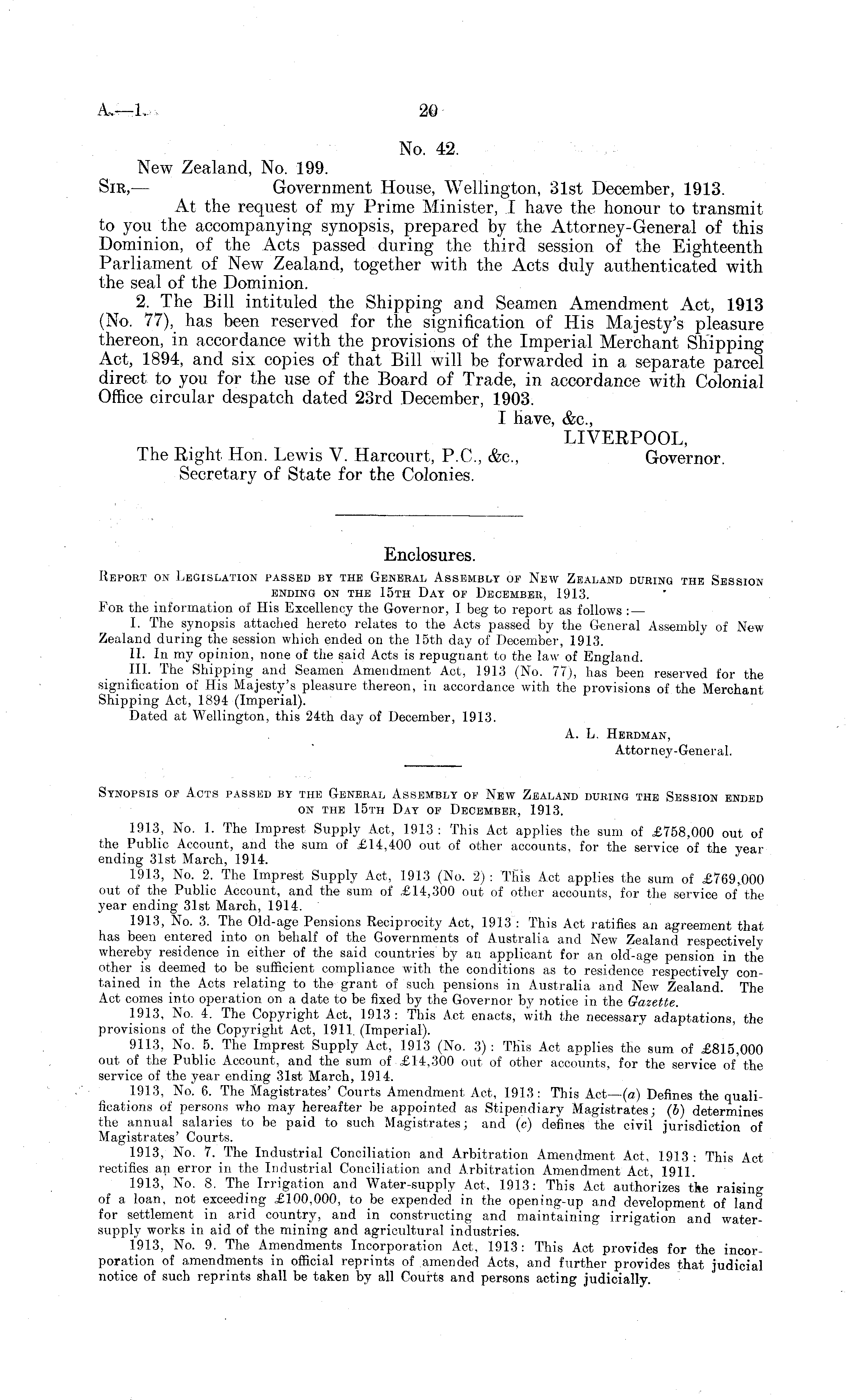 Enclosures. Report on Legislation passed by the General Assembly of New Zealand during the Sessionending on the 15th Day of December, 1913. For the information of His Excellency the Governor, I beg to report as follows : — I. The synopsis attached hereto relates to the Acts passed by the General Assembly of New Zealand during the session which ended on the 15th day of December, 1913. 11. In my opinion, none of the said Acts is repugnant to the law of England. 111. The Shipping and Seamen Amendment Act, 1913 (No. 77), has been reserved for the signification of His Majesty's pleasure thereon, in accordance with the provisions of the Merchant Shipping Act, 1894 (Imperial). Dated at Wellington, this 24th day of December, 1913. A. L. Herdman, Attorney-General. Synopsis of Acts passed by the General Assembly of New Zealand during the Session ended on the 15th Day of December, 1913. 1913, No. 1. The Imprest Supply Act, 1913 : This Act applies the sum of £758,000 out of the Public Account, and the sum of £14,400 out of other accounts, for the service of the year ending 31st March, 1914. 1913, No. 2. The Imprest Supply Act, 1913 (No. 2) : This Act applies the sum of £769,000 out of the Public Account, and the sum of £14,300 out of other accounts, for the service of the year ending 31st March, 1914. 1913, No. 3. The Old-age Pensions Reciprocity Act, 1913 : This Act ratifies an agreement that has been entered into on behalf of the Governments of Australia and New Zealand respectively whereby residence in either of the said countries by an applicant for an old-age pension in the other is deemed to be sufficient compliance with the conditions as to residerrce respectively contained in the Acts relating to the grant of such pensions in Australia and New Zealand. The Act comes into operation on a date to be fixed by the Governor by notice in the Gazette. 1913, No. 4. The Copyright Act, 1913 : This Act enacts, with the necessary adaptations, the provisions of the Copyright Act, 1911. (Imperial). 9113, No. 5. The Imprest Supply Act, 1913 (No. 3): This Act applies the sum of £815,000 out of the Public Account, and the sum of £14,300 out of other accounts, for the service of'the service of the year ending 31st March, 1914. 1913, No. 6. The Magistrates' Courts Amendment Act, 1913: This Act—(a) Defines the qualifications of persons who may hereafter be appointed as Stipendiary Magistrates; (b) determines the annual salaries to be paid to such Magistrates; and (c) defines the civil jurisdiction of Magistrates' Courts. 1913, No. 7. The Industrial Conciliation and Arbitration Amendment Act, 1913: This Act rectifies an error in the Industrial Conciliation and Arbitration Amendment Act, 1911. 1913, No. 8. The Irrigation and Water-supply Act, 1913: This Act authorizes the raising of a loan, not exceeding £100,000, to be expended in the opening-up and development of land for settlement in arid country, and in constructing and maintaining irrigation and watersupply works in aid of the mining and agricultural industries. 1913, No. 9. The Amendments Incorporation Act, 1913 : This Act provides for the incorporation of amendments in official reprints of amended Acts, and further provides that judicial notice of such reprints shall be taken by all Courts and persons acting judicially.
