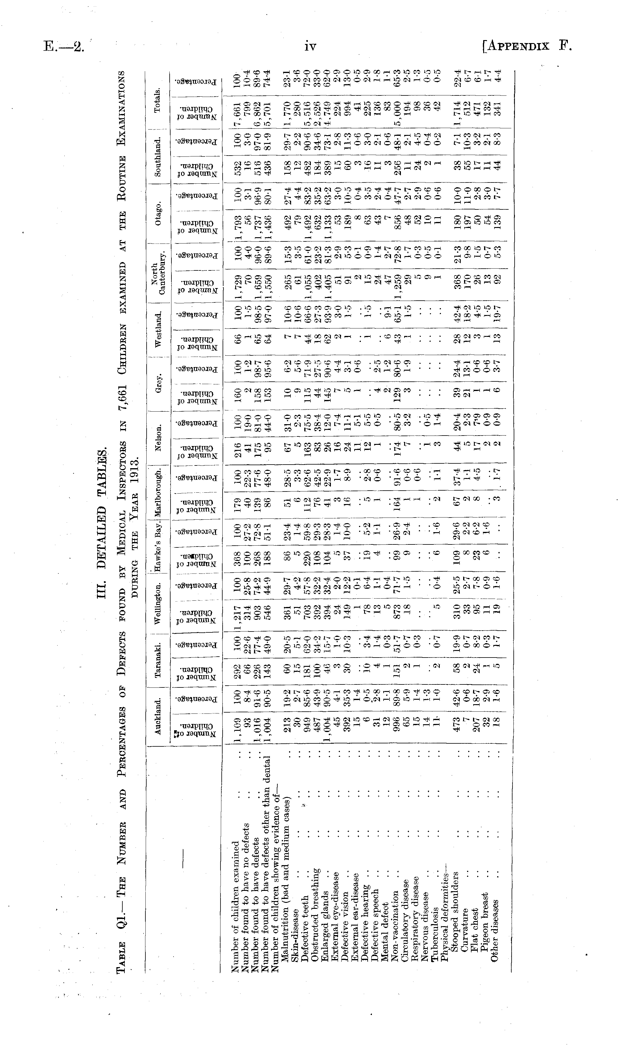 III. DETAILED TABLES. Table Q1.—The Number and Percentages of Defects found by Medical Inspectors in 7,661 Children examined at the Routine Examinations during the Year 1913.