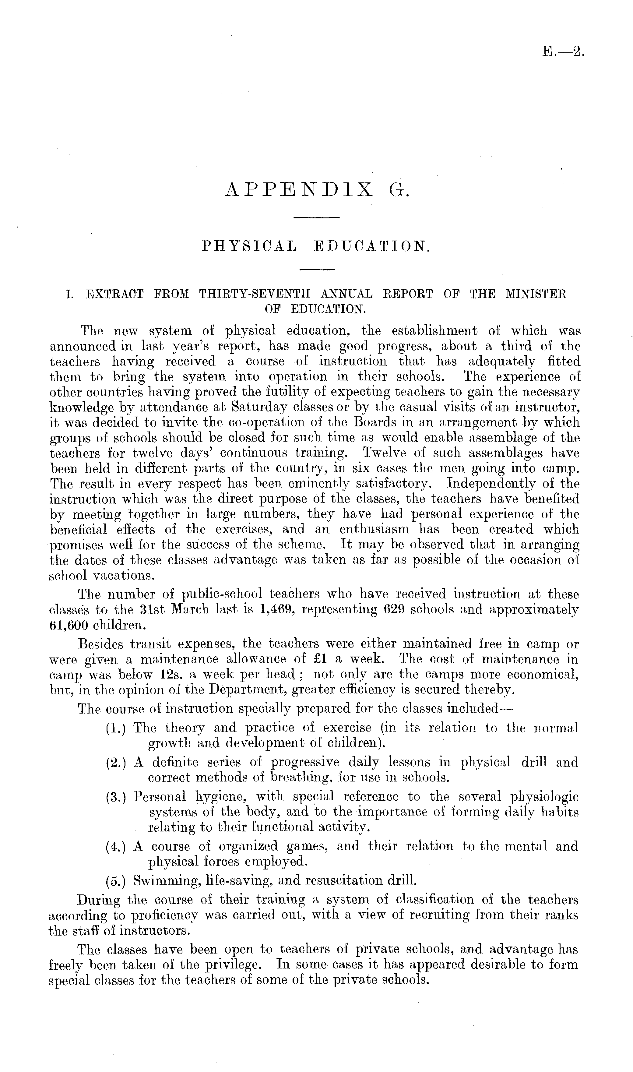 I. EXTRACT FROM THIRTY-SEVENTH ANNUAL REPORT OF THE MINISTER OF EDUCATION. The new system of physical education, the establishment of which was announced in last year's report, has made good progress, about a third of the teachers having received a course of instruction that has adequately fitted them to bring the system into operation in their schools. The experience of other countries having proved the futility of expecting teachers to gain the necessary knowledge by attendance at Saturday classes or by the casual visits of an instructor, it was decided to invite the co-operation of the Boards in an arrangement by which groups of schools should be closed for such time as would enable assemblage of the teachers for twelve days' continuous training. Twelve of such assemblages have been held in different parts of the country, in six cases the men going into camp. The result in every respect has been eminently satisfactory. Independently of the instruction which was the direct purpose of the classes, the teachers have benefited by meeting together in large numbers, they have had personal experience of the beneficial effects of the exercises, and an enthusiasm has been created which promises well for the success of the scheme. It may be observed that in arranging the dates of these classes advantage was taken as far as possible of the occasion of school vacations. The number of public-school teachers who have received instruction at these classes to the 31st March last is 1,469, representing 629 schools and approximately 61,600 children. Besides transit expenses, the teachers were either maintained free in camp or were given a maintenance allowance of £1 a week. The cost of maintenance in camp was below 12s. a week per head ; not only are the camps more economical, but, in the opinion of the Department, greater efficiency is secured thereby. The course of instruction specially prepared for the classes included— (1.) The theory and practice of exercise (in its relation to the normal growth and development of children). (2.) A definite series of progressive daily lessons in physical drill and correct methods of breathing, for use in schools. (3.) Personal hygiene, with special reference to the several physiologic systems of the body, and to the importance of forming daily habits relating to their functional activity. (4.) A course of organized games, and their relation to the mental and physical forces employed. (5.) Swimming, life-saving, and resuscitation drill. During the course of their training a system of classification of the teachers according to proficiency was carried out, with a view of recruiting from their ranks the staff of instructors. The classes have been open to teachers of private schools, and advantage has freely been taken of the privilege. In some cases it has appeared desirable to form special classes for the teachers of some of the private schools.