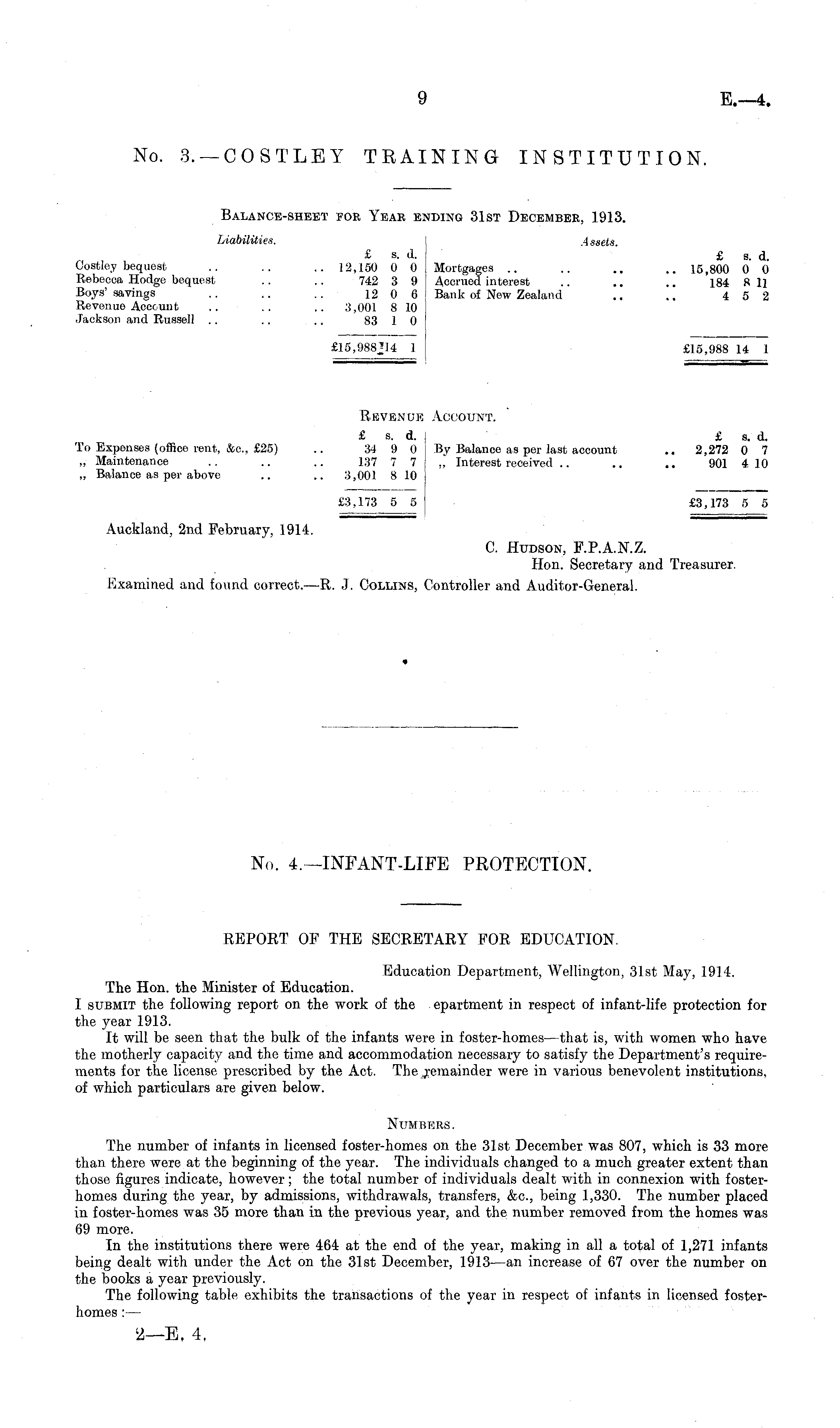 Balance-sheet for Year ending 31st December, 1913. Liabilities. 4 ssets. _. , £ s. d. £ s. d. Gostley bequest .. .. .. 12,150 0 0 Mortgages .. .. .. .. 15,800 0 0 Rebecca Hodge bequest .. .. 742 3 9 Accrued interest .. .. .. 184 811 Boys' savings .. .. .. 12 0 6 Bank of New Zealand .. .. 4 5 2 Revenue Account .. .. .. 3,001 810 Jackson and Russell .. .. .. 83 1 0 £15,988J14 1 £15,988 14 1 Rβvenue Account. £ s. d. 1 £ s. d. To Expenses (office rent, &c, £25) .. 34 9 0 By Balance as per last account .. 2,272 0 7 „ Maintenance .. .. .. 137 7 7 „ Interest received .. .. .. 901 410 „ Balance as per above .. .. 3,001 810 £3,173 5 5 £3,173 5 5 Auckland, 2nd February, 1914. C. Hudson, F.P.A.N.Z. Hon. Secretary and Treasurer. Examined and found correct.—R. J. Collins, Controller and Auditor-General.