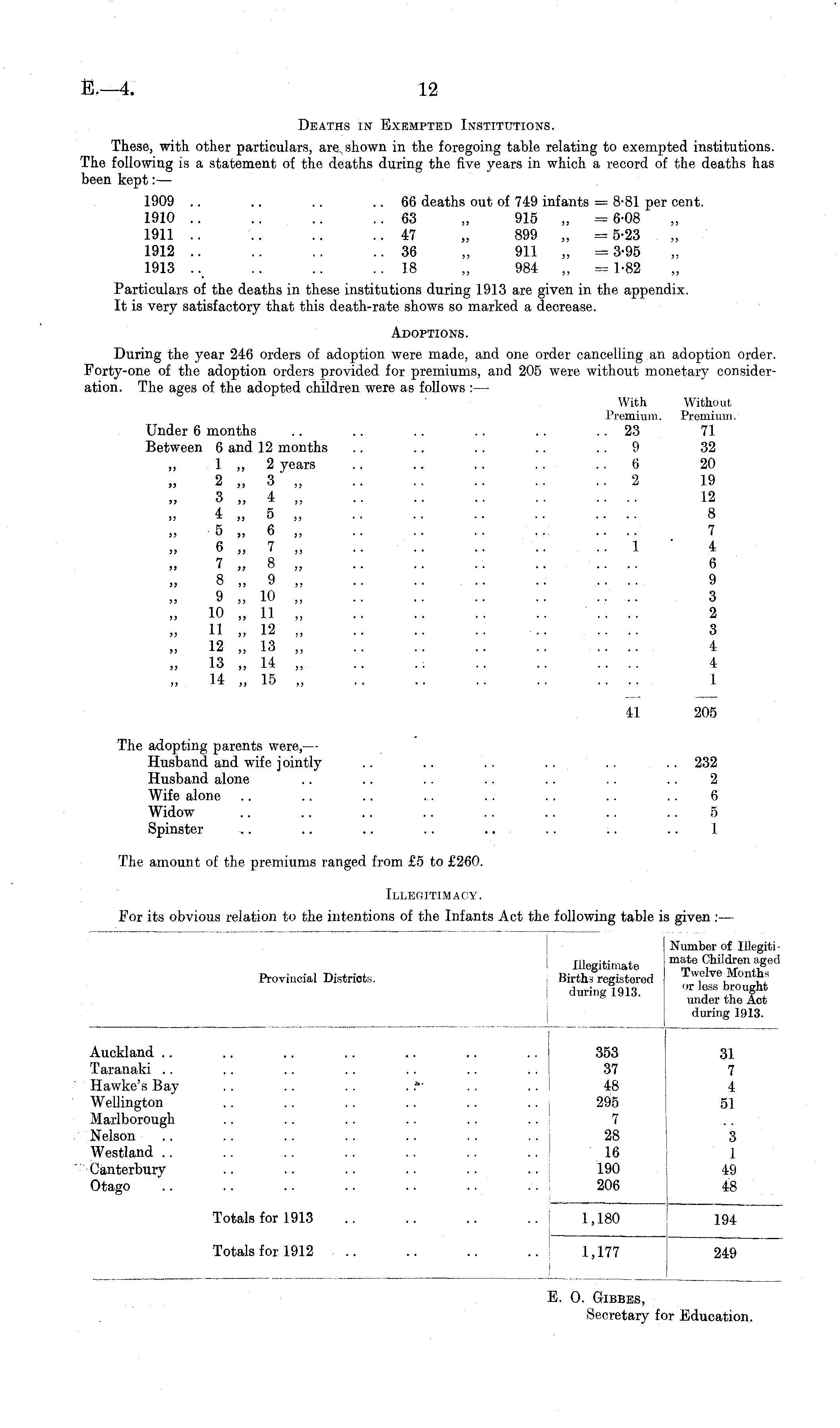 Deaths in Exempted Institutions. These, with other particulars, are shown in the foregoing table relating to exempted institutions. The following is a statement of the deaths during the five years in which a record of the deaths has been kept:— 1909 .. .. .. . . 66 deaths out of 749 infants = 8-81 per cent. 1910 .. .. .. ..63 „ 915 „ =6-08 1911 47 „ 899 „ =5-23 1912 36 „ 911 =3-95 1913 .. .. .. ..18 „ 984 ~ =1-82 Particulars of the deaths in these institutions during 1913 are given in the appendix. It is very satisfactory that this death-rate shows so marked a decrease. Adoptions. During the year 246 orders of adoption were made, and one order cancelling an adoption order. Forty-one of the adoption orders provided for premiums, and 205 were without monetary consideration. The ages of the adopted children were as follows : — With Without Premium. Premium. Under 6 months .. .. .. .. .. .. 23 71 Between 6 and 12 months .. .. .. .. .. 9 32 ~ 1 ~ 2 years .. .. .. .. .. 6 20 2 „ 3 „ 2 19 3 „ 4 „ 12 4= „ 5 „ 8 „5„ 6 „ 7 6 „ 7 „ .. 1 4 „ o „ .. . . .. . . .... b , 3 O jj U j, . . . . . . . . .... V 9 „ 10 „ /... 3 „ 10 „ 11 „ .... 2 „ 11 „ 12 , 3 12 „ 18 „ 4 13 „ 14 „ .. .: 4 14 „ 15 „ 1 41 205 The adopting parents were, — Husband and wife jointly .. .. .. .. .. .. 232 Husband alone .. .. .. .. .. .. .. 2 Wife alone .. .. .. .. . . . . .. .. 6 Widow .. .. .. .. .. .. .. .. 5 Spinster ~ .. .. .. .. .. .. .. 1 The amount of the premiums ranged from £5 to £260. Illegitimacy. For its obvious relation to the intentions of the Infants Act the following table is given : — Number of Illegiti - Illegitimate m^ te 1 Provincial Distrusts. Births registered J-wclve Months during 1913. or less brought 6 under the Act during 1913. Auckland .. .. .. .. .. .. .. 353 31 Taranaki .. .. .. .. .. .. .. 37 7 Hawke's Bay .. .. .. .*• .. .. 48 4 Wellington .. .. .. .. .. .. 295 51 Marlborough .. .. .. .. .. .. 7 Nelson .. .. .. .. .. .. ~ 28 3 Westland .. .. .. .. .. .. .. 16 1 Canterbury .. .. .. .. .. .. 190 49 Otago .. .. .. .. .. .. .. ; 206 48 Totals for 1913 .. .. .. .. 1,180 194 Totals for 1912 .. .. .. .. 1,177 249 E. 0. Gibbes, Secretary for Education.