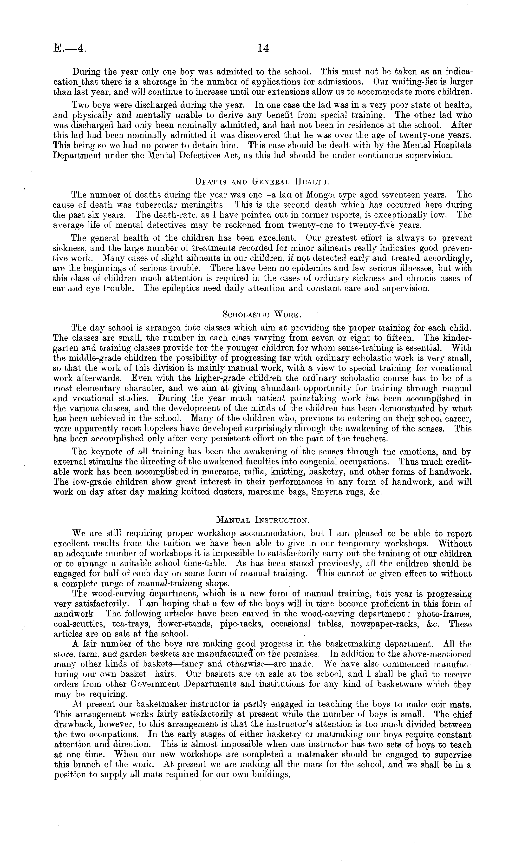During the year only one boy was admitted to the school. This must not be taken as an indicathere is a shortage in the number of applications for admissions. Our waiting-list is larger than last year, and will continue to increase until our extensions allow us to accommodate more children. Two boys were discharged during the year. In one case the lad was in a very poor state of health, and physically and mentally unable to derive any benefit from special training. The other lad who was discharged had only been nominally admitted, and had not been in residence at the school. After this lad had been nominally admitted it was discovered that he was over the age of twenty-one years. This being so we had no power to detain him. This case should be dealt with, by the Mental Hospitals Department under the Mental Defectives Act, as this lad should be under continuous supervision. Deaths and General Health. The number of deaths during the year was one —a lad of Mongol type aged seventeen years. The cause of death was tubercular meningitis. This is the second death which has occurred here during the past six years. The death-rate, as I have pointed out in former reports, is exceptionally low. The average life of mental defectives may be reckoned from twenty-one to twenty-five years. The general health of the children has been excellent. Our greatest effort is always to prevent sickness, and the large number of treatments recorded for minor ailments really indicates good preventive work. Many cases of slight ailments in our children, if not detected early and treated accordingly, are the beginnings of serious trouble. There have been no epidemics and few serious illnesses, but with this class of children much attention is required in the cases of ordinary sickness and chronic cases of ear and eye trouble. The epileptics need daily attention and constant care and supervision. Scholastic Work. The day school is arranged into classes which aim at providing the proper training for each child. The classes are small, the number in each class varying from seven or eight to fifteen. The kindergarten and training classes provide for the younger children for whom sense-training is essential. With the middle-grade children the possibility of progressing far with ordinary scholastic work is very small, so that the work of this division is mainly manual work, with a view to special training for vocational work afterwards. Even with the higher-grade children the ordinary scholastic course has to be of a most elementary character, and we aim at giving abundant opportunity for training through manual and vocational studies. During the year much patient painstaking work has been accomplished in the various classes, and the development of the minds of the children has been demonstrated by what has been achieved in the school. Many of the children who, previous to entering on their school career, were apparently most hopeless have developed surprisingly through the awakening of the senses. This has been accomplished only after very persistent effort on the part of the teachers. The keynote of all training has been the awakening of the senses through the emotions, and by external stimulus the directing of the awakened faculties into congenial occupations. Thus much creditable work has been accomplished in macrame, raffia, knitting, basketry, and other forms of handwork. The low-grade children show great interest in their performances in any form of handwork, and will work on day after day making knitted dusters, marcame bags, Smyrna rugs, &c. Manual Instruction. We are still requiring proper workshop accommodation, but I am pleased to be able to report excellent results from the tuition we have been able to give in our temporary workshops. Without an adequate number of workshops it is impossible to satisfactorily carry out the training of our children or to arrange a suitable school time-table. As has been stated previously, all the children should be engaged for half of each day on some form of manual training. This cannot be given effect to without a complete range of manual-training shops. The wood-carving department, which is a new form of manual training, this year is progressing very satisfactorily. lam hoping that a few of the boys will in time become proficient in this form of handwork. The following articles have been carved in the wood-carving department: photo-frames, coal-scuttles, tea-trays, flower-stands, pipe-racks, occasional tables, newspaper-racks, &c. These articles are on sale at the school. A fair number of the boys are making good progress in the basketmaking department. All the store, farm, and garden baskets are manufactured on the premises. In addition to the above-mentioned many other kinds of baskets —rfancy and otherwise —are made. We have also commenced manufacturing our own basket hairs. Our baskets are on sale at the school, and I shall be glad to receive orders from other Government Departments and institutions for any kind of basketware which they may be requiring. At present our basketmaker instructor is partly engaged in teaching the boys to make coir mats. This arrangement works fairly satisfactorily at present while the number of boys is small. The chief drawback, however, to this arrangement is that the instructor's attention is too much divided between the two occupations. In the early stages of either basketry or matmaking our boys require constant attention and direction. This is almost impossible when one instructor has two sets of boys to teach at one time. When our new workshops are completed a matmaker should be engaged to supervise this branch of the work. At present we are making all the mats for the school, and we shall be in a position to supply all mats required for our own buildings.