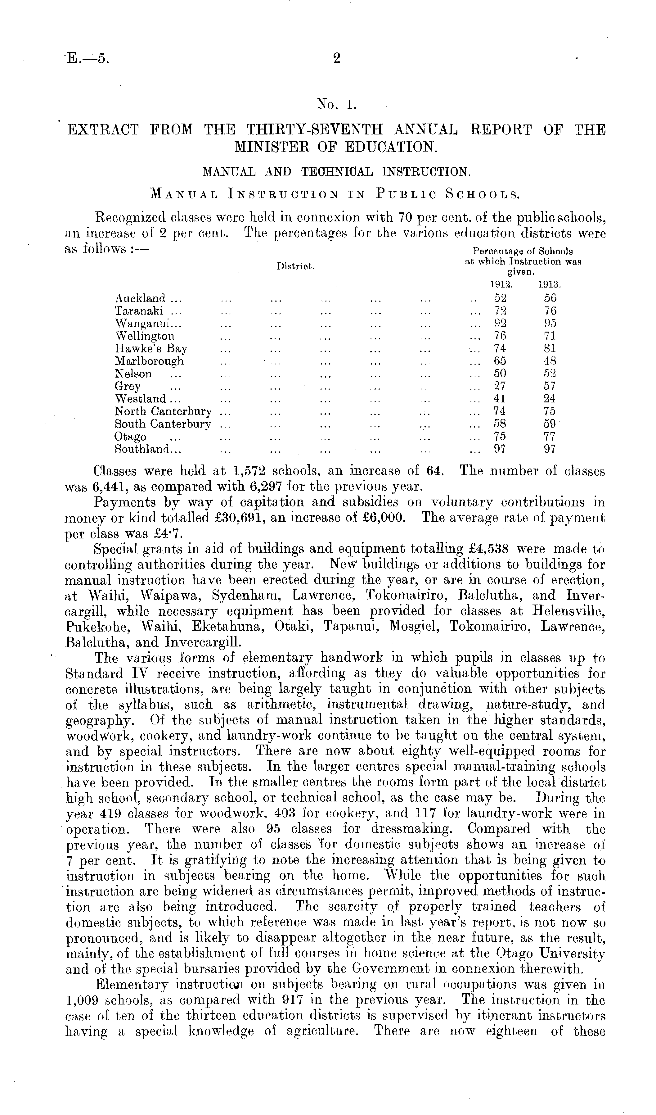 No. 1. EXTRACT FROM THE THIRTY-SEVENTH ANNUAL REPORT OF THE MINISTER OF EDUCATION. MANUAL AND TECHNICAL INSTRUCTION. Manual Instruction in Public Schools. Recognized classes were held in connexion with 70 per cent, of the public schools, an increase of 2 per cent. The percentages for the various education districts were as follows :— Percentage of Schools jy . ■ . at which Instruction was given. 1912. 1913. Auckland ... ... ... ... ... ... ..52 56 Taranaki ... ... ... ... ... ... ... 72 76 Wanganui... ... ... ... ... ... ... 92 95 Wellington ... ... ... ... ... ... 76 71 Hawke's Bay ... ... ... ... ... ... 74 81 Maryborough ... • ... ... ... ... ... 65 48 Nelson ... ... ... ... ... ... ... 50 52 Grey ... ... ... ... ... ... ... 27 57 Westland... ... ... ... ... ... ... 41 24 North Canterbury ... ... ... ... ... ... 74 75 South Canterbury ... ... ... ... ... ... 58 59 Otago ... ... 75 77 Southland... ... ... ... ... ... ... 97 97 Classes were held at 1,572 schools, an increase of 64. The number of classes was 6,441, as compared with 6,297 for the previous year. Payments by way of capitation and subsidies on voluntary contributions in money or kind totalled £30,691, an increase of £6,000. The average rate of payment per class was £4-7. Special grants in aid of buildings and equipment totalling £4,538 were made to controlling authorities during the year. New buildings or additions to buildings for manual instruction have been erected during the year, or are in course of erection, at Waihi, Waipawa, Sydenham, Lawrence, Tokomairiro, Balclutha, and Invercargill, while necessary equipment has been provided for classes at Helensville, Pukekohe, Waihi, Eketahuna, Otaki, Tapanui, Mosgiel, Tokomairiro, Lawrence, Balclutha, and Invercargill. The various forms of elementary handwork in which pupils in classes up to Standard IV receive instruction, affording as they do valuable opportunities for concrete illustrations, are being largely taught in conjunction with other subjects of the syllabus, such as arithmetic, instrumental drawing, nature-study, and geography. Of the subjects of manual instruction taken in the higher standards, woodwork, cookery, and laundry-work continue to be taught on the central system, and by special instructors. There are now about eighty well-equipped rooms for instruction in these subjects. In the larger centres special manual-training schools have been provided. In the smaller centres the rooms form part of the local district high school, secondary school, or technical school, as the case may be. During the year 419 classes for woodwork, 403 for cookery, and 117 for laundry-work were in operation. There were also 95 classes for dressmaking. Compared with the previous year, the number of classes for domestic subjects shows an increase of 7 per cent. It is gratifying to note the increasing attention that is being given to instruction in subjects bearing on the home. While the opportunities for such instruction are being widened as circumstances permit, improved methods of instruction are also being introduced. The scarcity of properly trained teachers of domestic subjects, to which reference was made in last year's report, is not now so pronounced, and is likely to disappear altogether in the near future, as the result, mainly, of the establishment of full courses in home science at the Otago University and of the special bursaries provided by the Government in connexion therewith. Elementary instruction on subjects bearing on rural occupations was given in 1,009 schools, as compared with 917 in the previous year. The instruction in the case of ten of the thirteen education districts is supervised by itinerant instructors having a special knowledge of agriculture. There are now eighteen of these