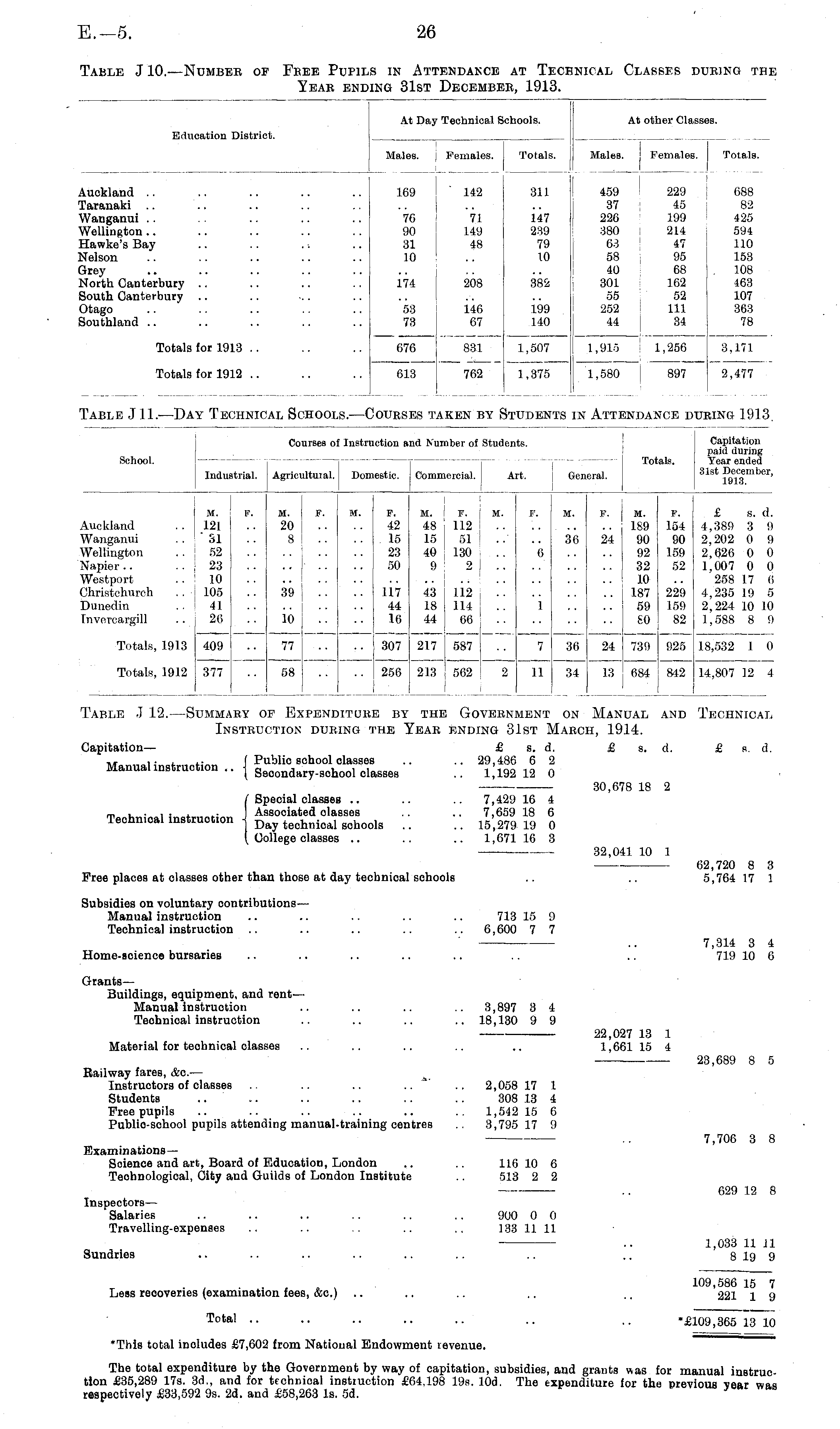 Table J 12.—Summary of Expenditure by the Government on Manual and Technical Instruction during the Year ending 31st March, 1914. Capitation— £ s. d. £ s. d. £ s. d. ~ ... .. f Public school olasses .. .. 29,486 6 2 Manual instruction .. j geoondary-school classes .. 1,192 12 0 30,678 18 2 / Special classes .. .. .. 7,429 16 4 t> v, ;™i i m »t.,.»i,j«» J Associated classes .. .. 7,659 18 6 Technical instruction j Day technical schoo]g 15,279 19 0 ( College classes .. .. .. 1,671 16 3 32,041 10 1 62,720 8 3 Free places at olasses other than those at day technical sohools .. .. 5,764 17 1 Subsidies on voluntary contributions— Manual instruction .. .. .. .. .. 713 15 9 Technical instruction .. .. .. .. .. 6,600 7 7 7,314 3 4 Home-soience bursaries .. .. .. .. .. .. .. 719 10 6 Grants — Buildings, equipment, and rentManual instruction .. .. .. .. 3,897 3 4 Teohnical instruction .. .. .. .. 18,130 9 9 22,027 13 1 Material for teohnical classes .. .. .. .. .. 1,661 15 4 23,689 8 5 Railway fares, &c. — Instructors of classes .. .. .. .. .. 2,058 17 1 Students .. .. .. .. .. .. 308 13 4 Free pupils .. .. .. .. .. .. 1,542 15 6 Publio-Bchool pupils attending manual-training centres .. 3,795 17 9 .. 7,706 3 8 ExaminationsScience and art, Board of Education, London .. .. 116 10 6 Technological, City and Guilds of London Institute .. 513 2 2 .. 629 12 8 Inspectors— Salaries .. .. .. .. .. .. 900 0 0 Travelling-expenses .. .. .. .. .. 133 11 11 .. 1,033 11 11 Sundries .. .. .. .. .. .. .. .. 8 19 9 109,586 15 7 Less recoveries (examination fees, &o.) .. .. .. .. ~ 221 1 9 Tota, •• •• ■• •• •• ■• .. "£109,365 13 10 "This total inoludes £7,602 from National Endowment revenue. The total expenditure by the Government by way of capitation, subsidies, and grants was for manual instruction £35,289 17s. 3d., and for technioal instiuction £64.198 19s. 10d. The expenditure for the previous year wag respectively £33,592 9s. 2d. and £58,263 Is. sd.