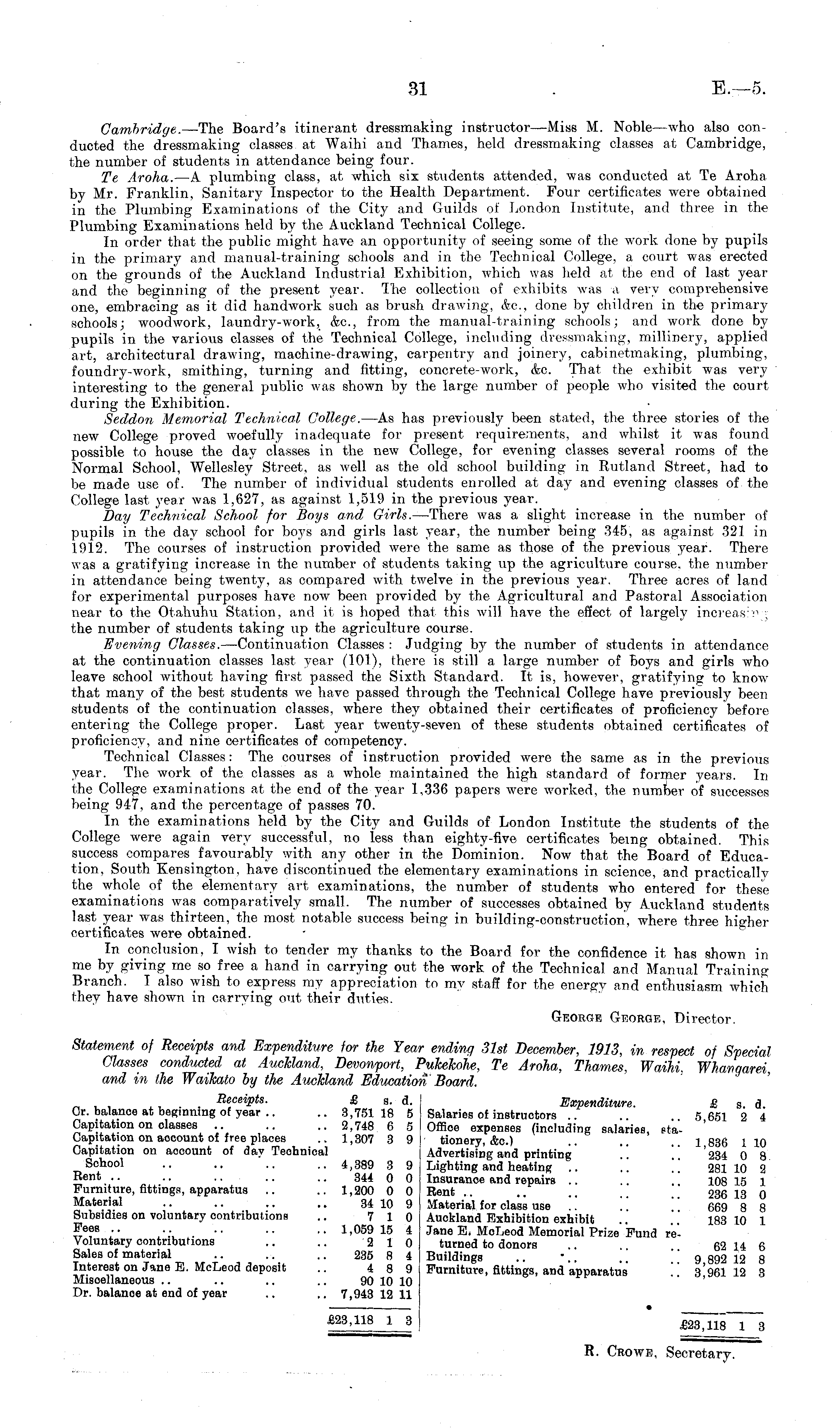 Cambridge. —The Board's itinerant dressmaking instructor—Miss M. Noble—who also conducted the dressmaking classes at Waihi and Thames, held dressmaking classes at Cambridge, the number of students in attendance being four. Te Aroha. —A plumbing class, at which six students attended, was conducted at Te Aroha by Mr. Franklin, Sanitary Inspector to the Health Department. Four certificates were obtained in the Plumbing Examinations of the City and Guilds of London Institute, and three in the Plumbing Examinations held by the Auckland Technical College. In order that the public might have an opportunity of seeing some of the work done by pupils in the primary and manual-training schools and in the Technical College, a court was erected on the grounds of the Auckland Industrial Exhibition, which was held at the end of last year and the beginning of the present year. The collection of exhibits was a very comprehensive one, embracing as it did handwork such as brush drawing, &c, done by children in the primary schools; woodwork, laundry-work, &c, from the manual-training schools; and work done by pupils in the various classes of the Technical College, including dressmaking, millinery, applied art, architectural drawing, machine-drawing, carpentry and joinery, cabinetmaking, plumbing, foundry-work, smithing, turning and fitting, concrete-work, &c. That the exhibit was very interesting to the general public was shown by the large number of people who visited the court during the Exhibition. Seddon Memorial Technical College. —As has previously been stated, the three stories of the new College proved woefully inadequate for present requirements, and whilst it was found possible to house the day classes in the new College, for evening classes several rooms of the Normal School, Wellesley Street, as well as the old school building in Rutland Street, had to be made use of. The number of individual students enrolled at day and evening classes of the College last year was 1,627, as against 1,519 in the previous year. Day Technical School for Boys and Girls. —There was a slight increase in the number of pupils in the day school for boys and girls last year, the number being 345, as against 321 in 1912. The courses of instruction provided were the same as those of the previous year. There was a gratifying increase in the number of students taking up the agriculture course, the number in attendance being twenty, as compared with twelve in the previous year. Three acres of land for experimental purposes have now been provided by the Agricultural and Pastoral Association near to the Otahuhu Station, and it is hoped that this will have the effect of largely increas : :> ; the number of students taking up the agriculture course. Evening Classes. —Continuation Classes : Judging by the number of students in attendance at the continuation classes last year (101), there is still a large number of Boys and girls who leave school without having first passed the Sixth Standard. It is, however, gratifying to know that many of the best students we have passed through the Technical College have previously been students of the continuation classes, where they obtained their certificates of proficiency before entering the College proper. Last year twenty-seven of these students obtained certificates of proficiency, and nine certificates of competency. Technical Classes: The courses of instruction provided were the same as in the previous year. The work of the classes as a whole maintained the high standard of former year's. In the College examinations at the end of the year 1,336 papers were worked, the number of successes being 947, and the percentage of passes 70. In the examinations held by the City and Guilds of London Institute the students of the College were again very successful, no less than eighty-five certificates being obtained. This success compares favourably with any other in the Dominion. Now that the Board of Education, South Kensington, have discontinued the elementary examinations in science, and practically the whole of the elementary art examinations, the number of students who entered for these examinations was comparatively small. The number of successes obtained by Auckland students last year was thirteen, the most notable success being in building-construction, where three higher certificates were obtained. In conclusion, I wish to tender my thanks to the Board for the confidence it has shown in me by giving me so free a hand in carrying out the work of the Technical and Manual Training Branch. I also wish to express my appreciation to my staff for the energy and enthusiasm which they have shown in carrying out their duties. George George, Director. Statement of Receipts and Expenditure for the Year ending 31st December, 1913, in respect of Special Classes conducted at Auckland, Devonport, Pukehohe, Te Aroha, Thames, Waihi. Whavqarei, and in the Waihato by the Auckland Education Board. - . . ~ . . Recei Pts- £ s. a. Expenditure. £ s. d. Cr. balance at beginning of year .. .. 3,75118 5 Salaries of instructors .. 5 651 2 4 Capitation on olasses .. .. .. 2,748 6 5 Office expenses (including salaries, etaCapitation on account of free places .. 1,307 3 9 tionery, &c.) .. .. 1 836 110 Capitation on account of day Teohnical Advertising and printing .. '.' 234 0 8 School .. .. .. .. 4,389 3 9 Lighting and heating .. .. " 281 10 2 Rent • • • ■ • • • • • • 344 0 0 Insurance and repairs .. . 108 15 1 Furniture, fittings, apparatus .. .. 1,200 0 0 Rent .. .. .. 236 13 0 Material .. .. .. .. 34 10 9 Material for class use '.'. " " 669 8 8 Subsidies on voluntary contributions .. 7 10 Auckland Exhibition exhibit 183 10 1 £ ees •• •• •■ •• .. 1,059 15 4 Jane E, MoLeoa Memorial Prize Fund re'Voluntary contributions .. .. 2 10 turned to donors .. 62 14 6 Sales of material .. .. .. 235 8 4 BuiMings .. •.. 9 892 12 8 Interest on Jane E. McLeoa deposit .. 48 9 Fu