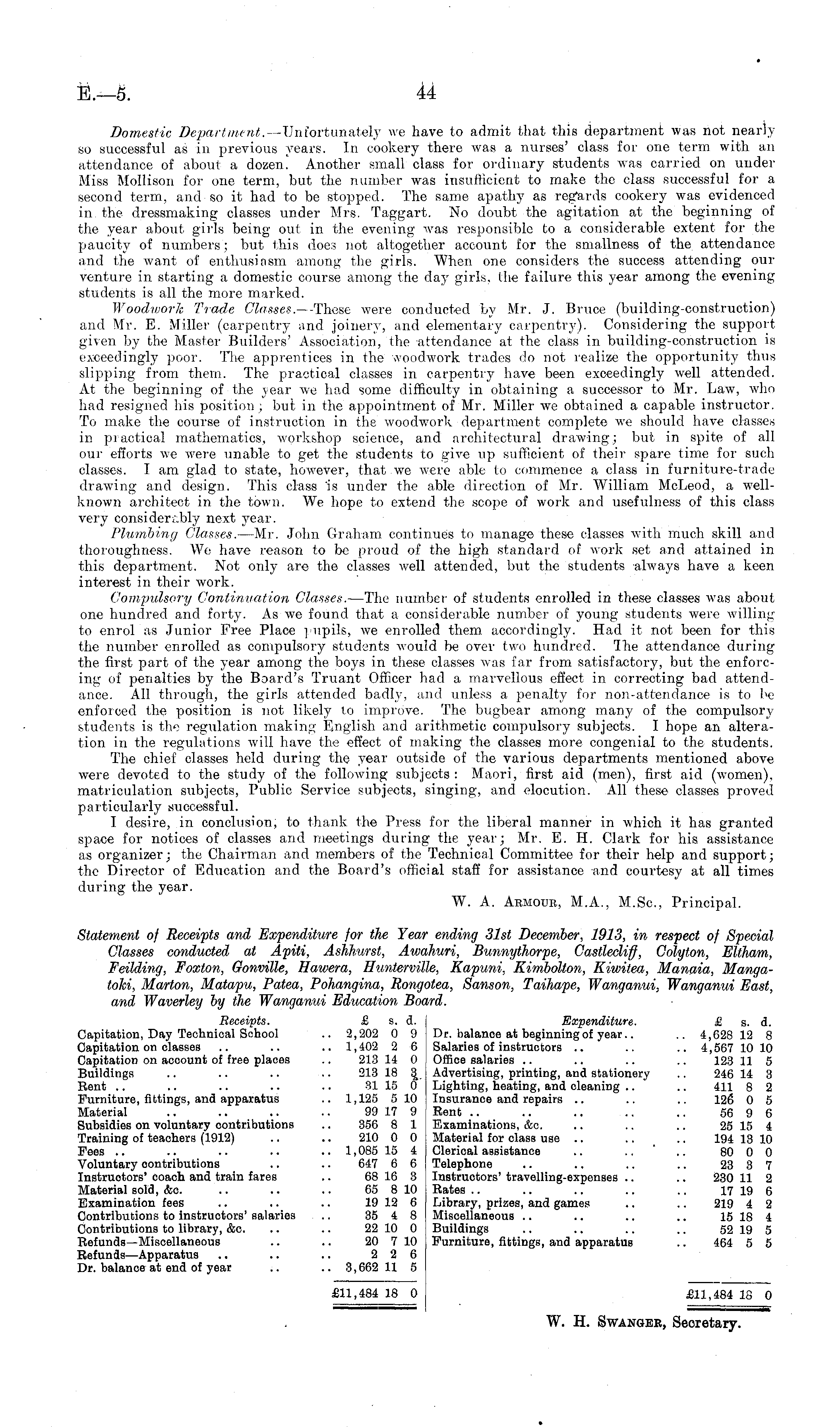 Domestic Department. —Unfortunately we have to admit that this department was not nearly so successful as in previous years. In cookery there was a nurses' class for one term with an attendance of about a dozen. Another small class for ordinary students was carried on under Miss Mollison for one term, but the number was insufficient to make the class successful for a second term, and so it had to be stopped. The same apathy as regards cookery was evidenced in the dressmaking classes under Mrs. Taggart. No doubt the agitation at the beginning of the year about girls being out in the evening was responsible to a considerable extent for the paucity of numbers; but this does not altogether account for the smallness of the attendance and the want of enthusiasm among the girls. When one considers the success attending our venture in starting a domestic course among the day girls, the failure this year among the evening students is all the more marked. Woodwork Trade Glasses. —These were conducted by Mr. J. Bruce (building-construction) and Mr. E. Miller (carpentry and joinery, and elementary carpentry). Considering the support given by the Master Builders' Association, the attendance at the class in building-construction is exceedingly poor. The apprentices in the woodwork trades do not realize the opportunitj? thus slipping from them. The practical classes in carpentry have been exceedingly well attended. At the beginning of the year we had some difficulty in obtaining a successor to Mr. Law, who had resigned his position ; but in the appointment of Mr. Miller we obtained a capable instructor. To make the course of instruction in the woodwork department complete we should have classes in practical mathematics, workshop science, and architectural drawing; but in spite of all our efforts we were unable to get the students to give up sufficient of their spare time for such classes. I am glad to state, however, that we were able to commence a class in furniture-trade drawing and design. This class 'is under the able direction of Mr. William McLeod, a wellknown architect in the town. We hope to extend the scope of work and usefulness of this class very considerably next year. Plumbing Classes. —Mr. John Graham continues to manage these classes with much skill and thoroughness. We have reason to be proud of the high standard of work set and attained in this department. Not only are the classes well attended, but the students always have a keen interest in their work. Compulsory Continuation Classes. —The number of students enrolled in these classes was about one hundred and forty. As we found that a considerable number of young students were willing to enrol as Junior Free Place pupils, we enrolled them, accordingly. Had it not been for this the number enrolled as compulsory students would be over two hundred. The attendance during the first part of the year among the boys in these classes was far from satisfactory, but the enforcing of penalties by the Board's Truant Officer had a marvellous effect in correcting bad attendance. All through, the girls attended badly, and unless a penalty for non-attendance is to be enforced the position is not likely to improve. The bugbear among man}' of the compulsory students is the regulation making English and arithmetic compulsory subjects. I hope an alteration in the regulations will have the effect of making the classes more congenial to the students. The chief classes held during the year outside of the various departments mentioned above were devoted to the study of the following subjects : Maori, first aid (men), first aid (women), matriculation subjects, Public Service subjects, singing, and elocution. All these classes proved particularly successful. I desire, in conclusion, to thank the Press for the liberal manner in which it has granted space for notices of classes and meetings during the year; Mr. E. H. Clark for his assistance as organizer; the Chairman and members of the Technical Committee for their help and support; the Director of Education and the Board's official staff for assistance and courtesy at all times during the year. W. A. Armour, M.A., M.Sc, Principal. Statement of Receipts and Expenditure for the Year ending 31st December, 1913, in respect of Special Classes conducted at Apiti, Ashhurst, Awahuri, Bunnythorpe, Castlecliff, Colyton, Eliham, Feilding, Foxton, Gonville, Hawera, Hunterville, Kapuni, Kimbolton, Kiwitea, Manaia, Mangatoki, Marton, Matapu, Patea, Pohangina, Rongotea, Sanson, Taihape, Wanganui, Wanganui East, and Waverley by the Wanganui Education Board. Receipts. £ s. d. Expenditure. £ s. d. Capitation, Day Technical School .. 2,202 0 9 Dr. balanoe at beginning of year.. .. 4,628 12 8 Capitation on classes .. .. .. 1,402 2 6 Salaries of instructors .. .. .. 4,567 10 10 Capitation on account of free places .. 213 14 0 Office salaries .. .. .. .. 123 11 5 Buildings .. .. .. .. 213 18 Advertising, printing, and stationery .. 246 14 3 Bent .. .. .. .. .. 31 15 0 Lighting, heating, and cleaning .. .. 411 8 2 Furniture, fittings, and apparatus .. 1,125 510 Insurance and repairs .. .. .. 126 0 5 Material .. .. .. .. 99 17 9 Rent .. .. .. .. .. 56 9 6 Subsidies on voluntary contributions .. 356 8 1 Examinations, &c. .. .. .. 25 15 4 Training of teachers (1912) .. .. 210 0 0 Material for class use .. .. .. 194 13 10 Fees .. .. .. .. .. 1,085 15 4 Clerical assistance .. .. .. 80 0 0 Voluntary contributions .. .. 647 6 6 Telephone .. .. .. .. 23 3 7 Instructors' coach and train fares .. 68 16 3 Instructors' travelling-expenses .. .. 230 11 2 Material sold, &c. .. .. .. 65 810 Rates .. .. .. .. .. 17 19 6 Examination fees .. .. .. 19 12 6 Library, prizes, and games .. .. 219 4 2 Contributions to instructors' salaries .. 35 4 8 Miscellaneous .. .. .. .. 15 18 4 Contributions to library, &c. .. .. 22 10 0 Buildings .. .. .. 52 19 5 Refunds—Miscellaneous .. .. 20 7 10 Furniture, fittings, and apparatus .. 464 5 5 Refunds —