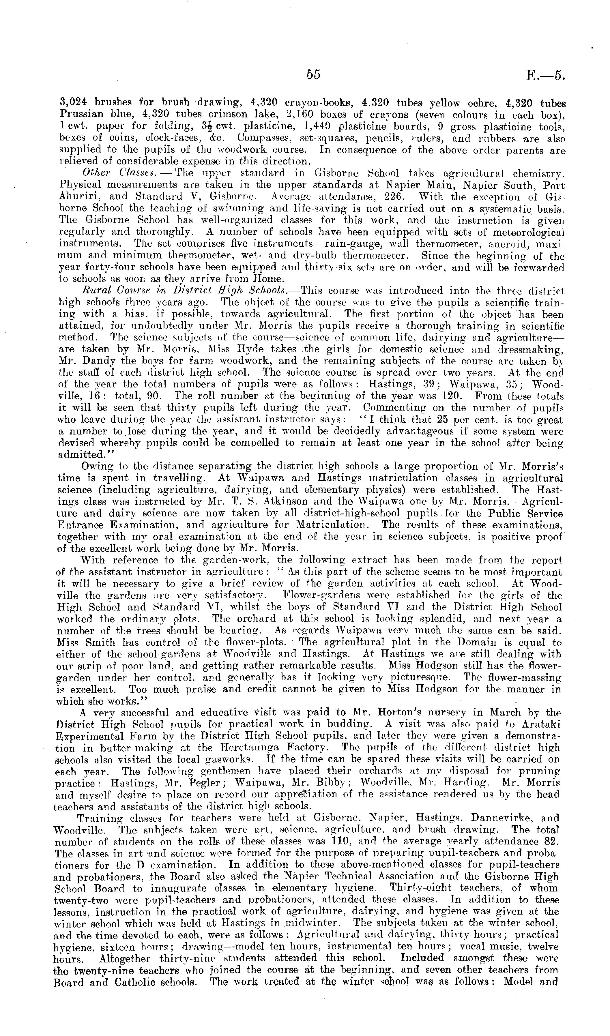 3,024 brushes for brush drawing, 4,320 crayon-books, 4,320 tubes yellow ochre, 4,320 tubes Prussian blue, 4,320 tubes crimson lake, 2,160 boxes of crayons (seven colours in each box), 1 cwt. paper for folding, 3£ cwt. plasticine, 1,440 plasticine boards, 9 gross plasticine tools, bcxes of coins, clock-faces, &o. Compasses, set-squares, pencils, rulers, and rubbers are also supplied to the pupils of the woodwork course. In consequence of the above order parents are relieved of considerable expense in this direction. Other Classes. — The upper standard in Gisborne School takes agricultural chemistry. Physical measurements are taken in the upper standards at Napier Main, Napier South, Port Ahuriri, and Standard V, Gisborne. Average attendance, 226. With the exception of Gisborne School the teaching of swimming and life-saving is not carried out on a systematic basis. The Gisborne School has well-organized classes for this work, and the instruction is given regularly and thoroughly. A number of schools have been equipped with sets of meteorological instruments. The set comprises five instruments —rain-gauge, wall thermometer, aneroid, maximum and minimum thermometer, wet- and dry-bulb thermometer. Since the beginning of the year forty-four schools have been equipped and thirty-six sets are on order, and will be forwarded to schools as soon as they arrive from Home. Rural Course in District High Schools. —This course was introduced into the three district high schools three years ago. The object of the course was to give the pupils a scientific training with a bias, if possible, towards agricultural. The first portion of the object has been attained, for undoubtedly under Mr. Morris the pupils receive a thorough training in scientific method. The science subjects of the course —science of common life, dairying and agriculture — are taken by Mr. Morris, Miss Hyde takes the girls for domestic science and dressmaking, Mr. Dandy the boys for farm woodwork, and the remaining subjects of the course are taken by the staff of each district high school. The science course is spread over two years. At the end of the year the total numbers of pupils were as follows: Hastings, 39; Waipawa, 35; Woodville, 16 : total, 90. The roll number at the beginning of the year was 120. From these totals it will be seen that thirty pupils left during the year. Commenting on the number of pupils who leave during the year the assistant instructor says: " I think that 25 per cent, is too great a number to lose during the year, and it would be decidedly advantageous if some system were devised whereby pupils could be compelled to remain at least one year in the school after being admitted." Owing to the distance separating the district high schools a large proportion of Mr. Morris's time is spent in travelling. At Waipawa and Hastings matriculation classes in agricultural science (including agriculture, dairying, and elementary physics) were established. The Hastings class was instructed by Mr. T. S. Atkinson and the Waipawa one by Mr. Morris. Agriculture and dairy science are now taken by all district-high-school pupils for the Public Service Entrance Examination, and agriculture for Matriculation. The results of these examinations, together with my oral examination at the end of the year in science subjects, is positive proof of the excellent work being done by Mr. Morris. With reference to the garden-work, the following extract , has been made from the report of the assistant instructor in agriculture : " As this part of the scheme seems to be most important it will be necessary to give a brief review of the garden activities at each school. At Woodville the gardens are very satisfactory. Flower-gardens were established for the girls of the High School and Standard VI, whilst the boys of Standard VI and the District High School worked the ordinary plots. The orchard at this school is looking splendid, and next year a number of the trees should be bearing. As regards Waipawa very much the same can be said. Miss Smith has control of the flower-plots. The agricultural plot in the Domain is equal to either of the school-gardens at Woodville and Hastings. At Hastings we are still dealing with our strip of poor land, and getting rather remarkable results. Miss Hodgson still has the flowergarden under her control, and generally has it looking very picturesque. The flower-massing is! excellent. Too much praise and credit cannot be given to Miss Hodgson for the manner in which she works." A very successful and educative visit was paid to Mr. Horton's nursery in March by the District High School pupils for practical work in budding. A visit was also paid to Arataki Experimental Farm by the District High School pupils, and later they were given a demonstration in butter-making at the Heretaunga Factory. The pupils of the different district high schools also visited the local gasworks. If the time can be spared these visits will be carried on each year. The following gentlemen have placed their orchards at my disposal for pruning practice: Hastings, Mr. Pegler; Waipawa, Mr. Bibby; Mr. Harding. Mr. Morris and myself desire to place on record our appreciation of the assistance rendered us by the head teachers and assistants of the district high schools. Training classes for teachers were held at Gisborne, Napier, Hastings, Dannevirke, and Woodville. The subjects taken were art, science, agriculture, and brush drawing. The total number of students on the rolls of these classes was 110, and the average yearly attendance 82. The classes in art and science were formed for the purpose of preparing pupil-teachers and probationers for the D examination. In addition to these above-mentioned classes for pupil-teachers and probationers, the Board also asked the Napier Technical Association and the Gisborne High School Board to inaugurate classes in elementary hygiene. Thirty-eight teachers, of whom twenty-two were pupil-teachers an