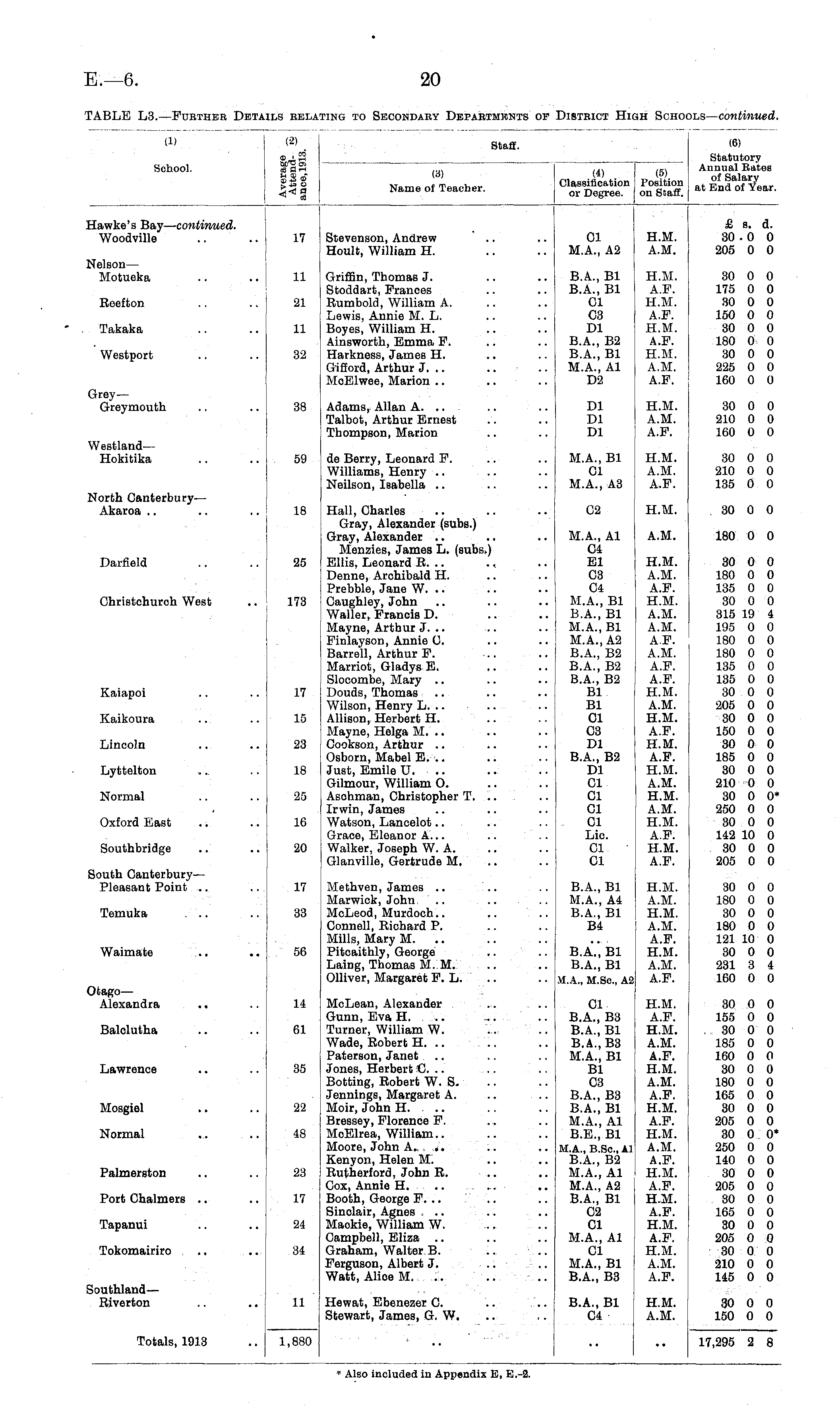 (1) (2) Staff. (6) Statutory Annual Bates of Salary at End of Year. School. (4) (5) Classification Position or Degree, on Staff. (3) Name of Teacher. Hawke's Bay— continued. Woodville 17 Stevenson, Andrew Hoult, William H. 01 M.A., A2 H.M. A.M. £ s. d. 30.0 0 205 0 0 Nelson — Motueka 11 Griffin, Thomas J. Stoddart, Frances Rumbold, William A. Lewis, Annie M. L. Boyes, William H. Ainsworth, Emma F. Harkness, James H. Gifiord, Arthur 3. .. McElwee, Marion B.A., Bl B.A., Bl CI C3 Dl B.A., B2 B.A., Bl M.A., Al D2 H.M. A.F. H.M. A.F. H.M. A.F. H.M. A.M. A.F. 30 0 0 175 0 0 30 0 0 150 0 0 30 0 0 180 0 0 30 0 0 225 0 0 160 0 0 Reef ton 21 Takaka 11 Westport 32 Grey— Greymouth 38 Adams, Allan A. .. Talbot, Arthur Ernest Thompson, Marion Dl Dl Dl H.M. A.M. A.F. 30 0 0 210 0 0 160 0 0 Westland — Hokitika 59 de Berry, Leonard F. Williams, Henry .. Neilson, Isabella .. M.A..B1 01 M.A., A3 H.M. A.M. A.F. 30 0 0 210 0 0 135 0 0 North Canterbury— Akaroa 18 Hall, Charles Gray, Alexander (subs.) Gray, Alexander .. Menzies, James L. (subs.) Ellis, Leonard R. .. Denne, Arohibald H. Prebble, Jane W. .. Caughley, John Waller, Francis D. Mayne, Arthur J. .. Finlayson, Annie C. Barrell, Arthur F. Marriot, Gladys E. Slocombe, Mary Douds, Thomas Wilson, Henry L. .. Allison, Herbert H. Mayne, Helga M. .. Cookson, Arthur Osborn, Mabel E. .. Just, Emile U. .. Gilmour, William O. Aschman, Christopher T. .. Irwin, James Watson, Lancelot Grace, Eleanor A... Walker, Joseph W. A. Glanville, Gertrude M. 02 H.M. 30 0 0 M.A., Al 04 El C3 C4 M.A., Bl B.A., Bl M.A., Bl M.A..A2 B.A., B2 B.A., B2 B.A., B2 Bl Bl 01 03 Dl B.A., B2 Dl 01 01 CI 01 Lie 01. ' 01 A.M. 180 0 0 Darfield 25 H.M. A.M. A.F. H.M. A.M. A.M. A.F. A.M. A.F. A.F. H.M. A.M. H.M. A.F. H.M. A.F. H.M. A.M. H.M. A.M. H.M. A.F. H.M. A.F. 30 0 0 180 0 0 135 0 0 30 0 0 315 19 4 195 0 0 180 0 0 180 0 0 135 0 0 135 0 0 30 0 0 205 0 0 30 0 0 150 0 0 30 0 0 185 0 0 30 0 0 210 0 0 30 0 0' 250 0 0 30 0 0 142 10 0 30 0 0 205 0 0 Christohurch West 173 Kaiapoi 17 Kaikoura 15 Lincoln 23 Lyttelton 18 Normal 25 Oxford East 16 Southbridge 20 South Canterbury— Pleasant Point .. 17 Methven, James .. .. Marwick, John .. .. McLeod, Murdoch.. Connell, Richard P. Mills, Mary M. .. Pitcaithly, George Laing, Thomas M..M. OUiver, Margaret F. L. B.A., Bl M.A., A4 B.A., Bl B4 H.M. A.M. H.M. A.M. A.F. H.M. A.M. A.F. 30 0 0 180 0 0 30 0 0 180 0 0 121 10 0 30 0 0 231 3 4 160 0 0 Temuka . .. 33 Waimate 56 B.aV, Bl B.A., Bl M.A., M.Sc, A2 Otago— Alexandra .. 14 01 B.A., B3 B.A., Bl B.A., B3 M.A., Bl Bl C3 B.A., B3 B.A., Bl M.A., Al B.E., Bl M.A., B.Sc, Al B.A., B2 M.A., Al M.A., A2 B.A., Bl C2 01 M.A., Al CI M.A., Bl B.A., B3 H.M. A.F. H.M. A.M. A.F. H.M. A.M. A.F. H.M. A.F. H.M. A.M. A.F. H.M. A.F. H.M. A.F. H.M. A.F. H.M. A.M. A.F. 30 0 0 155 0 0 30 0 0 185 0 0 160 0 0 30 0 0 180 0 0 165 0 0 30 0 0 205 0 0 30 0 0' 250 0 0 140 0 0 30 0 0 205 0 0 30 0 0 165 0 0 30 0 0 205 0 0 30 0 0 210 0 0 145 0 0 Balolutha Lawrence Mosgiel Normal 61 35 22 48 McLean, Alexander Gunn, Eva H. .. Turner, William W. Wade, Robert H. .. Paterson, Janet Jones, Herbert 0. .. Botting, Robert W. S. Jennings, Margaret A. Moir, John H. .. Bressey, Florence F. MoElrea, William.. Moore, John A. .. .. Kenyon, Helen M. Rutherford, John R. Cox, Annie H. .. Booth, George F. .. Sinolair, Agnes , .. Maokie, William W. Campbell, Eliza Graham, Walter B. Ferguson, Albert J, Watt, Alioe M. .. .. Palmerston 23 Port Chalmers .. 17 Tapanui 24 Tokomairiro 34 Southland— Riverton Hewat, Ebenezer C. Stewart, James, G. W. B.A., Bl C4 ■ H.M. A.M. 30 0 0 150 0 0 11 Totals, 1913 1,880 17,295 2 8 • Also included in Appendix E, E.-2.