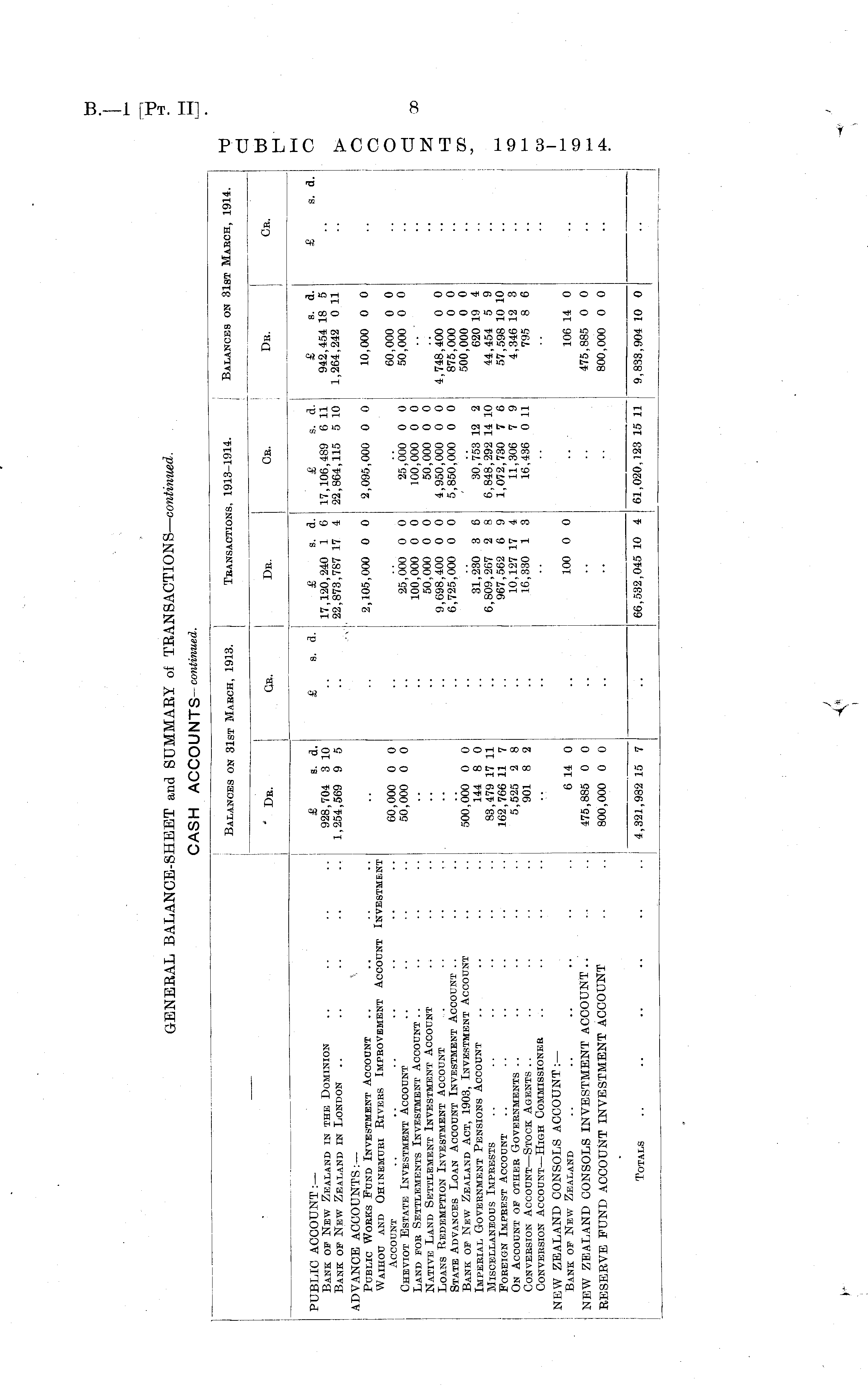 _ Balances on 31st March, 1913. i Transactions, 1913-1914. Balances on 31st March, 1914. Dr. Gr. Dr. Cr. Dr. Cr. PUBLIC ACCOUNT :— Bank of New Zealand in the Dominion Bank of New Zealand in London £ a. d. 928,704 3 10 1,254,569 9 5 £ s. d. £ s. d. 17,120,240 1 6 22,873,787 17 4 £ s. d. 17,106,489 6 11 22,864,115 5 10 £ s. d. 942,454 18 5 1,264,242 0 11 £ s. d. ADVANCE ACCOUNTS:— Public Works Fund Investment Account Waihou and Ohinemuri Rivers Improvement Account Investment Account Cheviot Estate Investment Account Land for Settlements Investment Account Native Land Settlement Investment Account Loans Redemption Investment Account State Advances Loan Account Investment Account Bank of New Zealand Act, 1903, Investment Account Imperial Government Pensions Account Miscellaneous Imprests Foreign Imprest Account On Account of other Governments Conversion Account —Stock Agents Conversion Account —High Commissioner 60,000 0 0 50,000 0 0 - 2,105,000 0 0 25,000 0 0 100,000 0 0 50,000 0 0 9,698,400 0 0 6,725,000 0 0 2,095,000 0 0 25,000 0 0 100,000 0 0 50,000 0 0 4,950,000 0 0 5,850,000 0 0 10,000 0 0 60,000 0 0 50,000 0 0 4,748,400 0 0 875,000 0 0 500,000 0 0 620 19 4 44,454 5 9 57,598 10 10 4,346 12 3 795 8 6 500,000 0 0 144 8 0 83,479 17 11 162,766 11 7 5,525 2 8 901 8 2 31,230 3 6 6,809,267 2 8 967,562 6 9 10,127 17 4 16,330 1 3 30,753 12 2 6,848,292 14 10 1,072,730 7 6 11,306 7 9 16,436 0 11 NEW ZEALAND CONSOLS ACCOUNT:— Bank of New Zealand 6 14 0 475,885 0 0 800,000 0 0 100 0 0 106 14 0 NEW ZEALAND CONSOLS INVESTMENT ACCOUNT .. 475,885 0 0 RESERVE FUND ACCOUNT INVESTMENT ACCOUNT -■ •• 800,000 0 0 Totals 4,321,982 15 7 66,532,045 10 4 61,020,123 15 11 9,833,904 10 0 ■•