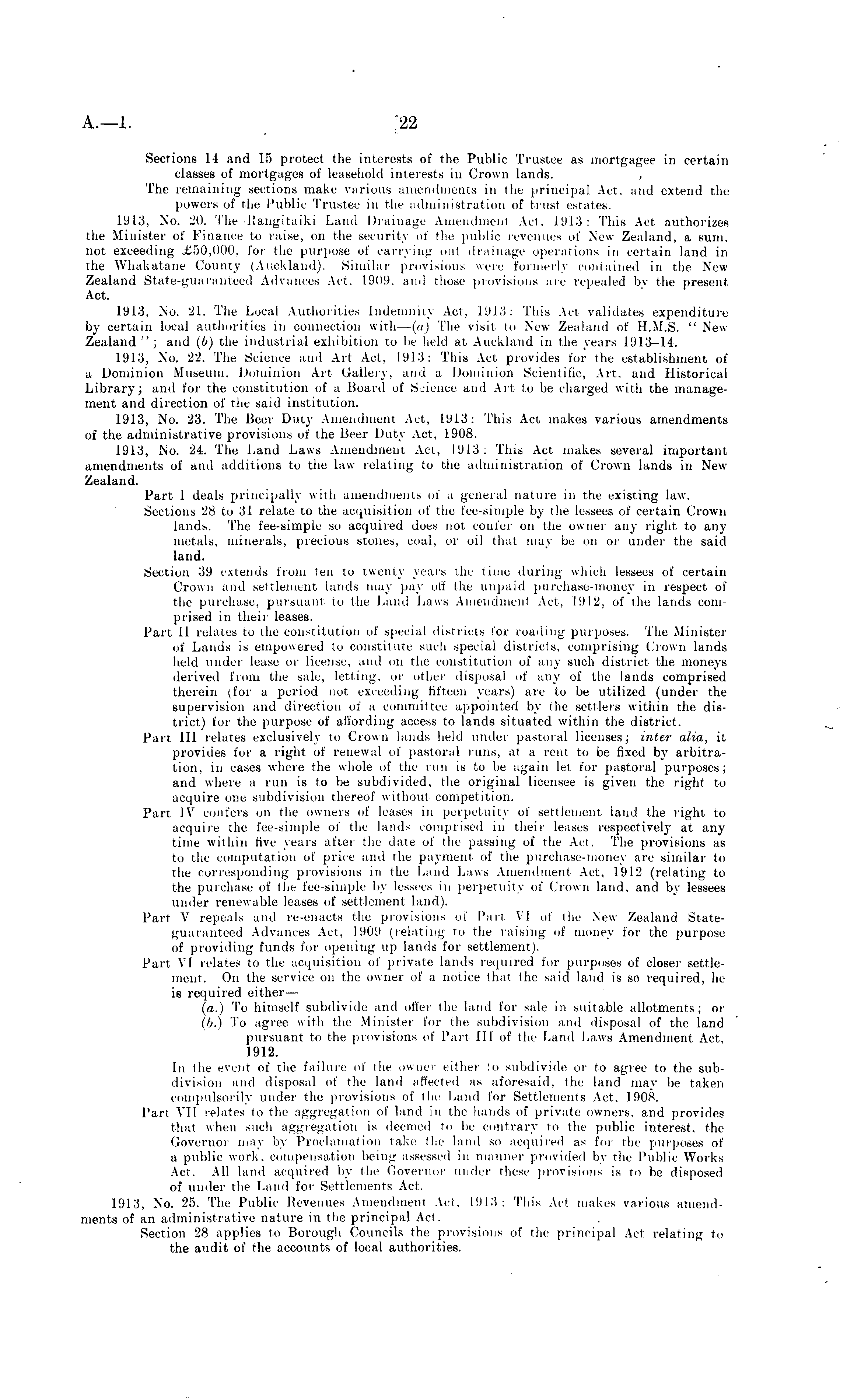 Sections 14 and 15 protect the interests of the Public Trustee as mortgagee in certain classes of mortgages of leasehold interests in Crown lands. The remaining sections make various amendments in the principal Act, and extend the powers of the Public Trustee in the administration of trust estates. 1913, No. 20. The Rangitaiki Laud Drainage Amendment Act, 1913 : This Act authorizes the Minister of Finance to raise, on the security of the public revenues of New Zealand, a sum, not exceeding £50,000, for the purpose of carrying out drainage operations in certain land in the Whakatane County (Auckland). Similar provisions were formerly contained in the New Zealand State-guaranteed Advances Act, 1909, and those provisions are repealed by the present Act. 1913, No. 21. The Local Authorities Indemnity Act, 1913: This Act validates expenditure by certain local authorities in connection with— (a) The visit to New Zealand of H.M.S. " New Zealand "; and (6) the industrial exhibition to be held at Auckland in the years 1913-14. 1913, No. 22. The Science and Art Act, 1913 : This Act provides for the establishment of a Dominion Museum, Dominion Art Gallery, and a Dominion Scientific, Art, and Historical Library; and for the constitution of a Board of Science and Art to be charged with the management and direction of the said institution. 1913, No. 23. The Beer Duty Amendment Act, 1913: This Act makes various amendments of the administrative provisions of the Beer Duty Act, 1908. 1913, No. 24. The Land Laws Amendment Act, 1913 : This Act makes several important amendments of and additions to the law relating to the administration of Crown lands in New Zealand. Part 1 deals principally with amendments of a general nature in the existing law. Sections 28 to 31 relate to the acquisition of the fee-simple by the lessees of certain Crown lands. The fee-simple so acquired does not confer on the owner any right to any metals, minerals, precious stones, coal, or oil that may be on or under the said land. Section 39 extends from ten to twenty years the time during which lessees of certain Crown and settlement lands may pay off the unpaid purchase-money in respect of the purchase, pursuant to the Land Laws Amendment Act, 1912, of the lands comprised in their leases. Part II relates to the constitution of special districts for roading purposes. The Minister of Lands is empowered to constitute such special districts, comprising Crown lands held under lease or license, and on the constitution of any such district the moneys derived from the sale, letting, or other disposal of any of the lands comprised therein (for a period not exceeding fifteen years) are to be utilized (under the supervision and direction of a committee appointed by the settlers within the district) for the purpose of affording access to lands situated within the district. Part 111 relates exclusively to Crown lands held under pastoral licenses; inter alia, it provides for a right of renewal of pastoral runs, at a rent to be fixed by arbitration, in cases where the whole of the run is to be again let for pastoral purposes; and where a run is to be subdivided, the original licensee is given the right to. acquire one subdivision thereof without competition. Part IV confers on the owners of leases in perpetuity of settlement land the right to acquire the fee-simple of the lands comprised in their leases respectively at any time within five years after the date of the passing of the Act. The provisions as to the computation of price and the payment of the purchase-money are similar to the corresponding provisions in the Land Laws Amendment Act, 1912 (relating to the purchase of the fee-simple by lessees in perpetuity of Crown land, and by lessees under renewable leases of settlement land). Part V repeals and re-enacts the provisions of Part VI of the New Zealand Stateguaranteed Advances Act, 1909 (relating to the raising of money for the purpose of providing funds for opening up lands for settlement). Part VI relates to the acquisition of private lands required for purposes of closer settlement. On the service on the owner of a notice that the said land is so required, he is required either — (a.) To himself subdivide and offer the land for sale in suitable allotments; or (b.) To agree with the Minister for the subdivision and disposal of the land pursuant to the provisions of Part 111 of the Land Laws Amendment Act, 1912. In the event of the failure of the owner either to subdivide or to agree to the subdivision and disposal of the land affected as aforesaid, the land may be taken compulsorily under the provisions of the Land for Settlements Act, 1908. Part VII relates to the aggregation of land in the hands of private owners, and provides that when such aggregation is deemed to be contrary to the public interest, the Governor may by Proclamation take the land so acquired as for the purposes of a public work, compensation being assessed in manner provided by the Public Works Act. All land acquired by the Governor under these provisions is to be disposed of under the Land for Settlements Act. 1913, No. 25. The Public Revenues Amendment Act, 1913: Tin's Act makes various amendments of an administrative nature in the principal Act. Section 28 applies to Borough Councils the provisions of the principal Act relating to the audit of the accounts of local authorities.