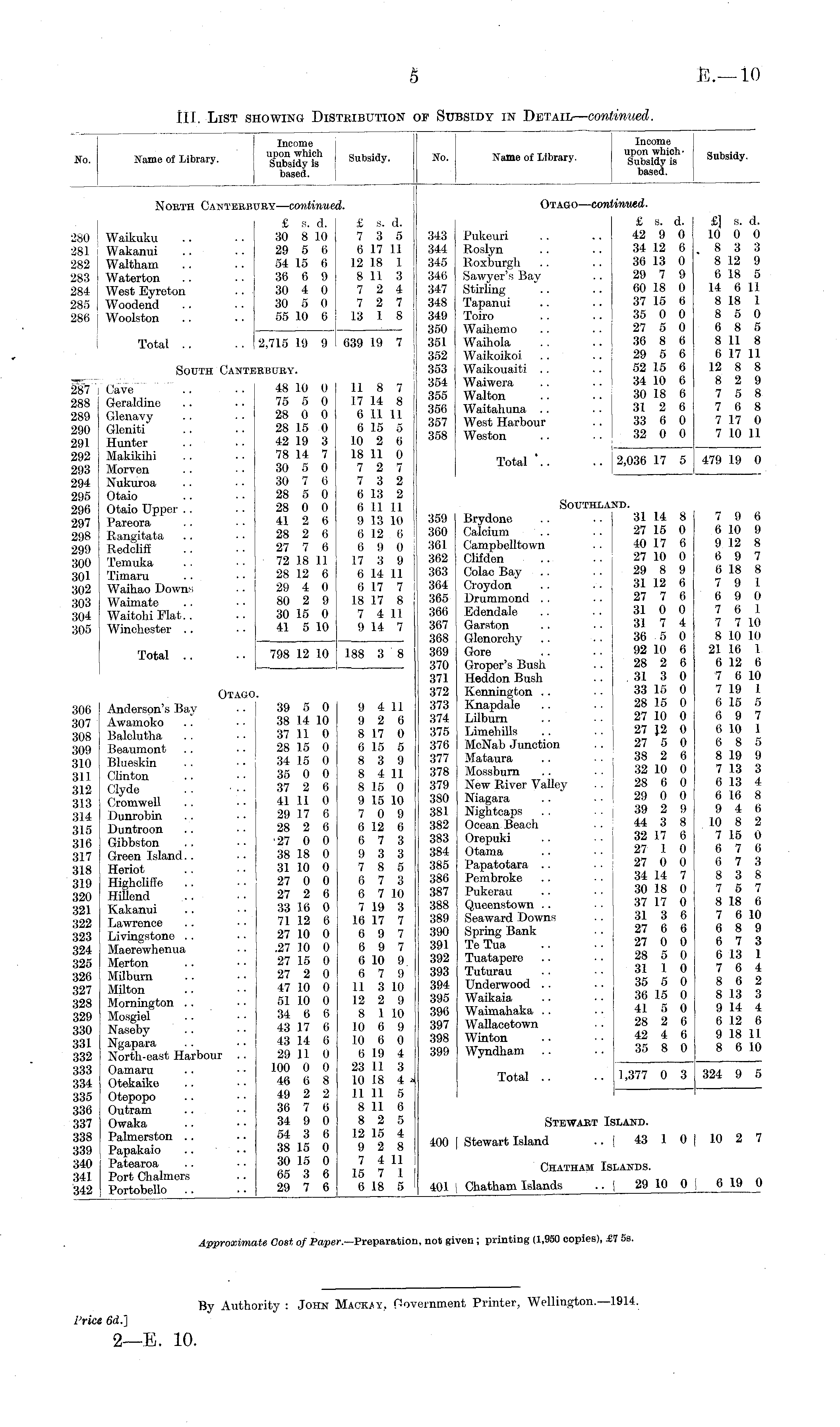 No. Name of Library. Income upon which Subsidy is based. Subsidy. No. Name of Library. Income upon whichSubsidy is based. Subsidy. North Canterbi RY— continu* Otago— cont linued. 280 ! Waikuku 281 | Wakanui 282 Waltham 283 Waterton 284 West Eyreton 285 Woodend 286 Woolston 280 281 282 283 284 285 286 £ s. d. 30 8 10 29 5 6 54 15 6 36 6 9 30 4 0 30 5 0 55 10 6 £ s. d. 7 3 5 6 17 11 12 18 1 8 11 3 7 2 4 7 2 7 13 1 8 343 344 345 346 347 348 349 350 351 352 353 354 355 356 357 358 Pukeuri Roslyn Roxburgh Sawyer's Bay Stirling Tapanui Toiro Waihemo Waihola Waikoikoi Waikouaiti Waiwera Walton Waitahuna West Harbour Weston £ s. d. 42 9 0 34 12 6 36 13 0 29 7 9 60 18 0 37 15 6 35 0 0 27 5 0 36 8 6 29 5 6 52 15 6 34 10 6 30 18 6 31 2 6 33 6 0 32 0 0 £] s. d. 10 0 0 8 3 3 8 12 9 6 18 5 14 6 II 8 18 1 8 5 0 6 8 5 8 11 8 6 17 11 12 8 8 8 2 9 7 5 8 7 6 8 7 17 0 7 10 11 Total 2,715 19 9 639 19 7 South Cante 5RBURY. 11 8 7 17 14 8 6 11 11 6 15 5 10 2 6 18 11 0 7 2 7 7 3 2 6 13 2 6 II 11 9 13 10 6 12 6 6 9 0 17 3 9 6 14 11 6 17 7 18 17 8 7 4 11 9 14 7 287 "i Cave " 288 Geraldine 289 Glenavy 290 Gleniti 291 Hunter 292 Makikihi 293 Morven 294 Nukuroa 295 Otaio 296 Otaio Upper 297 Pareora 298 Rangitata 299 Redcliff 300 Temuka 301 Timaru 302 Waihao Downs 303 Waimate 304 Waitohi Plat.. 305 Winchester 48 10 0 75 5 0 28 0 0 28 15 0 42 19 3 78 14 7 30 5 0 30 7 6 28 5 0 28 0 0 41 2 6 28 2 6 27 7 6 72 18 11 28 12 6 29 4 0 80 2 9 30 15 0 41 5 10 Total '.. Southlai 2,036 17 5 IT>. 31 14 8 27 15 0 40 17 6 27 10 0 29 8 9 31 12 6 27 7 6 31 0 0 31 7 4 36 5 0 92 10 6 28 2 6 .31 3 0 33 15 0 28 15 0 27 10 0 27 }2 0 27 5 0 38 2 6 32 10 0 28 6 0 29 0 0 39 2 9 44 3 8 32 17 6 27 1 0 27 0 0 34 14 7 30 18 0 37 17 0 31 3 6 27 6 6 27 0 0 28 5 0 31 1 0 35 5 0 36 15 0 41 5 0 28 2 6 42 4 6 35 8 0 479 19 0 Total Otago 306 j Anderson's Bay .. ] 307 Awamoko .. 308 : Balclutha 309 Beaumont 310 Blueskin 311 Clinton 312 Clyde 313 Cromwell 314 Dunrobin 315 Duntroon 316 Gibbston 317 Green Island.. 318 Heriot 319 Highcliffe 320 Hillend 321 Kakanui 322 Lawrence 323 Livingstone 324 Maerewhenua 325 Merton 326 Milburn 327 Milton 328 Mornington 329 Mosgiel 330 Naseby 331 Ngapara 332 North-east Harbour .. 333 Oamaru 334 Otekaike 335 Otepopo 336 Outram 337 Owaka 338 Palmerston 339 Papakaio 340 Patearoa 341 Port Chalmers '342 Portobello .. 306 307 308 309 310 311 312 313 314 315 316 317 318 319 320 321 322 323 324 325 326 327 328 329 330 331 332 333 334 335 336 337 338 339 340 341 342 I. I 39 5 0 38 14 10 37 11 0 28 15 0 34 15 0 35 0 0 37 2 6 41 11 0 29 17 6 28 2 6 '27 0 0 38 18 0 31 10 0 27 0 0 27 2 6 33 16 0 71 12 6 27 10 0 .27 10 0 27 15 0 27 2 0 47 10 0 51 10 0 34 6 6 43 17 6 43 14 6 29 11 0 100 0 0 46 6 8 49 2 2 36 7 6 34 9 0 54 3 6 38 15 0 30 15 0 65 3 6 29 7 6 798 12 10 188 3 9 4 11 9 2 6 8 17 0 6 15 5 8 3 9 8 4 11 8 15 0 9 15 10 7 0 9 6 12 6 6 7 3 9 3 3 7 8 5 6 7 3 6 7 10 7 19 3 16 17 7 6 9 7 6 9 7 6 10 9 6 7 9 11 3 10 12 2 9 8 1 10 10 6 9 10 6 0 6 19 4 23 11 3 10 18 4 11 11 5 8 11 6 8 2 5 12 15 4 9 2 8 7 4 11 15 7 1 6 18 5 8 359 360 361 362 363 364 365 366 367 368 369 370 371 372 373 374 375 376 377 378 379 380 381 382 383 384 385 386 387 388 389 390 391 392 393 394 395 396 397 398 399 Brydone Calcium Campbelltown Clifden Colac Bay Croydon Drummond Edendale Garston Glenorchy Gore Groper's Bush Heddon Bush .. j Kennington .. Knapdale .. Lilburn .. Limehills .. .. McNab Junction .. j Mataura .. Mossburn .. New River Valley Niagara .. Nightcaps .. Ocean Beach Orepuki .. Otama .. Papatotara Pembroke Pukerau Queenstown Seaward Downs Spring Bank Te Tua Tuatapere Tuturau Underwood Waikaia Waimahaka Wallacetown Winton Wyndham 7 9 6 6 10 9 9 12 8 6 9 7 6 18 8 7 9 J. 6 9 0 7 6 1 7 7 10 8 10 10 21 16 I 6 12 6 7 6 10 7 19 1 6 15 5 6 9 7 6 10 1 6 8 5 8 19 9 7 13 3 6 13 4 6 16 8 9 4 6 10 8 2 7 15 0 6 7 6 6 7 3 8 3 8 7 5 7 8 18 6 7 6 10 6 8 9 6 7 3 6 13 1 7 6 4 8 6 2 8 13 3 9 14 4 6 12 6 9 18 11 8 6 10 Total 1,377 0 3 324 9 5 Stewart Is SLAND. 400 Stewart Island .. [ [ 43 1 0 I 10 2 7 Chatham Isi LANDS. I 6 19 0 401 Chatham Islands .. I I 29 10 0