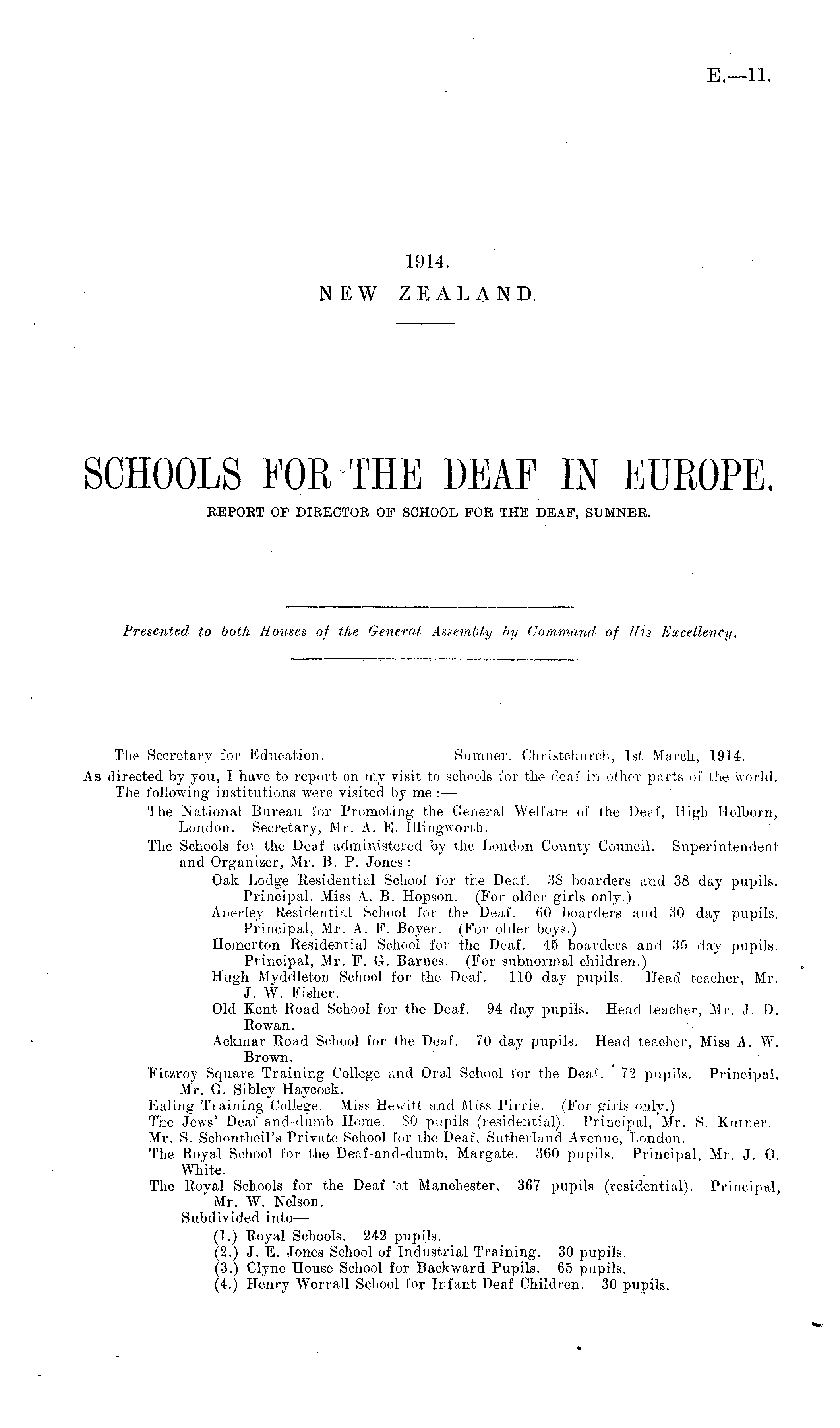 The Secretary for Education. Sumner, Christchurch, Ist March, 1914. As directed by you, I have to report on my visit to schools for the deaf in other parts of the world. The following institutions were visited by me : — Ihe National Bureau for Promoting the General Welfare of the Deaf, High Holborn, London. Secretary, Mr. A. E. Illingworth. The Schools for the Deaf administered by the London County Council. Superintendent and Organizer, Mr. B. P. Jones :— Oak Lodge Residential School for the Deaf. 38 boarders and 38 day pupils. Principal, Miss A. B. Hopson. (For older girls only.) Anerley Residential School for the Deaf. 60 boarders and .'SO day pupils. Principal, Mr. A. F. Boyer. (For older boys.) Homerton Residential School for the Deaf. 45 boarders and 35 day pupils. Principal, Mr. F. G. Barnes. (For subnormal children.) Hugh Myddleton School for the Deaf. 110 day pupils. Head teacher, Mr. J. W. Fisher. Old Kent Road School for the Deaf. 94 day pupils. Head teacher, Mr. J. D. Rowan. Ackmar Road School for the Deaf. 70 day pupils. Head teacher, Miss A. W. Brown. Fitzroy Square Training College and Oral School for the Deaf. *72 pupils. Principal, Mr. G. Sibley Haycock. Baling Training College. Miss Hewiit and Miss Piirie. (For girls only.) The Jews' Deaf-and-dumb Home. SO pupils (residential). Principal, Mr. S. Kutner. Mr. S. Schontheil's Private School for the Deaf, Sutherland Avenue, London. The Royal School for the Deaf-and-dumb, Margate. 360 pupils. Principal, Mr. J. 0. White. The Royal Schools for the Deaf 'at Manchester. 367 pupils (residential). Principal, Mr. W. Nelson. Subdivided into — (1.) Royal Schools. 242 pupils. (2.) J. E. Jones School of Industrial Training. 30 pupils. (3.) Clyne House School for Backward Pupils. 65 pupils. (4.) Henry Worrall School for Infant Deaf Children. 30 pupils.