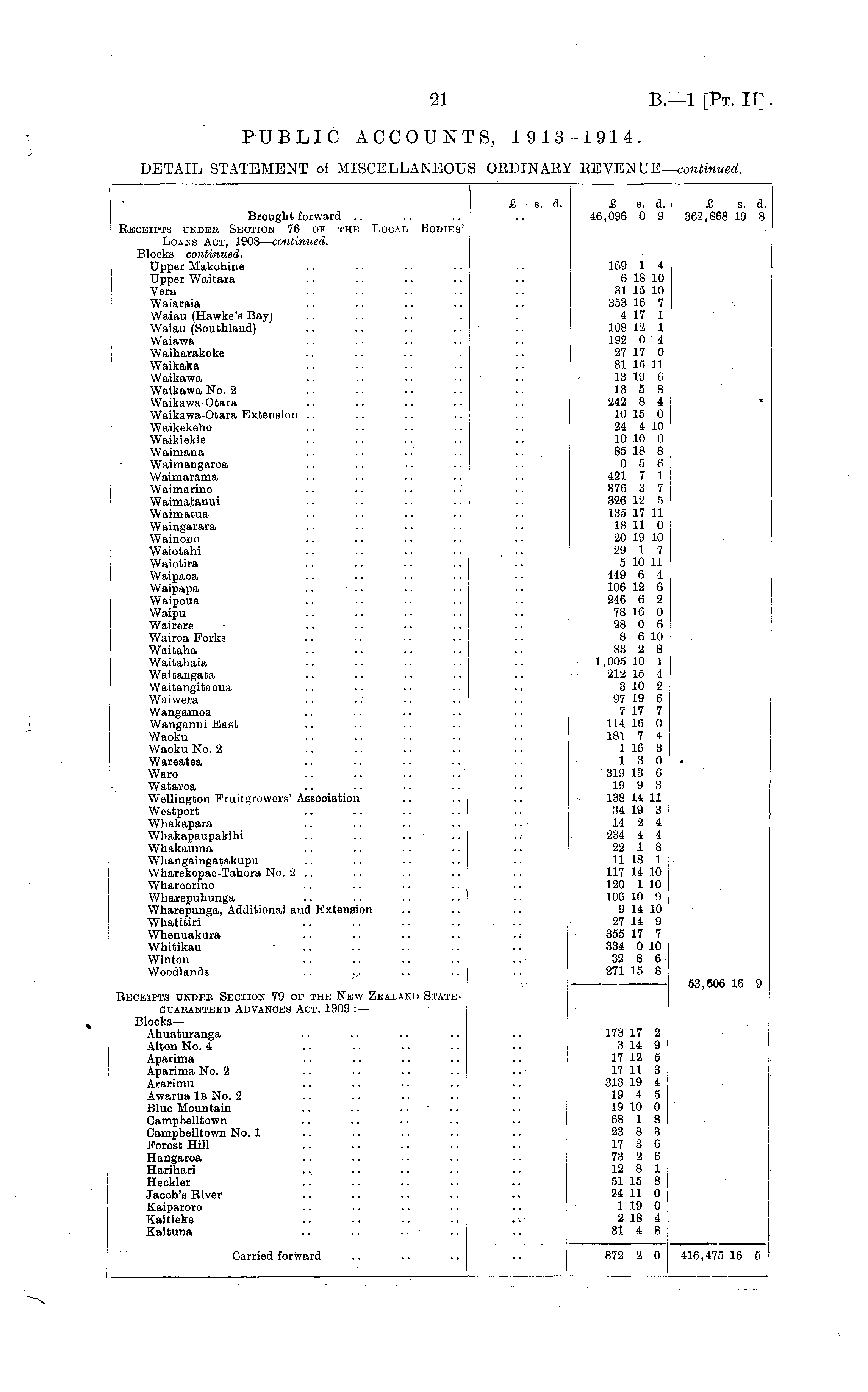 Brought forward Receipts under Section 76 of the Local Bodies' Loans Act, 1908 — continued. Blocks— continued. Upper Makohine Upper Waitara Vera Waiaraia Waiau (Hawke's Bay) Waiau (Southland) Waiawa Waiharakeke Waikaka Waikawa Waikawa No. 2 Waikawa-Otara Waikawa-Otara Extension Waikekeho Waikiekie Waimana Waimangaroa Waimarama Waimarino Waimatanui Waimatua Waingarara Wainono Waiotahi Waiotira Waipaoa Waipapa .. • .. Waipoua Waipu Wairere Wairoa Forks Waitaha Waitahaia Waitangata Waitangitaona Waiwera Wangamoa Wanganui East Waoku Waoku No. 2 Wareatea Waro Wataroa Wellington Fruitgrowers' Association Westport Whakapara Whakapaupakihi Whakauma Whangaingatakupu Wharekopae-Tahora No. 2 .. Whareorino Wharepuhunga Wharepunga, Additional and Extension Whatitiri Whenuakura Whitikau Winton Woodlands .. y £ s. d. £ s. d. 46,096 0 9 £ s. d. 362,868 19 8 169 1 4 6 18 10 31 15 10 353 16 7 4 17 1 108 12 1 192 0 4 27 17 0 81 15 11 13 19 6 13 5 8 242 8 4 10 15 0 24 4 10 10 10 0 85 18 8 0 5 6 421 7 1 376 3 7 326 12 5 135 17 11 18 11 0 20 19 10 29 1 7 5 10 11 449 6 4 106 12 6 246 6 2 78 16 0 28 0 6 8 6 10 83 2 8 1,005 10 1 212 15 4 3 10 2 97 19 6 7 17 7 114 16 0 181 7 4 1 16 3 13 0 319 13 6 19 9 3 138 14 11 34 19 3 14 2 4 234 4 4 22 1 8 11 18 1 117 14 10 120 1 10 106 10 9 9 14 10 27 14 9 355 17 7 334 0 10 32 8 6 271 15 8 Receipts under Section 79 of the New Zealand Stateguaranteed Advances Act, 1909 :— Blooks— Ahuaturanga .. Alton No. 4 .. .. .... Aparima Aparima No. 2 Ararimu Awarua 1b No. 2 .. .. Blue Mountain Campbelltown Campbelltown No. 1 Forest Hill Hangaroa Harihari Heokler Jacob's River Kaiparoro Kaitieke Kaituna .. ■ • 53,606 16 9 173 17 2 3 14 9 17 12 5 17 11 3 313 19 4 19 4 5 19 10 0 68 1 8 23 8 3 17 3 6 73 2 6 12 8 1 51 15 8 24 11 0 1 19 0 2 18 4 31 4 8 Carried forward 872 2 0 416,475 16 5