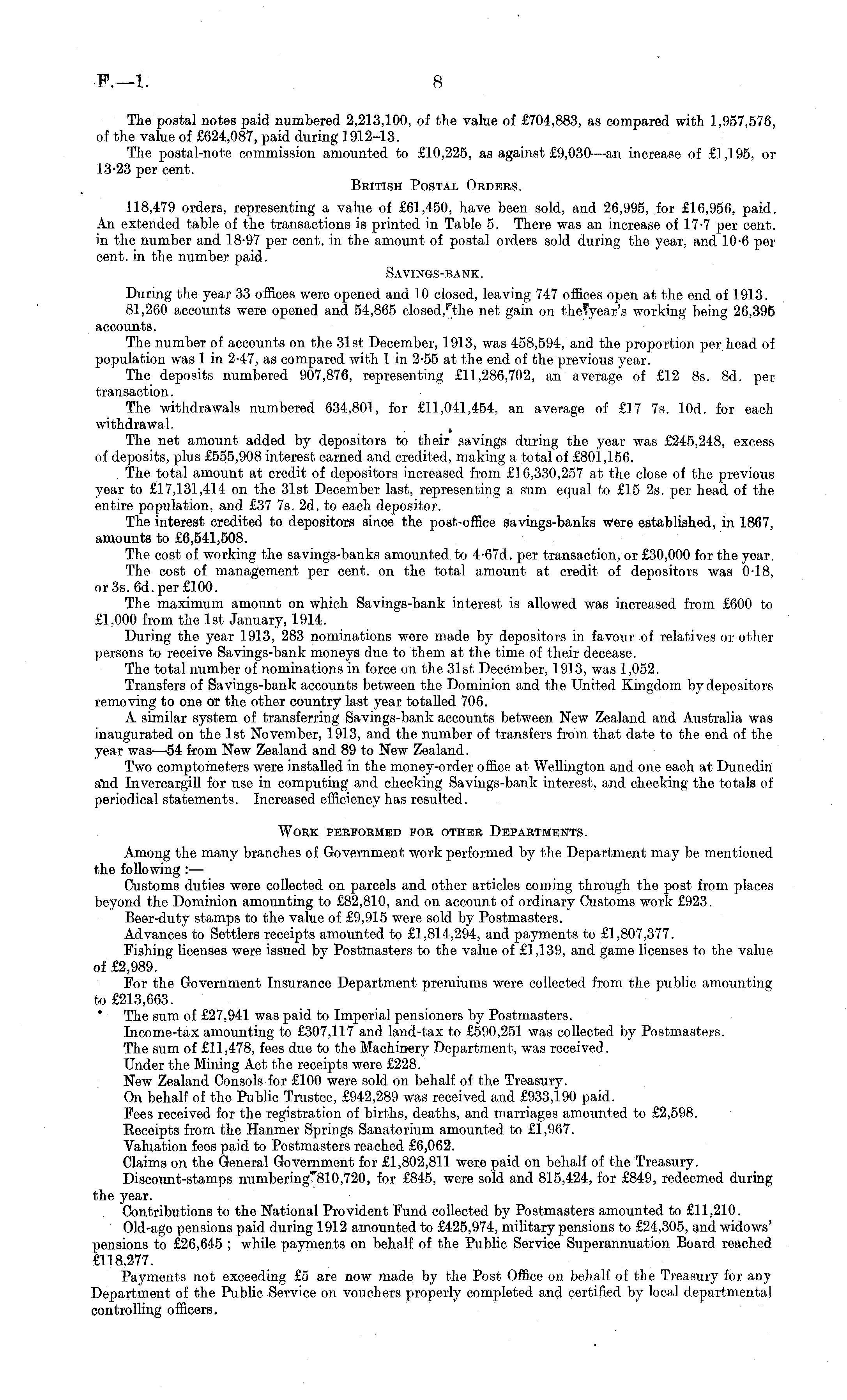 The postal notes paid numbered 2,213,100, of the value of £704,883, as compared with 1,957,576, of the value of £624,087, paid during 1912-13. The postal-note commission amounted to £10,225, as against £9,030 —an increase of £1,195, or 13-23 per cent. British Postal Orders. 118,479 orders, representing a value of £61,450, have been sold, and 26,995, for £16,956, paid. An extended table of the transactions is printed in Table 5. There was an increase of 17-7 per cent, in the number and 18-97 per cent, in the amount of postal orders sold during the year, and 10-6 per cent, in the number paid. Savings-bank. During the year 33 offices were opened and 10 closed, leaving 747 offices open at the end of 1913. 81,260 accounts were opened and 54,865 net gain on thefyear's working being 26,395 accounts. The number of accounts on the 31st December, 1913, was 458,594, and the proportion per head of population was 1 in 2-47, as compared with 1 in 2-55 at the end of the previous year. The deposits numbered 907,876, representing £11,286,702, an average of £12 Bs. Bd. per transaction. The withdrawals numbered 634,801, for £11,041,454, an average of £17 7s. lOd. for each withdrawal. t The net amount added by depositors to their savings during the year was £245,248, excess of deposits, plus £555,908 interest earned and credited, making a total of £801,156. The total amount at credit of depositors increased from £16,330,257 at the close of the previous year to £17,131,414 on the 31st December last, representing a sum equal to £15 2s. per head of the entire population, and £37 7s. 2d. to each depositor. The interest credited to depositors since the post-office savings-banks Were established, in 1867, amounts to £6,541,508. The cost of working the savings-banks amounted to 4-67 d. per transaction, or £30,000 for the year. The cost of management per cent, on the total amount at credit of depositors was 0-18, or 3s. 6d. per £100. The maximum amount on which Savings-bank interest is allowed was increased from £600 to £1,000 from the Ist January, 1914. During the year 1913, 283 nominations were made by depositors in favour of relatives or other persons to receive Savings-bank moneys due to them at the time of their decease. The total number of nominations in force on the 31st December, 1913, was 1,052. Transfers of Savings-bank accounts between the Dominion and the United Kingdom by depositors removing to one or the other country last year totalled 706. A similar system of transferring Savings-bank accounts between New Zealand and Australia was inaugurated on the Ist November, 1913, and the number of transfers from that date to the end of the year was—s4 from New Zealand and 89 to New Zealand. Two comptometers were installed in the money-order office at Wellington and one each at Dunedin a\nd Invercargill for use in computing and checking Savings-bank interest, and checking the totals of periodical statements. Increased efficiency has resulted. Work performed for other Departments. Among the many branches of Government work performed by the Department may be mentioned the following : — Customs duties were collected on parcels and other articles coming through the post from places beyond the Dominion amounting to £82,810, and on account of ordinary Customs work £923. Beer-duty stamps to the value of £9,915 were sold by Postmasters. Advances to Settlers receipts amounted to £1,814,294, and payments to £1,807,377. Fishing licenses were issued by Postmasters to the value of £1,139, and game licenses to the value of £2,989. For the Government Insurance Department premiums were collected from the public amounting to £213,663. The sum of £27,941 was paid to Imperial pensioners by Postmasters. Income-tax amounting to £307,117 and land-tax to £590,251 was collected by Postmasters. The sum of £11,478, fees due to the Machinery Department, was received. Under the Mining Act the receipts were £228. New Zealand Consols for £100 were sold on behalf of the Treasury. On behalf of the Public Trustee, £942,289 was received and £933,190 paid. Fees received for the registration of births, deaths, and marriages amounted to £2,598. Receipts from the Hanmer Springs Sanatorium amounted to £1,967. Valuation fees paid to Postmasters reached £6,062. Claims on the General Government for £1,802,811 were paid on behalf of the Treasury. Discount-stamps numbering'Blo,72o, for £845, were sold and 815,424, for £849, redeemed during the year. Contributions to the National Provident Fund collected by Postmasters amounted to £11,210. Old-age pensions paid during 1912 amounted to £425,974, military pensions to £24,305, and widows' pensions to £26,645 ; while payments on behalf of the Public Service Superannuation Board reached £118,277. Payments not exceeding £5 are now made by the Post Office on behalf of the Treasury for any Department of the Public Service on vouchers properly completed and certified by local departmental controlling officers.