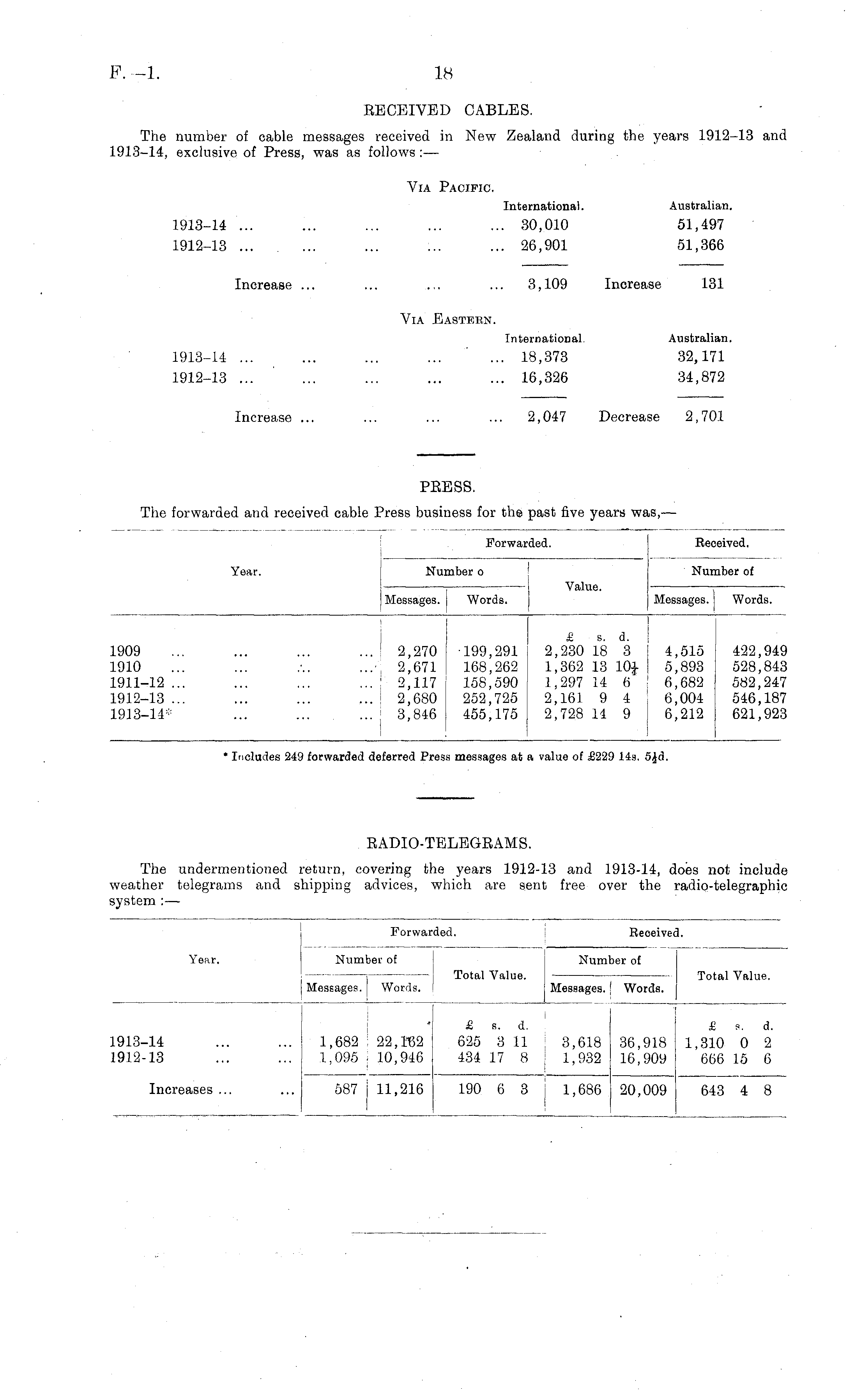 RECEIVED CABLES. The number of cable messages received in New Zealand during the years 1912-13 and 1913-14, exclusive of Press, was as follows: — Via Pacific. International. Australian. 1913-14 ... ... ... ... ... 30,010 51,497 1912-13 ... ... ... ... ... 26,901 51,366 Increase ... ... ... ... 3,109 Increase 131 Via Eastern. International. Australian. 1913-14 ... ... ... ... ... 18,373 32,171 1912-13 ... ' ... ... ... ... 16,326 34,872 Increase ... ... ... ... 2,047 Decrease 2,701