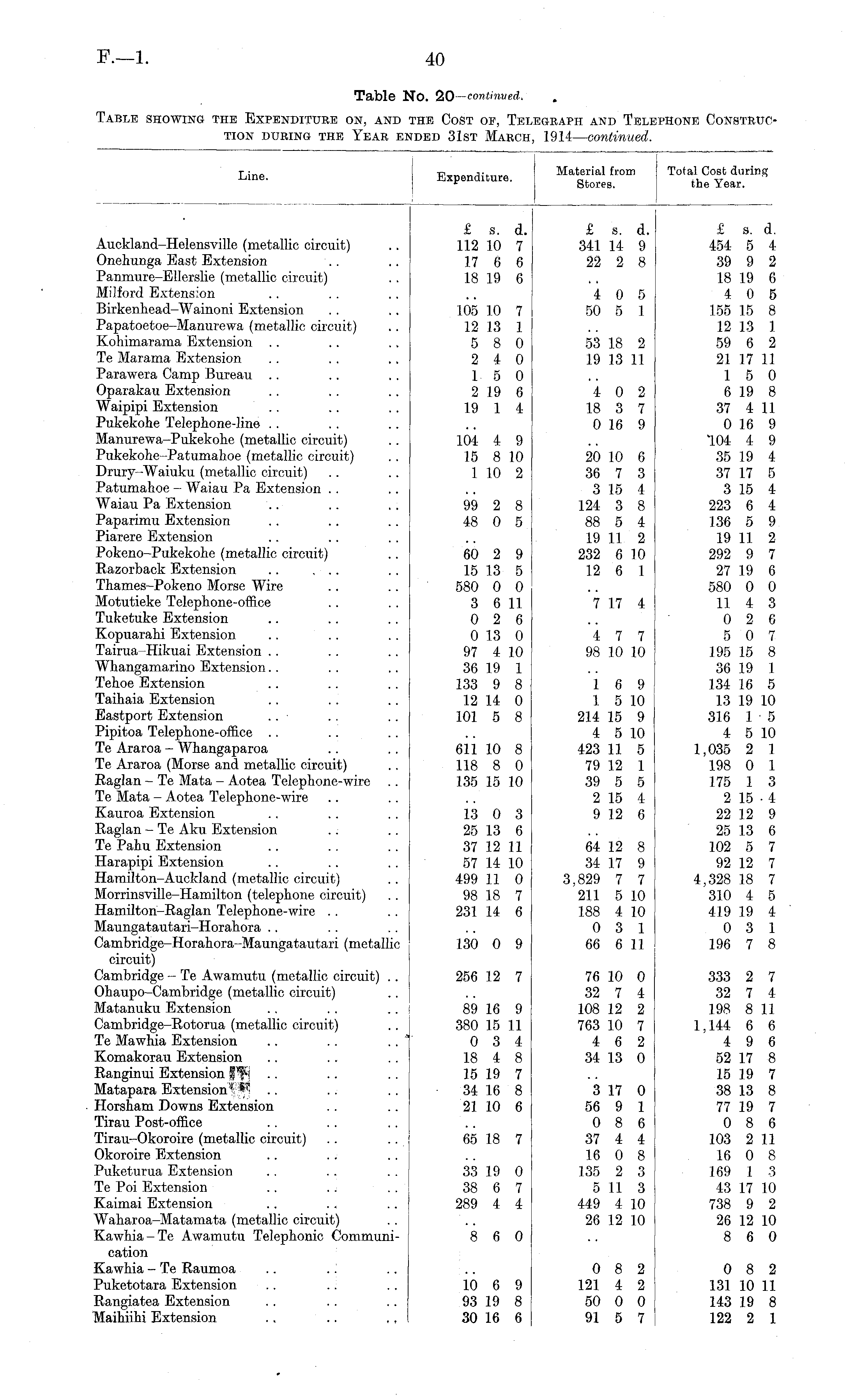 Table No. 20— continued. Table showing the Expenditure on, and the Cost of, Telegraph and Telephone Construction during the Year ended 31st March, 1914— continued.