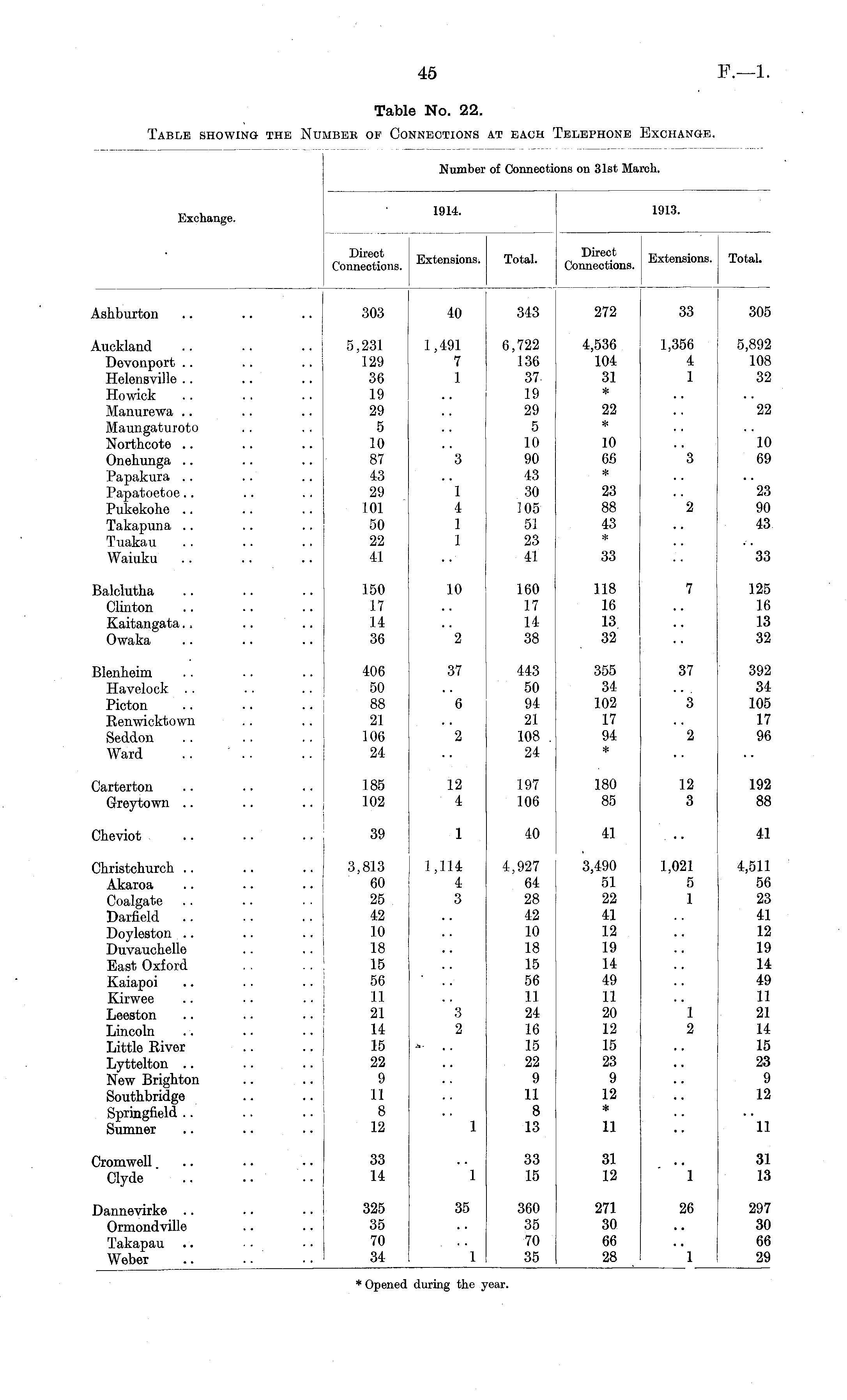 Number of Connectii ins on 31st March. 1914. 1913. Exchange. ConSon, Exte " Total. Direct Connections. Extensions. Total. Ashburton 303 40 343 272 33 305 Auckland Devonport .. Helensville .. Howick Manurewa .. Maungaturoto Northcote .. Onehunga .. Papakura .. Papatoetoe.. Pukekohe .. Takapuna .. Tuakau Waiuku 5,231 129 36 19 29 5 10 87 4:3 29 101 50 22 41 1,491 7 1 6,722 136 3719 29 5 10 90 43 30 105 51 23 41 4,536 104 31 * 22 * 10 66 * 1,356 4 1 3 5,892 108 32 22 10 69 3 1 4 1 1 23 88 43 * 2 23 90 43 33 33 Balclutha Clinton Kaitangata.. Owaka 150 17 14 36 10 160 17 14 38 118 16 13 32 7 125 16 13 32 '*2 Blenheim Havelock Picton Renwicktown Seddon Ward 406 50 88 21 106 24 37 6 443 50 94 21 108 . 24 355 34 102 17 94 * 37 3 392 34 105 17 96 2 2 Carterton Greytown .. 185 102 12 4 197 106 180 85 12 3 192 88 Cheviot 39 1 40 41 41 Christchurch .. Akaroa Coalgate Darfield .. Doyleston .. Duvauchelle East Oxford Kaiapoi Kirwee Leeston Lincoln Little River Lyttelton .. New Brighton Southbridge Springfield .. Sumner 3,813 60 25 42 10 18 15 56 11 21 14 15 22 9 11 8 12 1,114 4 3 4,927 64 28 42 10 18 15 56 11 24 16 15 22 9 11 8 13 3,490 51 22 41 12 19 14 49 11 20 12 15 23 9 12 * 1,021 5 1 4,511 56 23 41 12 19 14 49 11 21 14 15 23 9 12 3 2 1 2 .-»- 1 11 11 Cromwell Clyde 33 14 1 33 15 31 12 1 31 13 Dannevirke .. Ormondville Takapau Weber 325 35 70 34 35 360 35 70 35 271 30 66 28 26 297 30 66 29 1 "l * Opened during the 'ear.