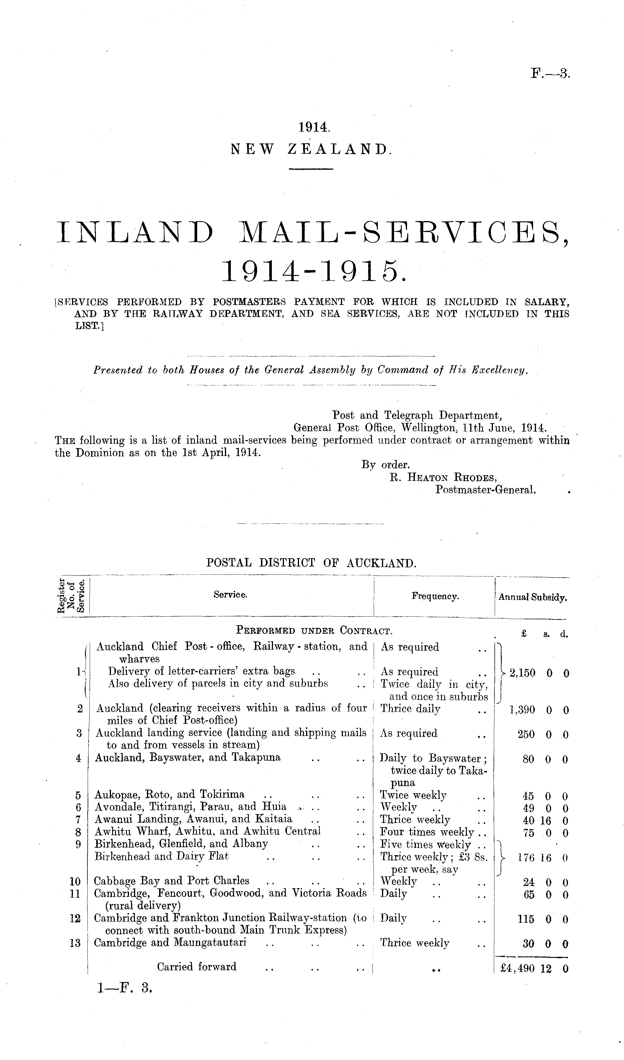 Post and Telegraph Department, General Post Office, Wellington, 11th June, 1914. The following is a list of inland mail-services being performed under contract or arrangement within the Dominion as on the Ist April, 1914. By order. R. Heaton Rhodes, Postmaster-General. .