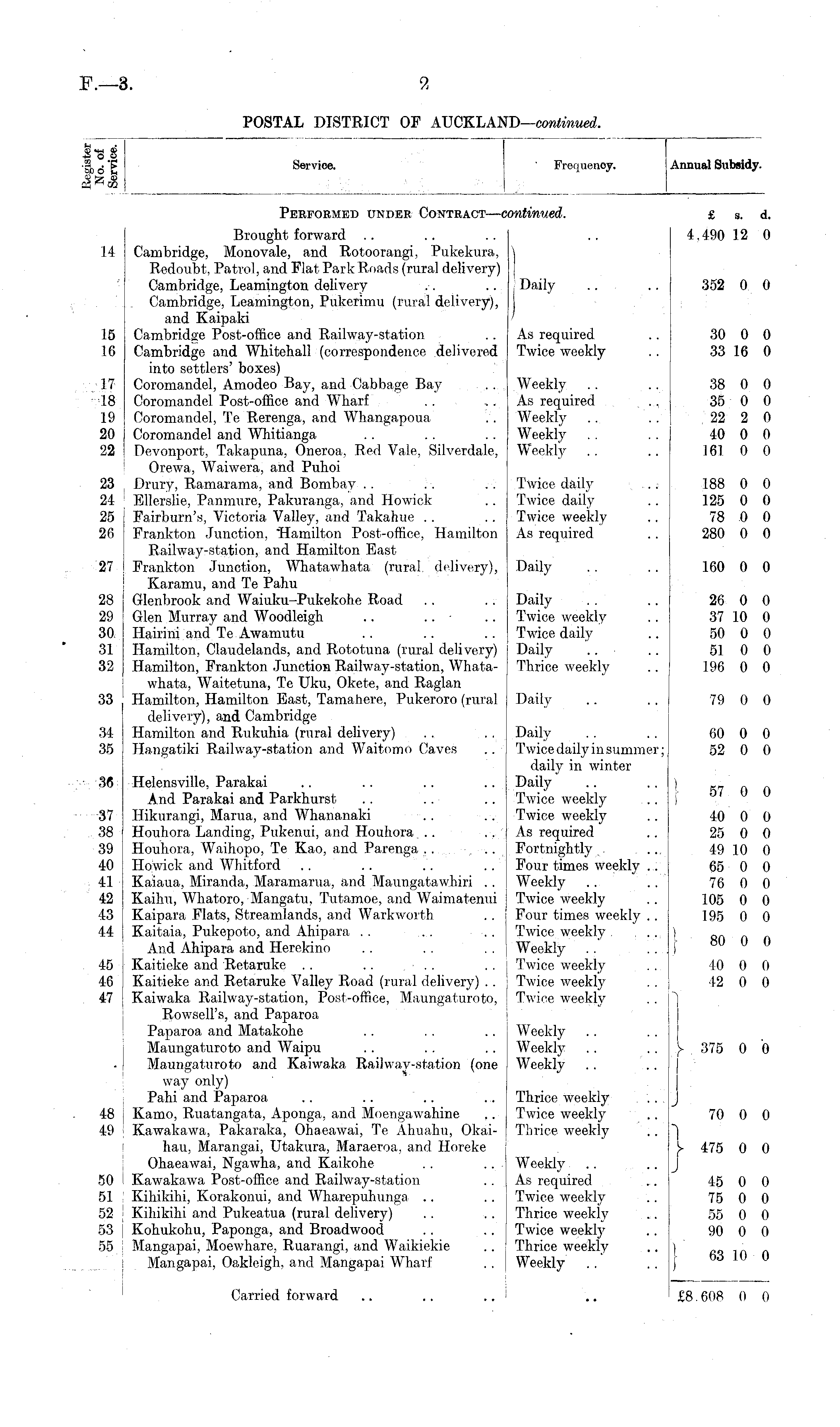 m S 'sod u Servioe. Frequency. Annual Subsidy. Performed under Contract— c ontinued. £ s. d. Brought forward Cambridge, Monovale, and Rotoorangi, Pukekura, Redoubt, Patrol, and Flat Park Roads (rural delivery) Cambridge, Leamington delivery Cambridge, Leamington, Pukerimu (rural delivery), and Kaipaki Cambridge Post-office and Railway-station Cambridge and Whitehall (correspondence delivered into settlers' boxes) Coromandel, Amodeo Bay, and Cabbage Bay Coromandel Post-office and Wharf Coromandel, Te Rerenga, and Whangapoua Coromandel and Whitianga Devonport, Takapuna, Oneroa, Red Vale, Silverdale, Orewa, Waiwera, and Puhoi Drury, Ramarama, and Bombay Ellerslie, Panmure, Pakuranga, and Howiek Fairburn's, Victoria Valley, and Takahue Frankton Junction, "Hamilton Post-office, Hamilton Railway-station, and Hamilton East Frankton Junction, Whatawhata (rural delivery), Karamu, and Te Pahu Glenbrook and Waiuku-Pukekohe Road Glen Murray and Woodleigh .. .. ■ Hairini and Te Awamutu Hamilton, Claudelands, and Rototuna (rural delivery) Hamilton, Frankton Junction Railway-station, Whatawhata, Waitetuna, Te Uku, Okete, and Raglan Hamilton, Hamilton East, Tamahere, Pukeroro (rural delivery), and Cambridge Hamilton and Rukuhia (rural delivery) . . Hangatiki Railway-station and Waitomo Caves 4,490 12 0 14 ) ' Daily 352 0 0 15 16 As required Twice weekly 30 0 0 33 16 0 17 18 19 20 22 Weekly As required Weekly Weekly Weekly 38 0 0 35 0 0 22 2 0 40 0 0 161 0 0 23 24 25 26 Twice daily Twice daily Twice weekly As required 188 0 0 125 0 0 78 0 0 280 0 0 27 Daily 160 0 0 28 29 30 31 32 Daily Twice weekly Twice daily Daily Thrice weekly 26 0 0 37 10 0 50 0 0 51 0 0 196 0 0 33 Daily79 0 0 34 35 Daily Twice daily in summer; daily in winter Daily Twice weekly Twice weekly As required Fortnightly Four times weekly .. Weekly Twice weekly Four times weekly .. Twice weekly . ... Weekly Twice weekly Twice weekly Twice weekly 60 0 0 52 0 0 36 Helensville, Parakai And Parakai and Parkhurst Hikurangi, Marua, and Whananaki Houhora Landing, Pukenui, and Houhora . . Houhora, Waihopo, Te Kao, and Parenga . . ■. .. . Howiek and Whitford Kaiaua, Miranda, Maramarua, and Maungatawhiri . . Kaihu, Whatoro, Mangatu, Tutamoe, and Waimatenui Kaipara Flats, Streamlands, and Warkworth Kaitaia, Pukepoto, and Ahipara And Ahipara and Herekino Kaitieke and Retaruke .. .. ■ .. Kaitieke and Retaruke Valley Road (rural delivery) . . Kaiwaka Railway-station, Post-office, Maungaturoto, Rowsell's, and Paparoa Paparoa and Matakohe Maungaturoto and Waipu Maungaturoto and Kaiwaka Railway-station (one way only) Pahi and Paparoa .. .. Kamo, Ruatangata, Aponga, and Moengawahine Kawakawa, Pakaraka, Ohaeawai, Te Ahuahu, Okaihau, Marangai, Utakura, Maraeroa, and Horeke Ohaeawai, Ngawha, and Kaikohe . . Kawakawa Post-office and Railway-station Kihikihi, Korakonui, and Wharepuhunga Kihikihi and Pukeatua (rural delivery) Kohukohu, Paponga, and Broadwood Mangapai, Moewhare, Ruarangi, and Waikiekie M'angapai, Oakleigh, and Mangapai Wharf 57 0 0 i 37 38 39 40 41 42 43 44 40 0 0 25 0 0 49 10 0 65 0 0 76 0 0 105 0 0 195 0 0 80 0 0 45 46 47 40 0 0 42 0 0 Weekly Weekly Weekly I y 375 o b I 48 [-9 Thrice weekly Twice weekly Thrice weekly 70 0 0 Weekly As required Twice weekly Thrice weekly Twice weekly Thrice weekly Weekly V 475 0 0 50 5] 52 53 55 45 0 0 75 0 0 55 0 0 90 0 0 I 63 10 0 Carried forward £8.608 0 0