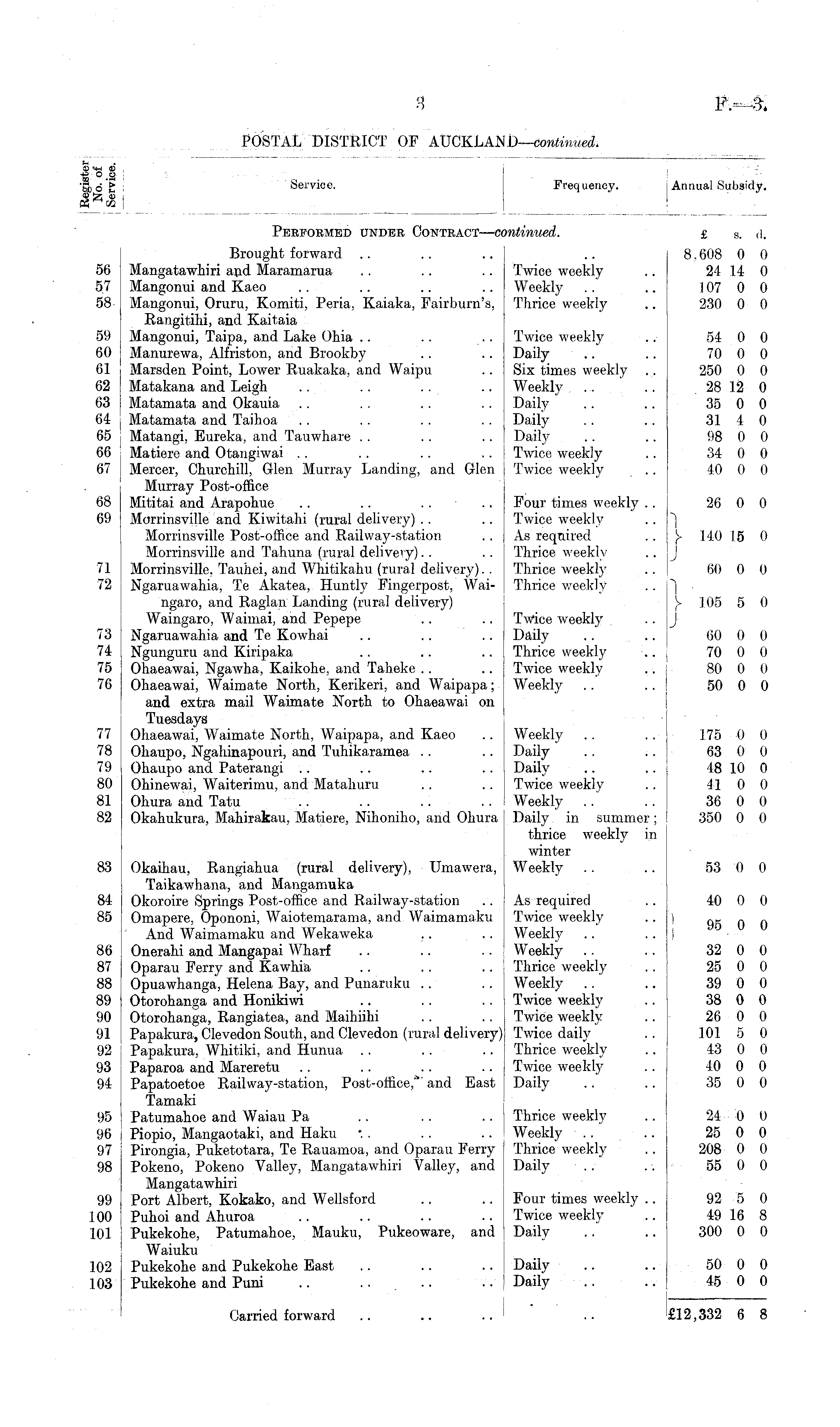 WOO •gjd'fc Service. 03 oo Frequency. Annual Subsidy. Performed under Contract—cc mtinued. £ s. d. Brought forward 56 Mangatawhiri and Maramarua 57 Mangonui and Kaeo .. .. .. 58- Mangonui, Oruru, Komiti, Peria, Kaiaka, Fairburn's, Rangitilii, and Kaitaia 59 Mangonui, Taipa, and Lake Ohia 60 Manurewa, Alfriston, and Brookby 61 Marsden Point, Lower Ruakaka, and Waipu 62 Matakana and Leigh 63 ! Matamata and Okauia 64 J Matamata and Taihoa 65 ; Matangi, Eureka, and Tauwhare . . .. .. j 66 ; Matiere and Otangiwai .. .. .. 67 j Mercer, Churchill, Glen Murray Landing, and Glen Murray Post-office 68 Mititai and Arapohue 69 Morrinsville and Kiwitahi (rural delivery) Morrinsville Post-office and Railway-station Morrinsville and Tahuna (rural delivery). . . . j 71 Morrinsville. Tauhei, and Whitikahu (rural delivery). . 72 Ngaruawahia, Te Akatea, Huntly Fingerpost, Waingaro, and Raglan Landing (rural delivery) Waingaro, Waimai; and Pepepe 73 Ngaruawahia and Te Kowhai 74 Ngunguru and Kiripaka 75 Ohaeawai, Ngawha, Kaikohe, and Taheke 76 Ohaeawai, Waimate North, Kerikeri, and Waipapa; and extra mail Waimate North to Ohaeawai on Tuesdays 77 Ohaeawai, Waimate North, Waipapa, and Kaeo 78 I Ohaupo, Ngahinapouri, and Tuhikaramea 79 1 Ohaupo and Paterangi 80 Ohinewai, Waiterimu, and Matahuru 81 Ohura and Tatu 82 Okahukura, Mahirakau, Matiere, Nihoniho, and Ohura 56 57 58 59 60 61 62 63 64 65 66 67 68 69 8.608 0 0 Twice weekly .. 24 14 0 Weekly .. .. 107 0 0 Thrice weekly .. 230 0 0 Twice weekly .. 54 0 0 Daily .. .. 70 0 0 Six times weekly .. 250 0 0 Weekly ... .. 28 12 0 Daily .. .. 35 0 0 Daily .. .. 31 4 0 Daily .. .. 98 0 0 Twice weekly .. 34 0 0 Twice weekly .. 40 0 0 Four times weekly .. 26 0 0 Twice weekly .. ") As required .. j> 140 15 0 Thrice weekly . . j Thrice weekly .. I 60 0 0 Thrice weekly .. "] Y 105 5 0 Twice weekly .. J Daily ..' .. | 60 0 0 Thrice weekly -.. | 70 0 0 Twice weekly .. 80 0 0 Weekly ..' .. 50 0 0 71 72 73 74 75 76 77 78 79 80 81 82 Weekly .. .. 175 0 0 Daily .. .. 63 0 0 Daily .. .. 48 10 0 Twice weekly .. 41 0 0 Weekly .. .. 36 0 0 Daily in summer; I 350 0 0 thrice weekly in winter Weekly .. .. 53 0 0 83 Okaihau, Rangiahua (rural delivery), Umawera, Taikawhana, and Mangamuka 84 j Okoroire Springs Post-office and Railway-station 85 Omapere, Opononi, Waiotemarama, and Waimamaku And Waimamaku and Wekaweka 86 Onerahi and Mangapai Wharf 87 Oparau Ferry and Kawhia .. .. 88 Opuawhanga, Helena Bay, and Punaruku 89 Otorohanga and Honikiwi .. .. 90 Otorohanga, Rangiatea, and Maihiihi 91 Papakura, Clevedon South, and Clevedon (rural delivery) 92 Papakura, Whitiki, and Humia 93 Paparoa and Mareretu .. .. .. 94 Papatoetoe Railway-station, Post-office,*' and East Tamaki 95 i Patumahoe and Waiau Pa .. . . 96 ■ Piopio, Mangaotaki, and Haku • . .. .. ! 97 ; Pirongia, Puketotara, Te Rauamoa, and Oparau Ferry 98 Pokeno, Pokeno Valley, Mangatawhiri Valley, and Mangatawhiri 99 Port Albert, Kokako, and Wellsford 100 Puhoi and Ahuroa 101 Pukekohe, Patumahoe, Mauku, Pukeoware, and Waiuku 102 Pukekohe and Pukekohe East 103 Pukekohe and Puni .. .. .. 83 84 85 As required .. 40 0 0 Twice weekly .. ) Weekly .. .. J 90 U U Weekly .. .. 32 0 0 Thrice weekly .. 25 0 0 Weekly .. .. 39 0 0 Twice weekly .. 38 0 0 Twice weekly .. 26 0 0 Twice daily' .. 101 5 0 Thrice weekly .. 43 0 0 Twice weekly .. 40 0 0 Daily .. .. 35 0 0 86 87 88 89 90 91 92 93 94 95 96 97 98 Thrice weekly .. 24-fl 0 Weekly .. .. 25 0 0 Thrice weekly .. 208 0 0 Daily . . . ■. 55 0 0 99 100 101 Four times weekly .. 92 5 0 Twice weekly .. 49 16 8 Daily .. .. 300 0 0 102 103 Daily .. .. 50 0 0 Daily .. .. 45 0 0 Carried forward pi ct eon r* o £12,332 6 8 £12,332 6 8