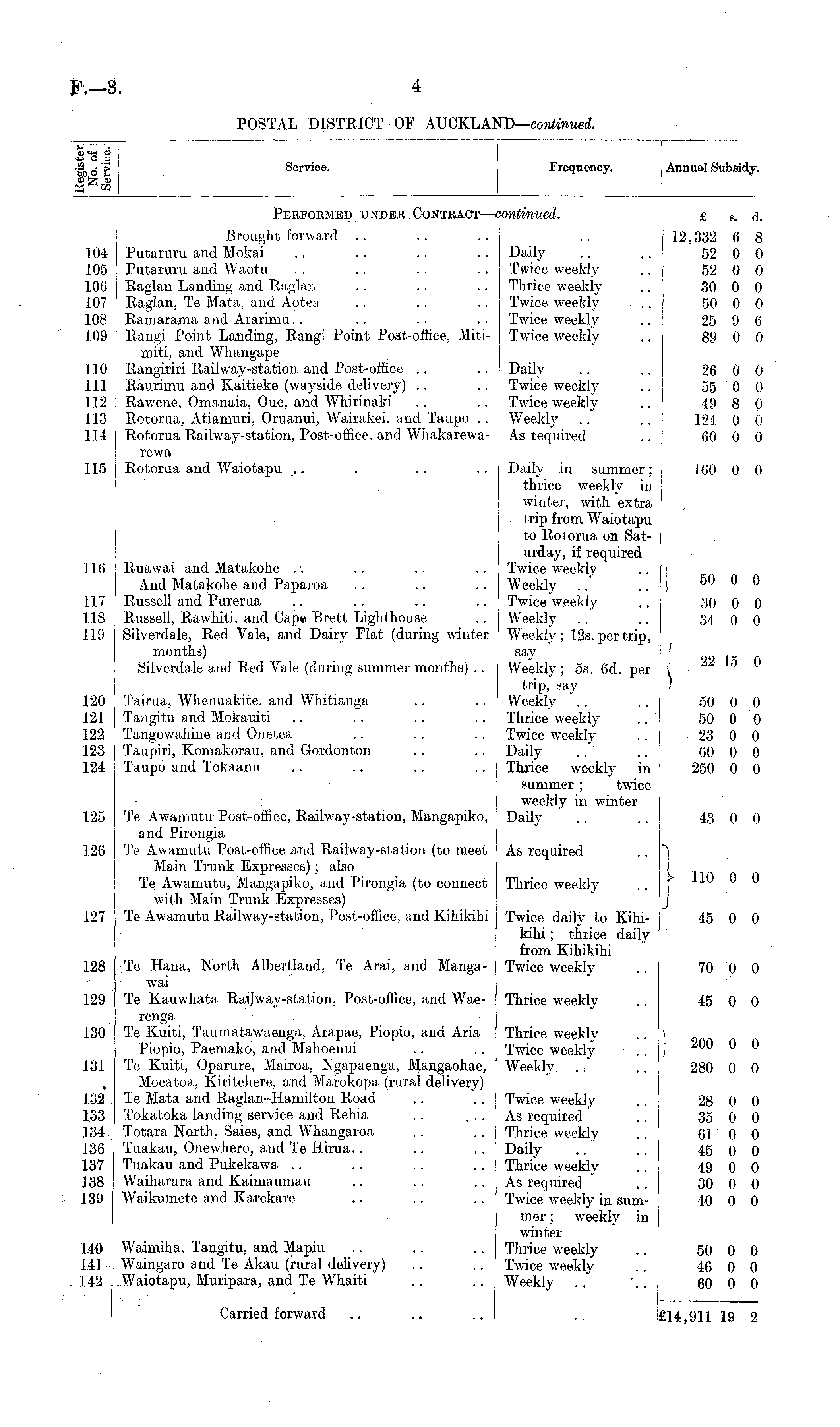\a\\ Servioe. Frequency. Annual Subsidy. Performed under Contract—< continued. £ s. d. 104 105 106 107 108 109 Brought forward Putaruru and Mokai Putaruru and Waotu Raglan Landing and Raglan Raglan, Te Mata, and Aotea Ramarama and Ararimu I Rangi Point Landing, Rangi Point Post-office, Mitimiti, and Whangape Rangiriri Railway-station and Post-office Raurimu and Kaitieke (wayside delivery) Rawene, Omanaia, Oue, and Wniiinaki Rotorua, Atiamuri, Oruanui, Wairakei, and Taupo .. Rotorua Railway-station, Post-office, and WhakarewaDaily Twice weekly Thrice weekly Twice weekly Twice weekly j Twice weekly 12,332 6 8 52 0 0 52 0 0 30 0 0 50 0 0 25 9 6 89 0 0 110 111 112 113 114 Daily Twice weekly Twice weekly Weekly As required 26 0 0 55 0 0 49 8 0 124 0 0 60 0 0 115 rewa Rotorua and Waiotapu Ruawai and Matakohe And Matakohe and Paparoa Russell and Purerua Russell, Rawhiti, and Cape Brett Lighthouse Silverdale, Red Vale, and Dairy Flat (during winter months) Silverdale and Red Vale (during summer months) . . Daily in summer; thrice weekly in winter, with extra trip from Waiotapu to Rotorua on Saturday, if required Twice weekly Weekly Twice weekly Weekly Weekly; 12s. per trip, 160 0 0 50 0 0 116 117 118 119 30 0 0 34 0 0 / 120 121 122 123 124 Tairua, Whenuakite, and Whitianga Tangitu and Mokauiti Tangowahine and Onetea Taupiri, Komakorau, and Gordonton Taupo and Tokaanu say Weekly; 5s. 6d. per trip, say Weekly Thrice weekly Twice weekly Daily Thrice weekly in summer ; twice weekly in winter Daily 22 15 0 50 0 0 50 0 0 23 0 0 60 0 0 250 0 0 125 Te Awamutu Post-office, Railway-station, Mangapiko, and Pirongia Te Awamutu Post-office and Railway-station (to meet Main Trunk Expresses) ; also Te Awamutu, Mangapiko, and Pirongia (to connect with Main Trunk Expresses) Te Awamutu Railway-station, Post-office, and Kihikihi 43 0 0 126 As required "1 Thrice weekly I 110 0 0 127 128 Te Hana, North Albertland, Te Arai, and Mangawai Te Kauwhata Railway-station, Post-office, and WaeTwice daily to Kihikihi; thrice daily from Kihikihi Twice weekly 45 0 0 70 0 0 129 Thrice weekly 45 0 0 130 131 132 133 134 136 137 138 139 renga Te Kuiti, Taumatawaenga, Arapae, Piopio, and Aria Piopio, Paemako, and Mahoenui Te Kuiti, Oparure, Mairoa, Ngapaenga, Mangaohae, Moeatoa, Kiritehere, and Marokopa (rural delivery) Te Mata and Raglan-Hamilton Road Tokatoka landing service and Rehia .. ... Totara North, Saies, and Whangaroa Tuakau, Onewhero, and Te Hirua.. Tuakau and Pukekawa Waiharara and Kaimaumau Waikumete and Karekare Thrice weekly Twice weekly ■ .. Weekly Twice weekly As required Thrice weekly Daily Thrice weekly As required Twice weekly in summer ; weekly in winter Thrice weekly Twice weekly Weekly J 200 0 0 280 0 0 28 0 0 35 0 0 61 0 0 45 0 0 49 0 0 30 0 0 40 0 0 140 141 142 Waimiha, Tangitu, and Mapiu .. .. Waingaro and Te Akau (rural delivery) Waiotapu, Muripara, and Te Whaiti 50 0 0 46 0 0 60 0 0 Carried forward £14,911 19 2