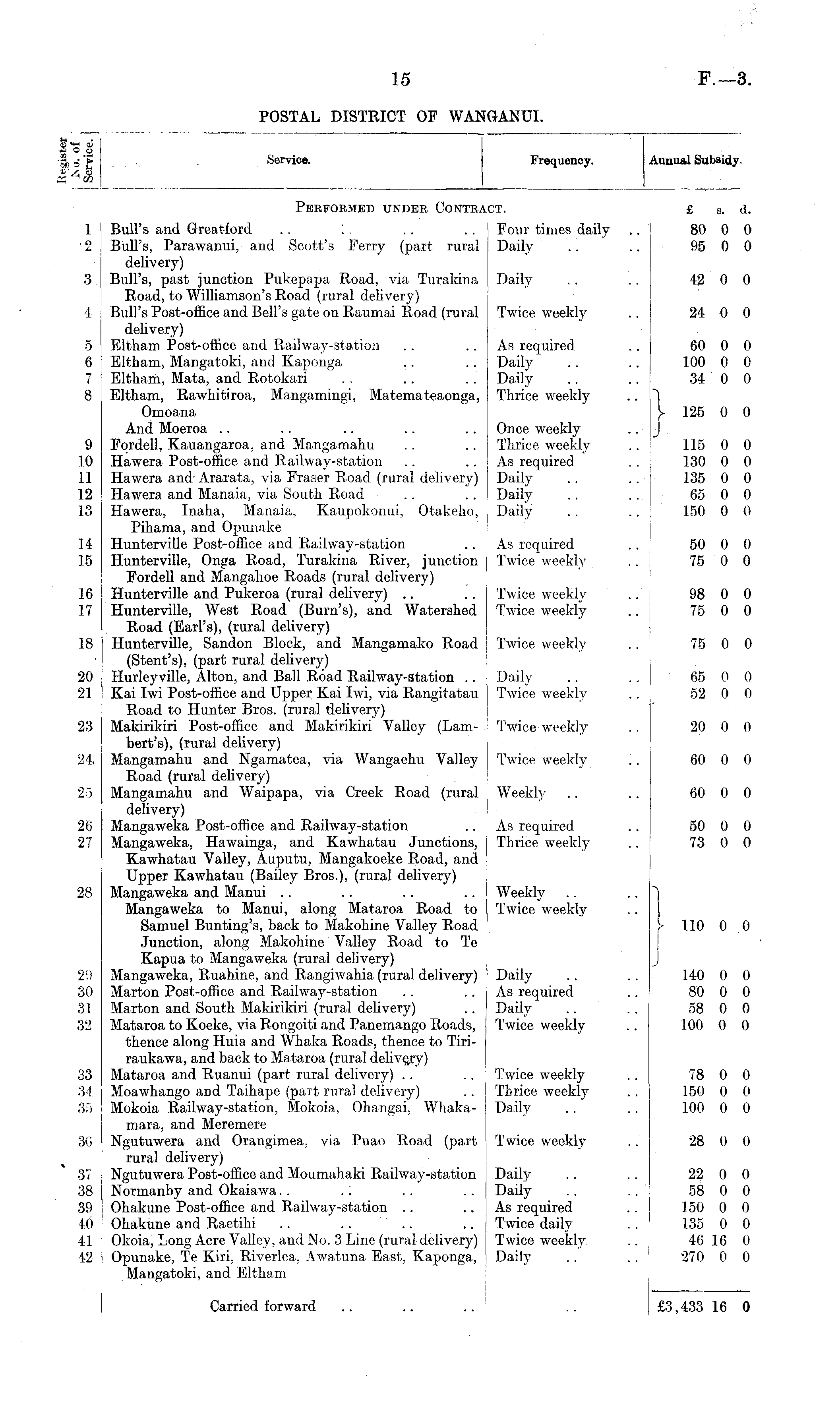 8<M O © jr S3 Service. Frequency. Annual Subsidy. Performed under Contrai 3T. £ s. d. 1 2 Bull's and Greatford .. :. Bull's, Parawanui, and Scott's Ferry (part rural delivery) Bull's, past junction Pukepapa Road, via Turakina Road, to Williamson's Road (rural delivery) Bull's Post-office and Bell's gate on Raumai Road (rural delivery) Eltham Post-office and Railway-station Eltham, Mangatoki, and Kaponga Eltham, Mata, and Rotokari Eltham, Rawhitiroa, Mangamingi, Matemateaonga, Omoana And Moeroa Fqrdell, Kauangaroa, and Manga mahu Hawera Post-office and Railway-station Hawera and : Ararata, via Praser Road (rural delivery) Hawera and Manaia, via South Road Hawera, Inaha, Manaia, Kaupokonui, Otakeho, Pihama, and Opunake Hunterville Post-office and Railway-station Hunterville, Onga Road, Turakina River, junction Fordell and Mangahoe Roads (rural delivery) Hunterville and Pukeroa (rural delivery) Hunterville, West Road (Burn's), and Watershed Road (Earl's), (rural delivery) Hunterville, Sandon Block, and Mangamako Road | (Stent's), (part rural delivery) Hurleyville, Alton, and Ball Road Railway-station .. Kai Iwi Post-office and Upper Kai Iwi, via Rangitatau S Road to Hunter Bros, (rural delivery) Makirikiri Post-office and Makirikiri Valley (Lam- ' bert's), (rural delivery) Mangamahu and Ngamatea, via Wangaehu Valley Road (rural delivery) Mangamahu and Waipapa, via Creek Road (rural delivery) Mangaweka Post-office and Railway-station Mangaweka, Hawainga, and Kawhatau Junctions, Kawhatau Valley, Auputu, Mangakoeke Road, and Upper Kawhatau (Bailey Bros.), (rural delivery) Mangaweka and Manui Mangaweka to Manui, along Mataroa Road to Samuel Bunting's, back to Makohine Valley Road Junction, along Makohine Valley Road to Te Kapua to Mangaweka (rural delivery) Mangaweka, Ruahine, and Rangiwahia (rural delivery) Marton Post-office and Railway-station Marton and South Makirikiri (rural delivery) Mataroa to Koeke, via Rongoiti and Panemango Roads, thence along Huia and Whaka Roads, thence to Tiriraukawa, and back to Mataroa (rural delivery) Mataroa and Ruanui (part rural delivery) Moawhango and Taihape (part rural delivery) Mokoia Railway-station, Mokoia, Ohangai, Whakamara, and Meremere Ngutuwera and Orangimea, via Puao Road (part rural delivery) Ngutuwera Post-office and Moumahaki Railway-station Normanby and Okaiawa Ohakune Post-office and Railway-station Ohakune and Raetihi Okoia, Long Acre Valley, and No. 3 Line (rural delivery) Opunake, Te Kiri, Riverlea, Awatuna East, Kaponga, : Mangatoki, and Eltham Four times daily Daily 80 0 95 0 0 0 3 Daily 42 0 0 4 Twice weekly 24 0 0 5 6 7 8 As required Daily Daily Thrice weekly 60 0 100 0 34 0 0 0 0 } 125 0 0 9 10 11 12 13 Once weekly Thrice weekly As required Daily Daily Daily 115 0 130 0 135 0 65 0 150 0 0 0 0 0 0 14 15 As required Twice weekly 50 0 75 0 0 0 16 17 Twice weekly Twice weekly 98 0 75 0 0 0 18 Twice weekly 75 0 0 20 21 Daily Twice weekly 65 0 52 0 0 0 23 Twice weekly 20 0 0 24. Twice weekly 60 0 0 25 Weekly .. 60 0 0 26 27 As required Thrice weekly 50 0 73 0 0 0 28 Weekly Twice weekly ! 110 0 0 20 30 31 32 Daily As required Daily Twice weekly 140 0 80 0 58 0 100 0 0 0 0 0 33 34 35 Twice weekly Thrice weekly Daily 78 0 150 0 100 0 0 0 0 30 Twice weekly 28 0 0 « Daily Daily As required Twice daily Twice weekly. Daily 22 0 58 0 150 0 135 0 46 16 270 0 0 0 0 0 0 0 37 38 39 40 41 42 Carried forward .. ..