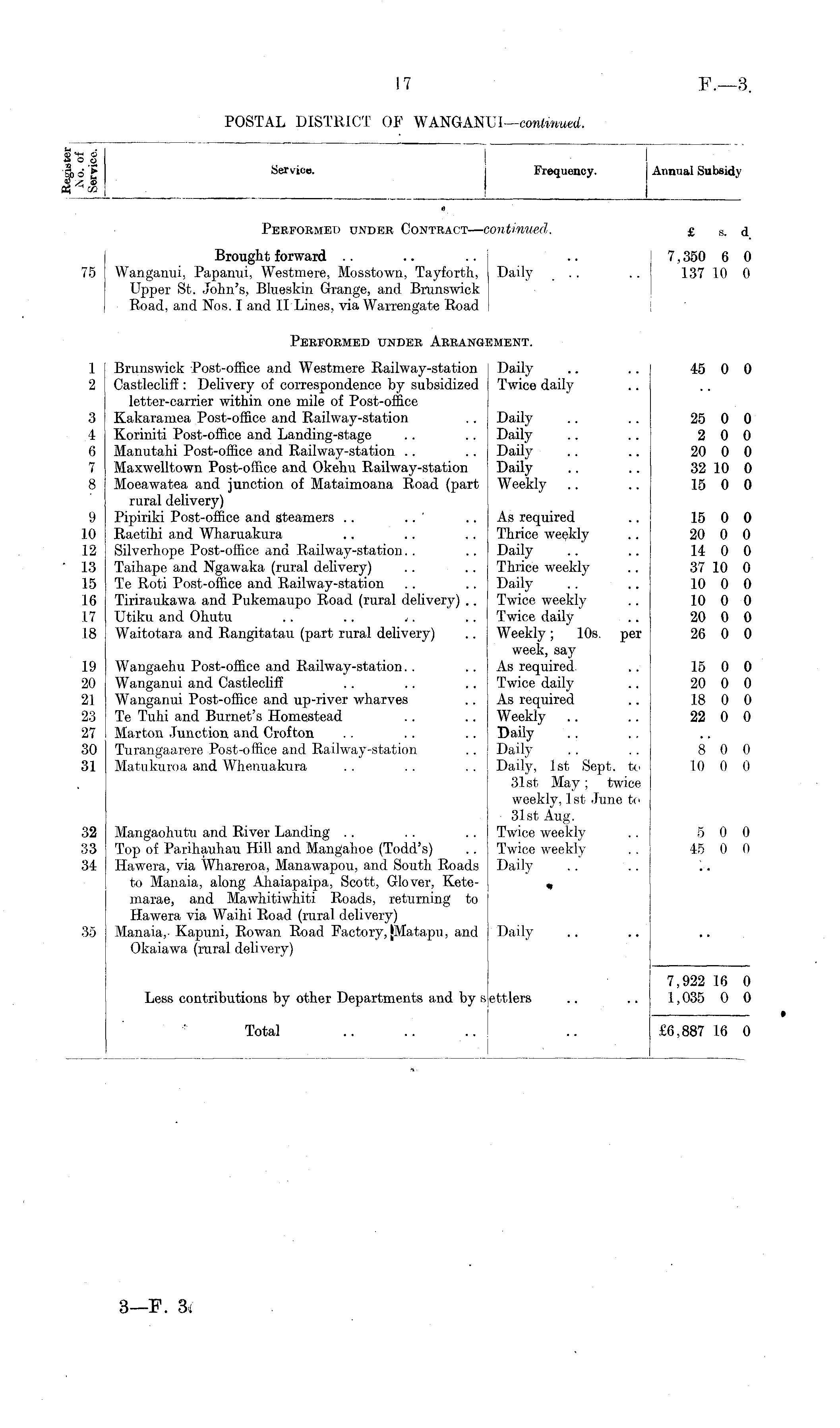 '5b o r Service. ! Frequency. I Annual Subsidy rt Performed under Contract— c continued. £ s. d Brought forward 75 Wanganui, Papartui, Westmere, Mosstown, Tayforth, Upper St. John's, Blueskin Grange, and Brunswick Road, and Nos. I and II Lines, via Warrengate Road Daily .. .. 7,350 6 0 137 10 0 Performed under Arrang] EMENT. 1 Brunswick Post-office and Westmere Railway-station 2 Castlecliff : Delivery of correspondence by subsidized letter-carrier within one mile of Post-office 3 Kakaramea Post-office and Railway-station 4 Koriniti Post-office and Landing-stage 6 Manutahi Post-office and Railway-station 7 Maxwelltown Post-office and Okehu Railway-station 8 Moeawatea and junction of Mataimoana Road (part rural delivery) 9 Pipiriki Post-office and steamers 10 Raetihi and Wharuakura 12 Silverhope Post-office and Railway-station. . 13 Taihape and Ngawaka (rural delivery) 15 Te Roti Post-office and Railway-station 16 Tiriraukawa and Pukemaupo Road (rural delivery) .. 17 Utiku and Ohutu 18 Waitotara and Rangitatau (part rural delivery) Daily Twice daily 45 0 0 Daily Daily Daily Daily Weekly 25 0 0 2 0 0 20 0 0 32 10 0 15 0 0 19 Wangaehu Post-office and Railway-station.. 20 Wanganui and Castlecliff 21 Wanganui Post-office and up-river wharves 23 Te Tuhi and Burnet's Homestead 27 Marton Junction and Crofton 30 Turangaarere Post-office and Railway-station 31 Matukuroa and Whenuakura As required Thrice weekly Daily T trice weekly Daily Twice weekly Twice daily Weekly; 10s. per week, say As required Twice daily As required Weekly Daily Daily Daily, 1st Sept. to 31st May; twice weekly, 1st June to 31st Aug. Twice weekly Twice weekly Daily 15 0 0 20 0 0 14 0 0 37 10 0 10 0 0 10 0 0 20 0 0 26 0 0 15 0 0 20 0 0 18 0 0 22 0 0 8 0 0 10 0 0 5 0 0 45 0 0 32 Mangaohutu and River Landing 33 Top of Parihauhau Hill and Mangahoe (Todd's) 34 Hawera, via Whareroa, Manawapou, and South Roads to Manaia, along Ahaiapaipa, Scott, Glover, Ketemarae, and Mawhitiwhiti Roads, returning to Hawera via Waihi Road (rural delivery) 35 Manaia,. Kapuni, Rowan Road Factory, jMatapu, and Okaiawa (rural delivery) « 35 Daily 7,922 18 0 Less contributions by other Departments and by s ettlers l'o35 0 0 7,922 16 1,035 0 0 0 Total j £6,887 16 0 £6,887 16 0