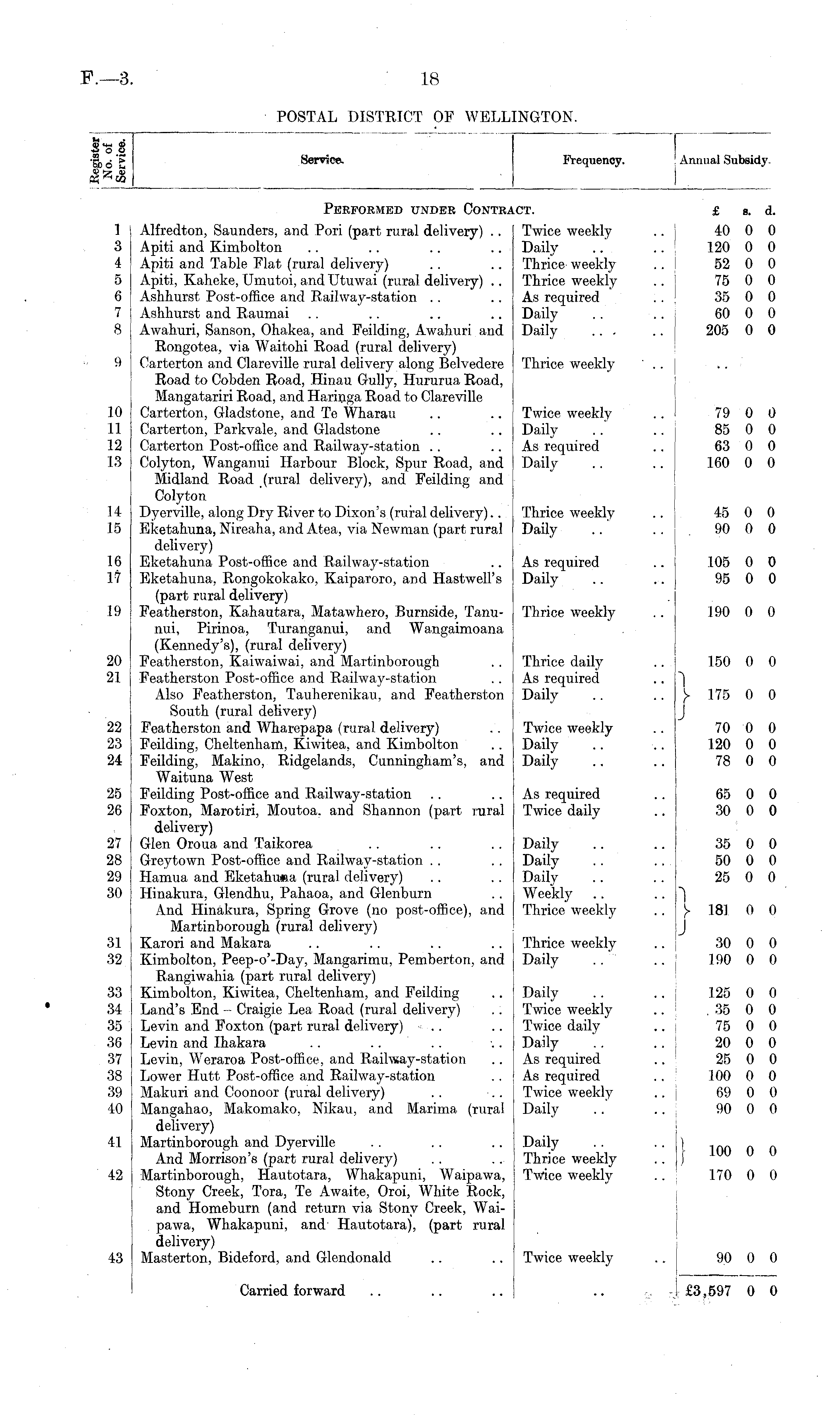 1 °.2 ■6 6 £ Service. Frequency. ! Annual Subsidy Performed under Contr. CT. £ s. d. 1 3 4 5 6 7 8 9 10 11 12 13 14 15 16 17 19 20 21 22 23 24 Alfredton, Saunders, and Pori (part rural delivery) . . Apiti and Kimbolton Apiti and Table Flat (rural delivery) Apiti, Kaheke, Umutoi, and Utuwai (rural delivery) .. Ashhurst Post-office and Railway-station Ashhurst and Raumai Awahuri, Sanson, Ohakea, and Feilding, Awahuri and Rongotea, via Waitohi Road (rural delivery) Carterton and Clareville rural delivery along Belvedere Road to Cobden Road, Hinau Gully, Hururua Road, Mangatariri Road, and Haringa Road to Clareville Carterton, Gladstone, and Te Wharau Carterton, Parkvale, and Gladstone Carterton Post-office and Railway-station Colyton, Wanganui Harbour Block, Spur Road, and Midland Road (rural delivery), and Feilding and Colyton Dyerville, along Dry River to Dixon's (rural delivery).. Eketahuna, Nireaha, and Atea, via Newman (part rural delivery) Eketahuna Post-office and Railway-station Eketahuna, Rongokokako, Kaiparoro, and Hastwell's (part rural delivery) Featherston, Kahautara, Matawhero, Burnside, Tanunui, Pirinoa, Turanganui, and Wangaimoana (Kennedy's), (rural delivery) Featherston, Kaiwaiwai, and Martinborough Featherston Post-office and Railway-station Also Featherston, Tauherenikau, and Featherston South (rural delivery) Featherston and Wharepapa (rural delivery) Feilding, Cheltenham, Kiwitea, and Kimbolton Feilding, Makino, Ridgelands, Cunningham's, and Waituna West Feilding Post-office and Railway-station Foxton, Marotiri, Moutoa. and Shannon (part rural delivery) Glen Oroua and Taikorea Greytown Post-office and Railwav-station Hamua and Eketahu«a (rural delivery) Hinakura, Glendhu, Pahaoa, and Glenburn And Hinakura, Spring Grove (no post-office), and Martinborough (rural delivery) Karori and Makara Kimbolton, Peep-o'-Day, Mangarimu, Pemberton, and Rangiwahia (part rural delivery) Kimbolton, Kiwitea, Cheltenham, and Feilding Land's End - Craigie Lea Road (rural delivery) Levin and Foxton (part rural delivery) ■<■-.. Levin and Ihakara Levin, Weraroa Post-office, and Railway-station Lower Hutt Post-office and Railway-station Makuri and Coonoor (rural delivery) Mangahao, Makomako, Nikau, and Marima (rural delivery) Martinborough and Dyerville And Morrison's (part rural delivery) Martinborough, Hautotara, Whakapuni, Waipawa, Stony Creek, Tora, Te Awaite, Oroi, White Rock, and Homeburn (and return via Stony Creek, Waipawa, Whakapuni, and Hautotara), (part rural delivery) Masterton, Bideford, and Glendonald Twice weekly Daily weekly Thrice weekly As required Daily Daily .. . Thrice weekly Twice weekly Daily As required Daily Thrice weekly Daily As required Daily Thrice weekly Thrice daily As required Daily Twice weekly Daily Daily I 40 0 0 120 0 0 52 0 0 75 0 0 35 0 0 60 0 0 205 0 0 79 0 0 85 0 0 63 0 0 160 0 0 45 0 0 90 0 0 105 0 0 95 0 0 190 0 0 150 0 0 y 175 0 0 J 70 0 0 120 0 0 78 0 0 25 26 As required Twice daily 65 0 0 30 0 0 27 28 29 30 Daily Daily Daily Weekly .. Thrice weekly 35 0 0 50 0 0 25 0 0 1 y i8i o o J 31 32 Thrice weekly Daily • • 30 0 0 190 0 0 33 34 35 36 37 38 39 40 Daily Twice weekly Twice daily Daily As required As required Twice weekly Daily .. 125 0 0 .35 0 0 75 0 0 20 0 0 25 0 0 100 0 0 69 0 0 90 0 0 41 Daily I Thrice weekly j Twice weekly } 100 0 0 42 170 0 0 I 9.0 0 0 43 Twice weekly Carried forward £3,597 0 0