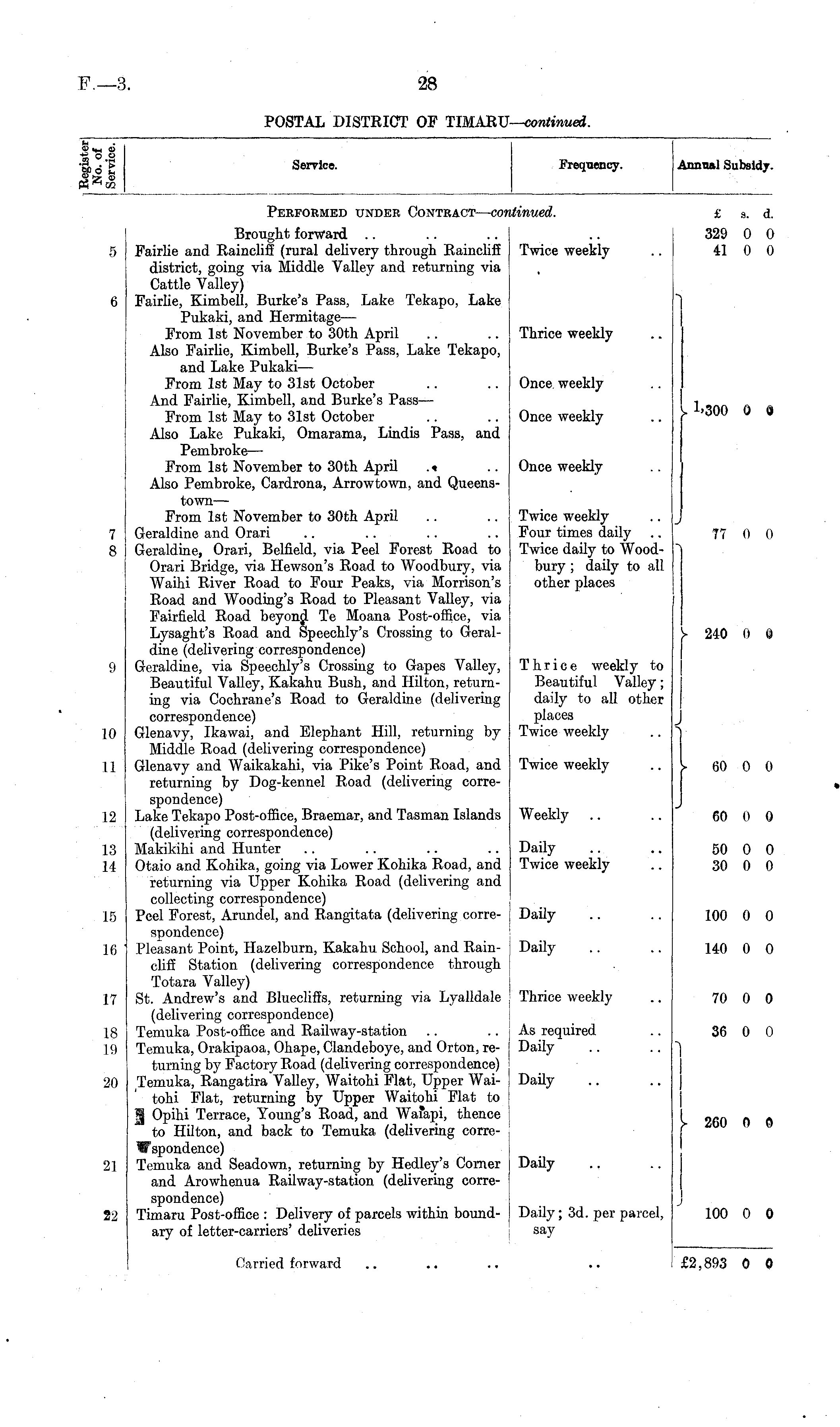 tfjg Service. Frequency. Annual Subsidy. Performed under Contract — co; itinued. £ s. d. 10 5 7 8 Brought forward Fairlie and Raincliff (rural delivery through KaincliS district, going via Middle Valley and returning via Cattle Valley) Fairlie, Kimbell, Burke's Pass, Lake Tekapo, Lake Pukaki, and Hermitage— From 1st November to 30th April Also Fairlie, Kimbell, Burke's Pass, Lake Tekapo, and Lake Pukaki — From 1st May to 31st October And Fairlie, Kimbell, and Burke's Pass — From 1st May to 31st October Also Lake Pukaki, Omarama, Lindis Pass, and Pembroke — From 1st November to 30th April .« Also Pembroke, Cardrona, Arrowtown, and Queenstown — From 1st November to 30th April Geraldine and Orari Geraldine, Orari, Belfield, via Peel Forest Road to Orari Bridge, via Hewson's Road to Woodbury, via Waihi River Road to Four Peaks, via Morrison's Road and Wooding's Road to Pleasant Valley, via Fairfield Road beyond Te Moana Post-office, via Lysaght's Road and Speechly's Crossing to Geraldine (delivering correspondence) Geraldine, via Speechly's Crossing to Gapes Valley, Beautiful Valley, Kakahu Bush, and Hilton, returning via Cochrane's Road to Geraldine (delivering correspondence) Glenavy, Ikawai, and Elephant Hill, returning by Middle Road (delivering correspondence) Glenavy and Waikakahi, via Pike's Point Road, and returning by Dog-kennel Road (delivering correspondence) Lake Tekapo Post-office, Braemar, and Tasman Islands (delivering correspondence) Makikihi and Hunter Otaio and Kohika, going via Lower Kohika Road, and returning via Upper Kohika Road (delivering and collecting correspondence) Peel Forest, Arundel, and Rangitata (delivering correspondence) Pleasant Point, Hazelburn, Kakahu School, and Raincliff Station (delivering correspondence through Totara Valley) St. Andrew's and Bluecliffs, returning via Lyalldale (delivering correspondence) Temuka Post-office and Railway-station Temuka, Orakipaoa, Ohape, Clandeboye, and Orton, returning by Factory Road (delivering correspondence) Temuka, Rangatira Valley, Waitohi Flat, Upper Waitohi Flat, returning by Upper Waitohi Flat to ]§ Opihi Terrace, Young's Road, and Waiapi, thence to Hilton, and. back to Temuka (delivering correWspondence) Temuka and Seadown, returning by Hedley's Corner and Arowhenua Railway-station (delivering correspondence) Timaru Post-office : Delivery of parcels within boundary of letter-carriers' deliveries Twice weekly Thrice weekly Once weekly Once weekly Once weekly Twice weekly Four times daily Twice daily to Woodbury ; daily to all other places Thrice weekly to Beautiful Valley; daily to all other places Twice weekly . j> 329 41 i>300 77 240 60 0 0 0 0 0 0 0 0 0 © 0 0 II Twice weekly Weekly 60 0 0 12 13 14 Daily Twice weekly 50 30 0 0 0 0 15 Daily 100 0 0 16 Daily 140 0 0 17 Thrice weekly 70 0 0 18 I!) As required Daily 36 0 0 20 Daily 1 I l 260 0 0 Daily 21 22 Daily; 3d. per parcel, say j 100 0 0 Carried forward £2,893 0 0