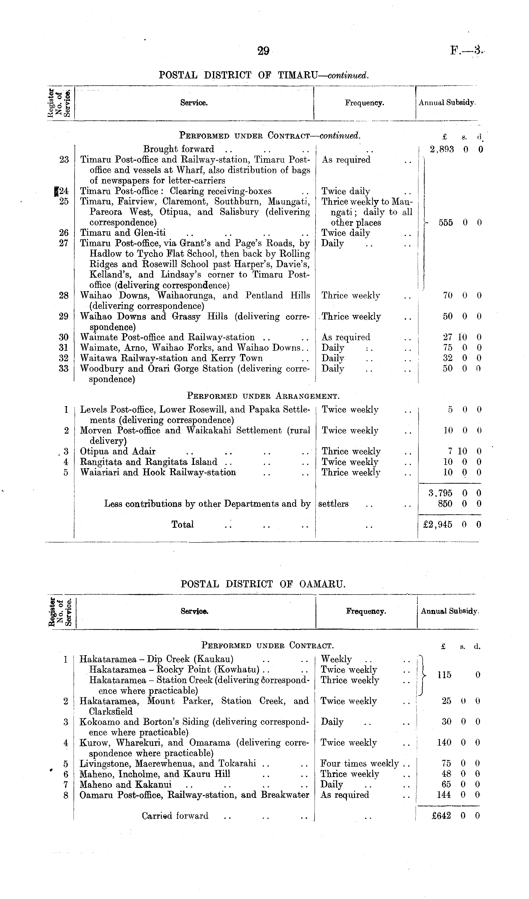 f"S 8 til Service. Frequency. Annual Subsidy. Performed under Contract— -continued. £ s. <\ Brought forward Timaru Post-office and Railway-station, Timaru Postoffice and vessels at Wharf, also distribution of bags of newspapers for letter-carriers Timaru Post-office : Clearing receiving-boxes Timaru, Fairview, Claremont, Southburn, Maungati, Pareora West, Otipua, and Salisbury (delivering correspondence) Timaru and Glen-iti Timaru Post-office, via Grant's and Page's Roads, by Hadlow to Tycho Plat School, then back by Rolling Ridges and Rosewill School past Harper's, Davie's, Kelland's, and Lindsay's corner to Timaru Postoffice (delivering correspondence) Waihao Downs, Waihaorunga, and Pentland Hills (delivering correspondence) Waihao Downs and Grassy Hills (delivering correspondence) Waimate Post-office and Railway-station Waimate, Arno, Waihao Forks, and Waihao Downs.. Waitawa Railway-station and Kerry Town Woodbury and Orari Gorge Station (delivering correspondence) As required 2,893 0 0 23 124 25 Twice daily Thrice weekly to Maungati; daily to all other places Twice daily Daily 26 27 555 0 0 Thrice weekly 28 70 0 0 29 Thrice weekly 50 0 0 30 31 32 33 As required Daily :. Daily Daily 27 10 75 0 32 0 50 0 0 0 0 0 Performed under Arrange CENT. 5 0 0 1 Levels Post-office, Lower Rosewill, and Papaka Settlements (delivering correspondence) Morven Post-office and Waikakahi Settlement (rural delivery) Otipua and. Adair Rangitata and Rangitata Island Waiariari and Hook Railway-station Twice weekly 2 Twice weekly 10 0 0 .3 4 5 Thrice weekly Twice weekly Thrice weekly 7 10 10 0 10 0 0 0 0 Less contributions by other Departments and by settlers 3,795 850 0 0 0 0 Total .: £2,945 0 ()
