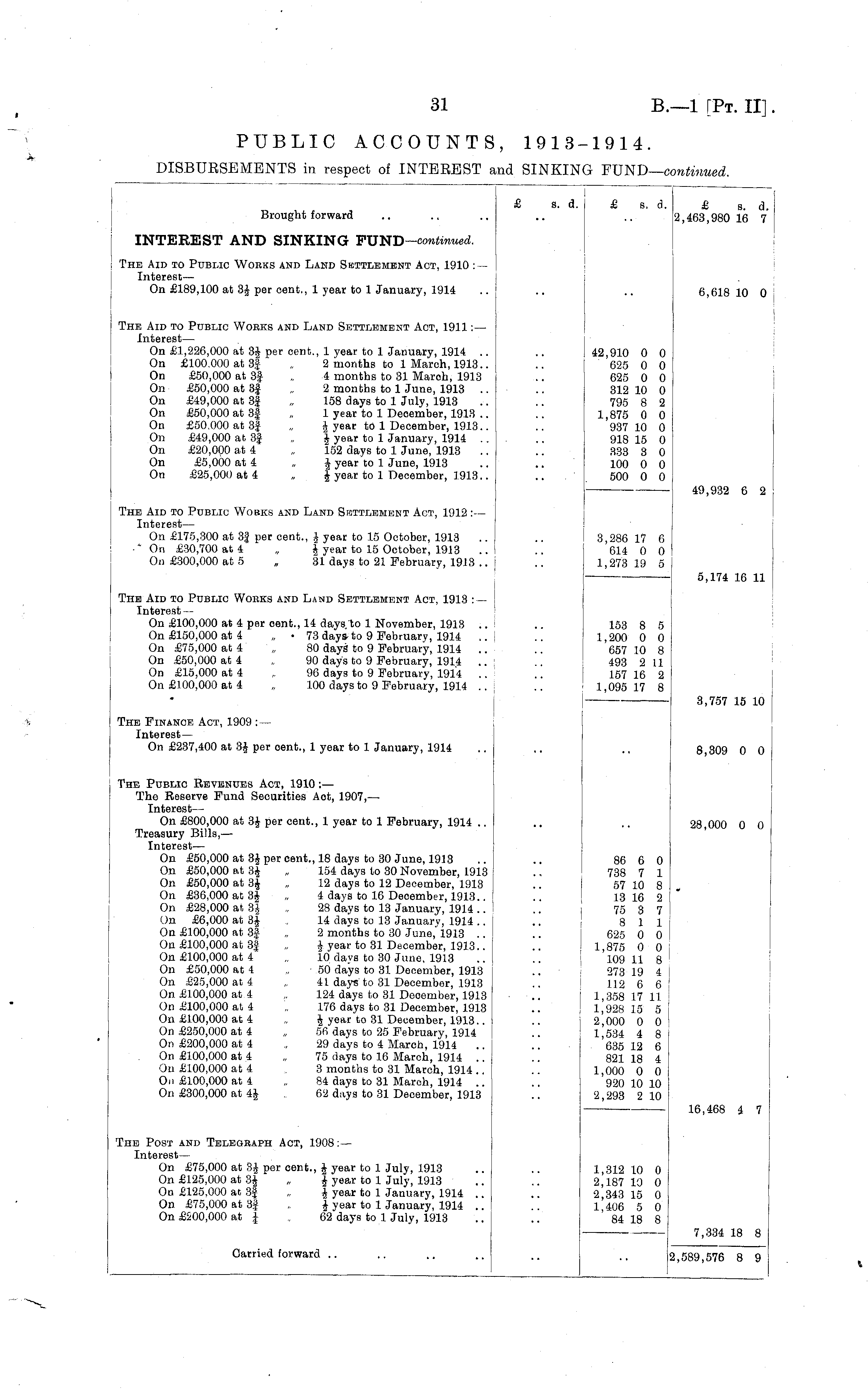 Brought forward £ s. d. £ s. d. £ s. d. 2,463,980 16 7 INTEREST AND SINKING FJJNB-continued. The Aid to Public Wobks and Land Settlement Act, 1910 : — Interest— On £189,100 at 3J per cent., 1 year to 1 January, 1914 6,618 10 0 The Aid to Public Works and Land Settlement Act, 1911:— Interest— On £1,226,000 at 3J per cent., 1 year to 1 January, 1914 .. On £100.000 at 3f „ 2 months to 1 March, 1913.. On £50,000 at 3| „ 4 months to 31 Maroh, 1913 On £50,000 at 3| „ 2 months to 1 June, 1913 .. On £49,000 at 3| „ 158 days to 1 July, 1913 On £50,000 at 3| „ 1 year to 1 Deoember, 1913 .. On £50,000 at 3| „ *\ year to 1 December, 1913.. On £49,000 at 3| „ J year to 1 January, 1914 .. On £20,000 at 4 „ 152 days to 1 June, 1913 .. On £5,000 at 4 „ J year to 1 June, 1913 On £25,000 at 4 „ | year to 1 December, 1913.. 42,910 0 0 625 0 0 625 0 0 312 10 0 795 8 2 1,875 0 0 937 10 0 918 15 0 333 3 0 100 0 0 500 0 0 The Aid to Public Wobks and Land Settlement Act, 1912 :— Interest— On £175,300 at 3J per cent., J year to 15 October, 1913 On £30,700 at 4 „ | year to 15 October, 1913 On £300,000 at 5 „ 31 days to 21 February, 1913 .. 49,932 6 2 3,286 17 6 614 0 0 1,273 19 5 5,174 16 11 The Aid to Public Works and Land Settlement Act, 1913 : — Interest — On £100,000 at 4 per oent., 14 days to 1 November, 1913 .. On £150,000 at 4 „ • 73 days to 9 February, 1914 .. On £75,000 at 4 „ 80 days to 9 February, 1914 .. On £50,000 at 4 „ 90 days to 9 February, 1914 .. On £15,000 at 4 „ 96 days to 9 February, 1914 .. On £100,000 at 4 „ 100 days to 9 February, 1914 .. 153 8 5 1,200 0 0 657 10 8 493 2 11 157 16 2 1,095 17 8 The Finance Act, 1909 : — InterestOn £237,400 at 3J per oent., 1 year to 1 January, 1914 3,757 15 10 8,309 0 0 The Public Revenues Act, 1910: — The Reserve Fund Securities Aot, 1907, — Interest— On £800,000 at 3*} per cent., 1 year to 1 February, 1914 .. Treasury Bills, — Interest — On £50,000 at 3J per cent., 18 days to 30 June, 1913 On £50,000 at 3t| „ 154 days to 30 November, 1913 On £50,000 at 3J „ 12 days to 12 Deoember, 1913 On £36,000 at 3J „ 4 days to 16 Deoember, 1913.. On £28,000 at 3| „ 28 days to 13 January, 1914 .. On £6,000 at 3| 14 davs to 13 Januarv, 1914 .. On £100,000 at 3| „ 2 months to 30 June,'1913 .. On £100,000 at 3| „ | year to 31 December, 1913.. On £100,000 at 4 „ 10 davs to 30 June, 1913 On £50,000 at 4 „ 50 days to 31 December, 1913 On £25,000 at 4 „ 41 days to 31 December, 1913 On £100,000 at 4 „ 124 days to 31 Deoember, 1913 On £100,000 at 4 „ 176 days to 31 December, 1913 On £100,000 at 4 „ J year to 31 December, 1913.. On £250,000 at 4 „ 56 days to 25 February, 1914 On £200,000 at 4 „ 29 days to 4 March, 1914 On £100,000 at 4 „ 75 days to 16 March, 1914 .. On £100,000 at 4 „ 3 months to 31 March, 1914 .. On £100,000 at 4 „ 84 days to 31 Maroh, 1914 .. On £300,000 at 4J 62 days to 31 December, 1913 86 6 0 738 7 1 57 10 8 13 16 2 75 3 7 8 1 1 625 0 0 1,875 0 0 109 11 8 273 19 4 112 6 6 1,358 .17 11 1,928 15 5 2,000 0 0 1,534 4 8 635 12 6 821 18 4 1,000 0 0 920 10 10 2,293 2 10 28,000 0 0 16,468 4 7 The Post and Telegraph Act, 1908:— Interest — On £75,000 at 3J per cent., J year to 1 July, 1913 On £125,000 at 3| „ \ year to 1 July, 1913 On £125.000 at. 3f „ f year to 1 January, 1914 .. On £75,000 at 3f , f year to 1 January, 1914 .. On £500,000 at f , 62 days to 1 July, 1913 1,312 10 0 2,187 10 0 2,343 15 0 1,406 5 0 84 18 8 7,334 18 8 Carried forward 12,589,576 8 9