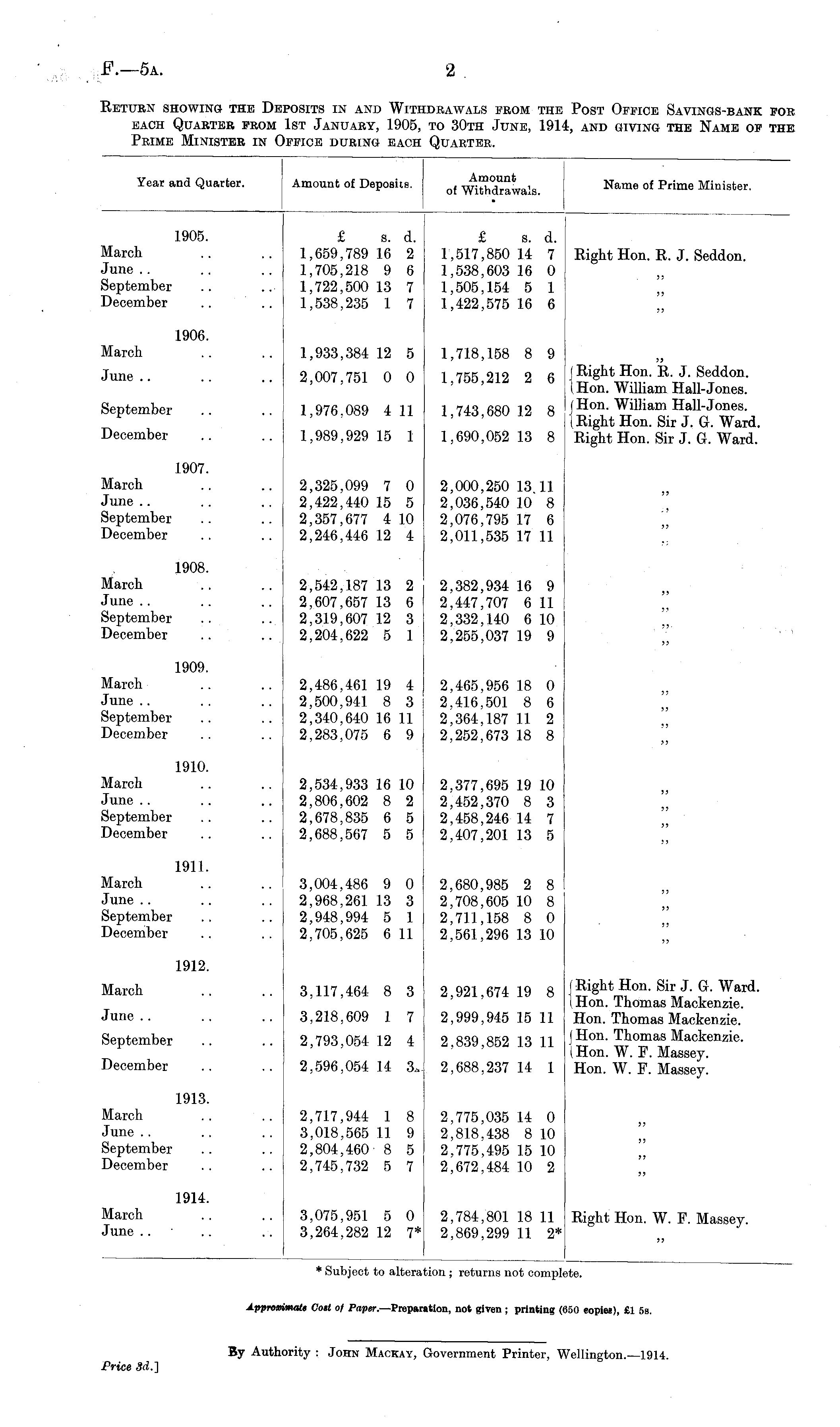 Year and Quarter. Amount of Deposits. Amount of Withdrawals. Name of Prime Minister. 1905. £ s. d. 1,659,789 16 2 1,705,218 9 6 1,722,500 13 7 1,538,235 1 7 £ s. d. 1,517,850 14 7 1,538,603 16 0 1,505,154 5 1 1,422,575 16 6 March Right Hon. R. J. Seddon. June .. September December J? »> 1906. 5 J March 1,933,384 12 5 1,718,158 8 9 J Right Hon. R. J. Seddon. [ Hon. William Hall-Jones. ( Hon. William Hall-Jones. [Right Hon. Sir J. G. Ward. Right Hon. Sir J. G. Ward. June .. 2,007,751 0 0 1,755,212 2 6 September 1,976,089 4 11 1,743,680 12 8 December 1,989,929 15 1 1,690,052 13 8 1907. 2,325,099 7 0 2,422,440 15 5 2,357,677 4 10 2,246,446 12 4 2,000,250 13 11 2,036,540 10 8 2,076,795 17 6 2,011,535 17 11 March s> June .. September December ;) )» 1908. 2,382,934 16 9 2,447,707 6 11 2,332,140 6 10 2,255,037 19 9 March June .. September December 2,542,187 13 2 2,607,657 13 6 2,319,607 12 3 2,204,622 5 1 1909. »> March June .. September December 2,486,461 19 4 2,500,941 8 3 2,340,640 16 11 2,283,075 6 9 2,465,956 18 0 2,416,501 8 6 2,364,187 11 2 2,252,673 18 8 j) u j) 1910. ?) March June .. September December 2,534,933 16 10 2,806,602 8 2 2,678,835 6 5 2,688,567 5 5 2,377,695 19 10 2,452,370 8 3 2,458,246 14 7 2,407,201 13 5 ) j 55 J) 1911. ,•; March June .. September December 3,004,486 9 0 2,968,261 13 3 2,948,994 5 1 2,705,625 6 11 2,680,985 2 8 2,708,605 10 8 2,711,158 8 0 2,561,296 13 10 5) >> )) )) 1912. (Right Hon. Sir J. G. Ward. I Hon. Thomas Mackenzie. Hon. Thomas Mackenzie. I Hon. Thomas Mackenzie. I Hon. W. F. Massey. Hon. W. F. Massey. March 3,117,464 8 3 2,921,674 19 8 June .. 3,218,609 1 7 2,999,945 15 11 September 2,793,054 12 4 2,839,852 13 11 December 2,596,054 14 3. 2,688,237 14 1 1913. 2,717,944 1 8 3,018,565 11 9 2,804,460 8 5 2,745,732 5 7 2,775,035 14 0 2,818,438 8 10 2,775,495 15 10 2,672,484 10 2 March June .. September December J) )5 J) J? 1914. 3,075,951 5 0 3,264,282 12 7* 2,784,801 18 11 2,869,299 11 2* March June .. Right Hon. W. F. Massey. j j