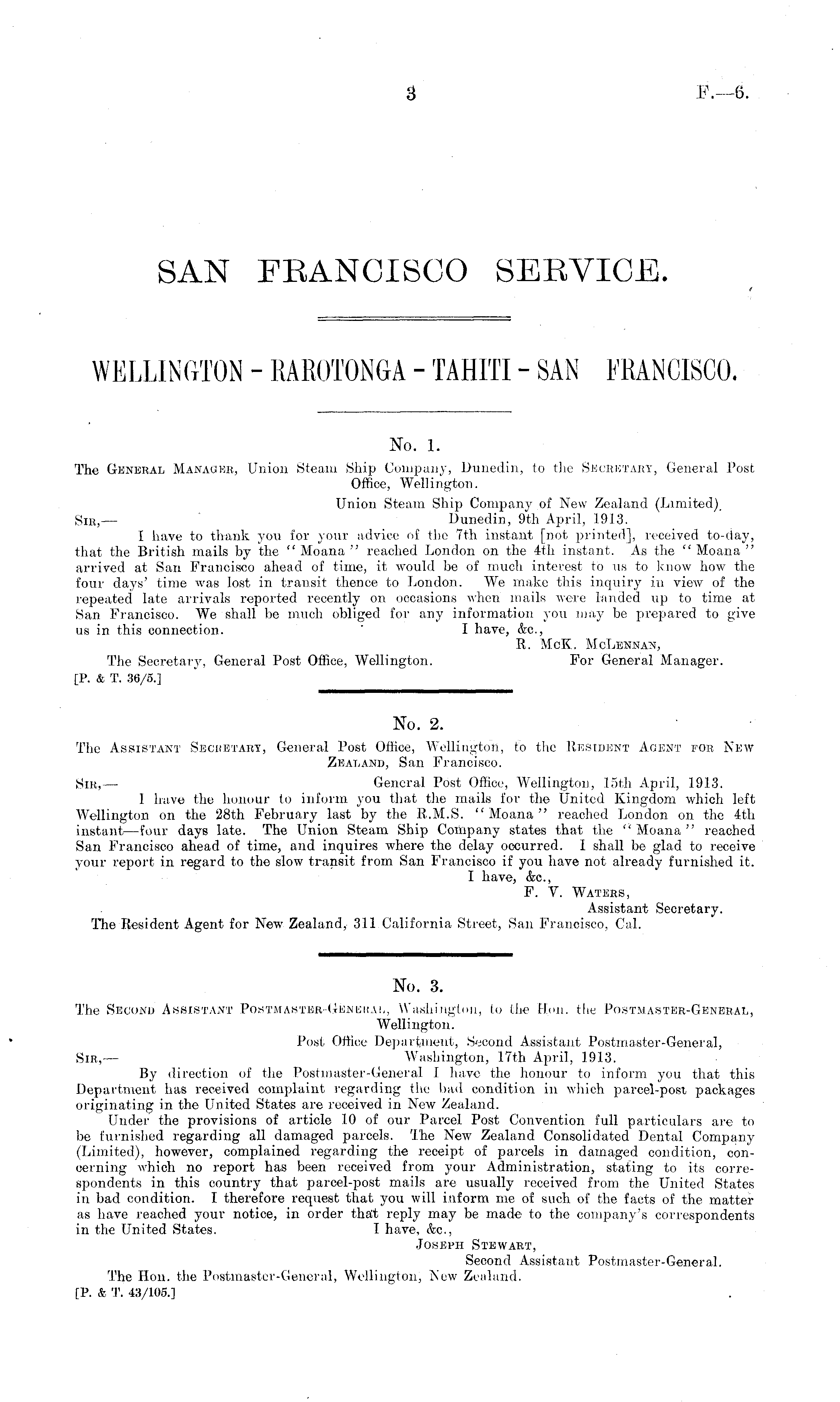 SAN FBANCISCO SERVICE. WELLINGTON - RAROTONGA - TAHITI - SAN FRANCISCO. No. 1. The General Manager, Union Steam Ship Company, Dunedin, io the Secretary, General lost Office, Wellington. Union Steam Ship Company of New Zealand (Limited). Sir,— Dunedin, 9th April, 1913. I have to thank you for your advice of the 7th instant [not printed], received to-day, that the British mails by the " Moana " reached London on the 4th instant. As the " Moana " arrived at San Francisco ahead of time, it would be of much interest to us to know how the four days' time was lost in transit thence to London. We make this inquiry in view of the repeated late arrivals reported recently on occasions when mails were landed up to time at San Francisco. We shall be much obliged for any information 3-011 may bo prepared to give us in this connection. I have, &c, E. McK. McLennan, The Secretary, General Post Office, Wellington. For General Manager. [P. & T. 36/5.]
