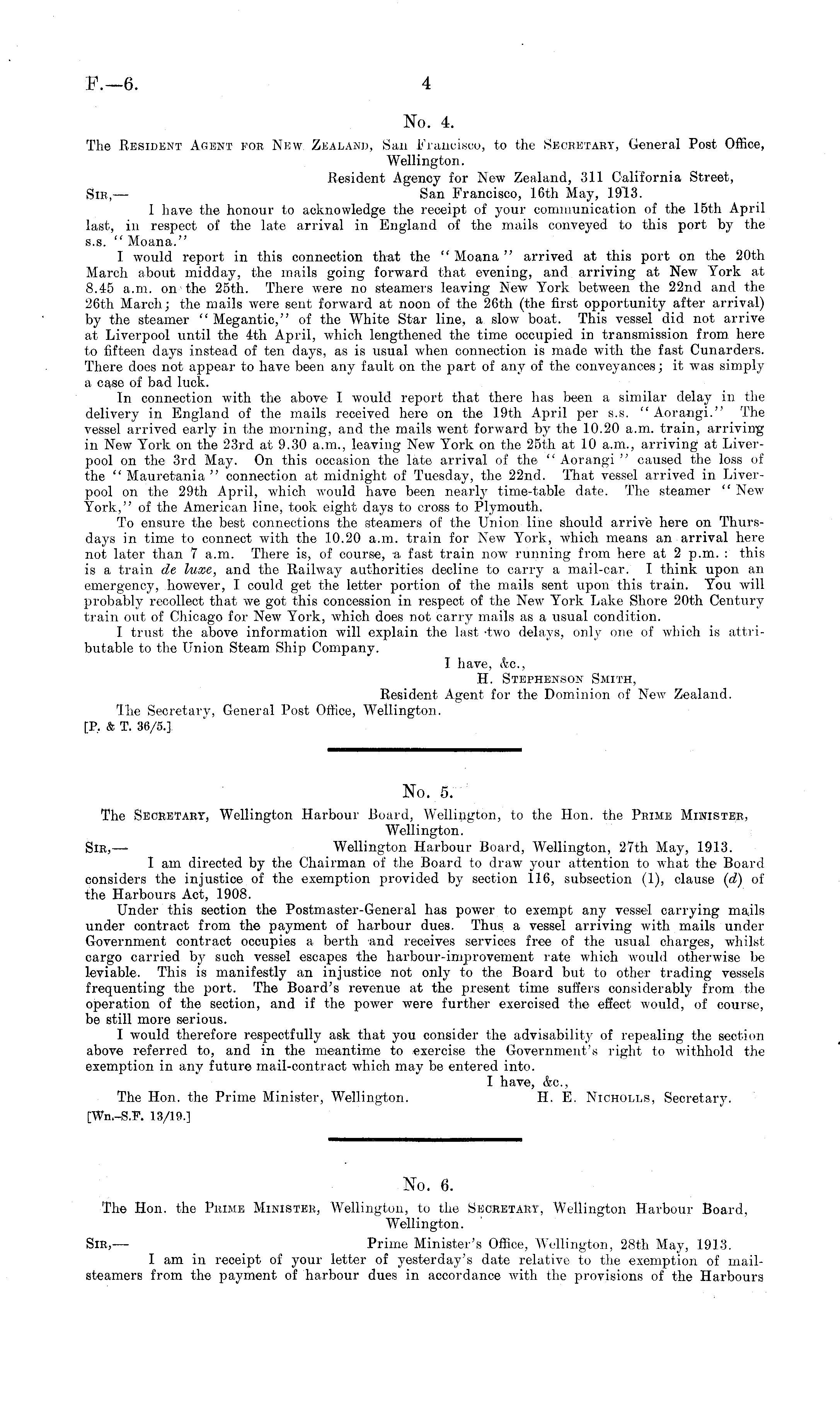 No. 4. The Eesident Agent for New Zealand, San Francisco, to the Secretary, General Post Office, Wellington. Resident Agency for New Zealand, 311 California Street, Sir, — San Francisco, 16th May, 1913. I have the honour to acknowledge the receipt of your communication of the 15th April last, in respect of the late arrival in England of the mails conveyed to this port by the s.s. " Moana." I would report in this connection that the " Moana " arrived at this port on the 20th March about midday, the mails going forward that evening, and arriving at New York at 8.45 a.m. on the 25th. There were no steamers leaving New York between the 22nd and the 26th March; the mails were sent forward at noon of the 26th (the first opportunity after arrival) by the steamer " Megantic," of the White Star line, a slow boat. This vessel did not arrive at Liverpool until the 4th April, which lengthened the time occupied in transmission from here to fifteen days instead of ten days, as is usual when connection is made with the fast Cunarders. There does not appear to have been any fault on the part of any of the conveyances; it was simply a case of bad luck. In connection with the above I would report that there has been a similar delay in the delivery in England of the mails received here on the 19th April per s.s. " Aorangi." The vessel arrived early in the morning, and the mails went forward by the 10.20 a.m. train, arriving in New York on the 23rd at 9.30 a.m., leaving New York on the 25th at 10 a.m., arriving at Liverpool on the 3rd May. On this occasion the late arrival of the " Aorangi " caused the loss of the " Mauretania " connection at midnight of Tuesday, the 22nd. That vessel arrived in Liverpool on the 29th April, which would have been nearly time-table date. The steamer " New York," of the American line, took eight days to cross to Plymouth. To ensure the best connections the steamers of the Union line should arrive here on Thursdays in time to connect with the 10.20 a.m. train for New York, which means an arrival here not later than 7 a.m. There is, of course, a fast train now running from here at 2 p.m. : this is a train de luxe, and the Railway authorities decline to carry a mail-car. I think upon an emergency, however, I could get the letter portion of the mails sent upon this train. You will probably recollect that we got this concession in respect of the New York Lake Shore 20th Century train out of Chicago for New York, which does not carry mails as a usual condition. I trust the above information will explain the last -two delays, only one of which is attributable to the Union Steam Ship Company. I have, &c, H. Stephenson Smith, Resident Agent for the Dominion of New Zealand. The Secretary, General Post Office, Wellington. [P. & T. 36/5.].
