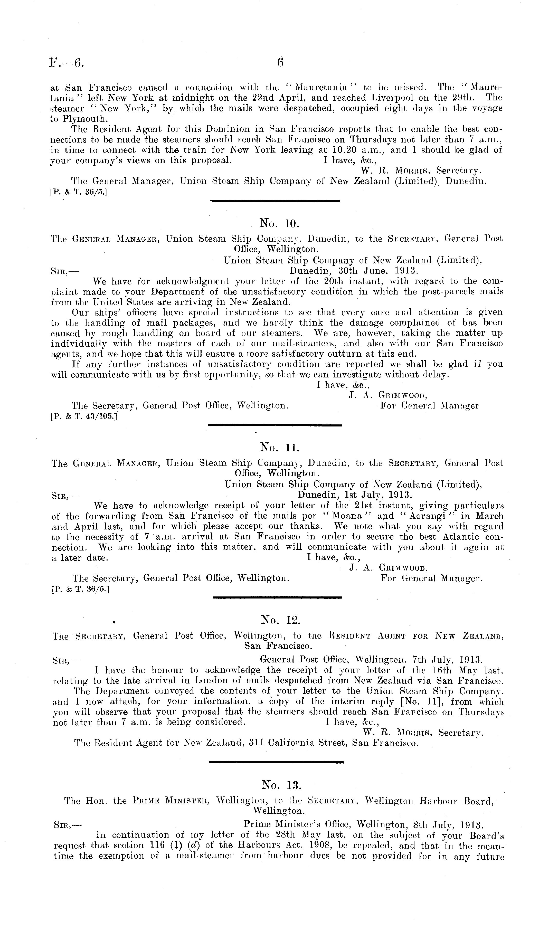 No. 12. The' Secretary, General Post Office, Wellington, to the Resident Agent for New Zealand, San Francisco. Sir, — General Post Office, Wellington, 7th July, 1913. I have the honour to acknowledge the receipt of your letter of the 16th May last, relating to the late arrival in London of mails despatched from New Zealand via San Francisco. The Department conveyed the contents of your letter to the Union Steam Ship Company, and I now attach, for your information, a copy of the interim reply [No. 11], from which you will observe that your proposal that the steamers should reach San Francisco on Thursdays not later than 7 a.m. is being considered. I have, &c, W. R. Morris, Secretary. The Resident Agent for New Zealand, 311 California Street, San Francisco.