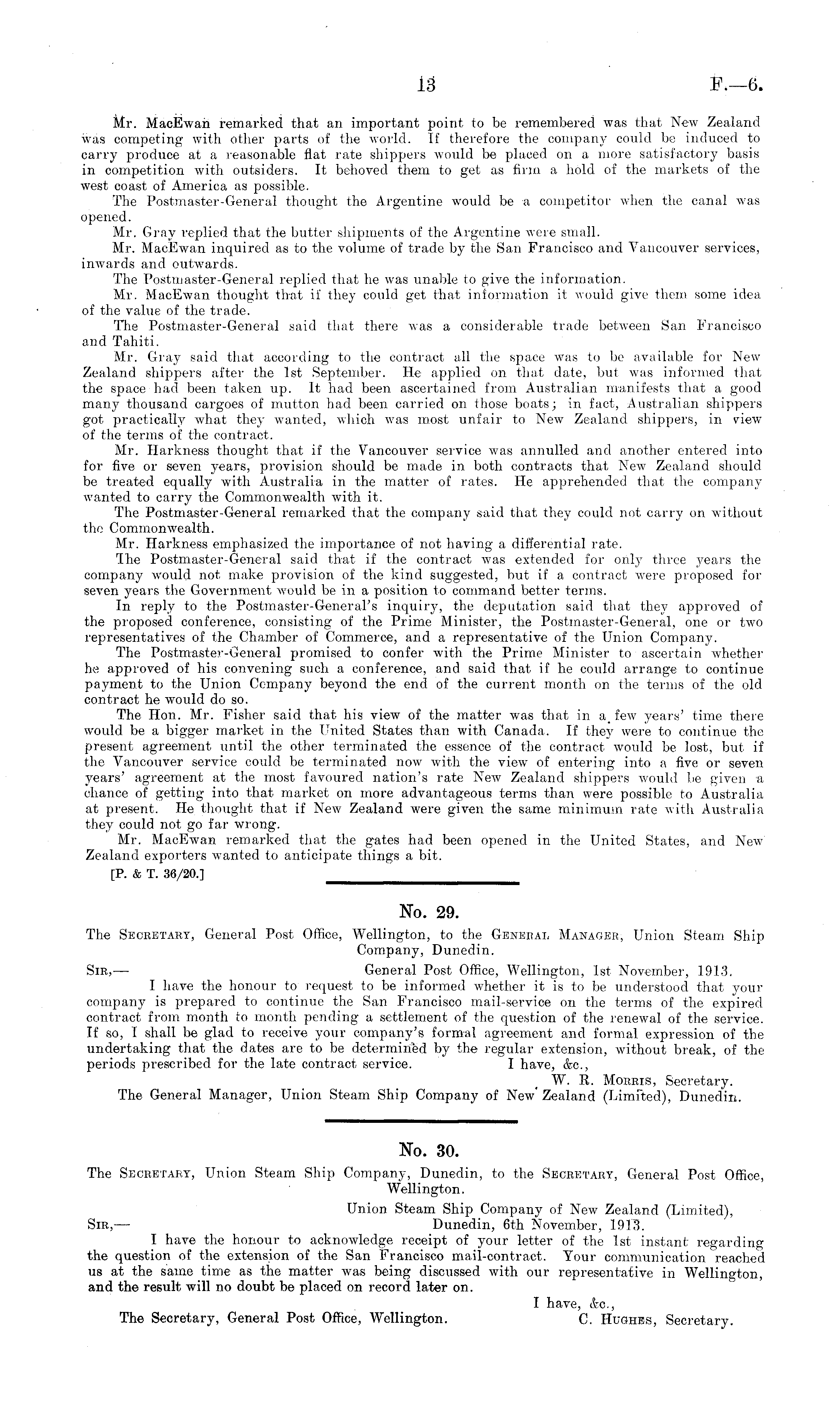 No. 29. The Secretary, General Post Office, Wellington, to the General Manager, Union Steam Ship Company, Dunedin. Sir, — General Post Office, Wellington, Ist November, 1913. I have the honour to request to be informed whether it is to be understood that your company is prepared to continue the San Francisco mail-service on the terms of the expired contract from month to month pending a settlement of the question of the renewal of the service. If so, I shall be glad to receive your company's formal agreement and formal expression of the undertaking that the dates are to be determined by the regular extension, without break, of the periods prescribed for the late contract service. I have, &c, W. E. MoKßis, Secretary. The General Manager, Union Steam Ship Company of New' Zealand (Limited), Dunedin.