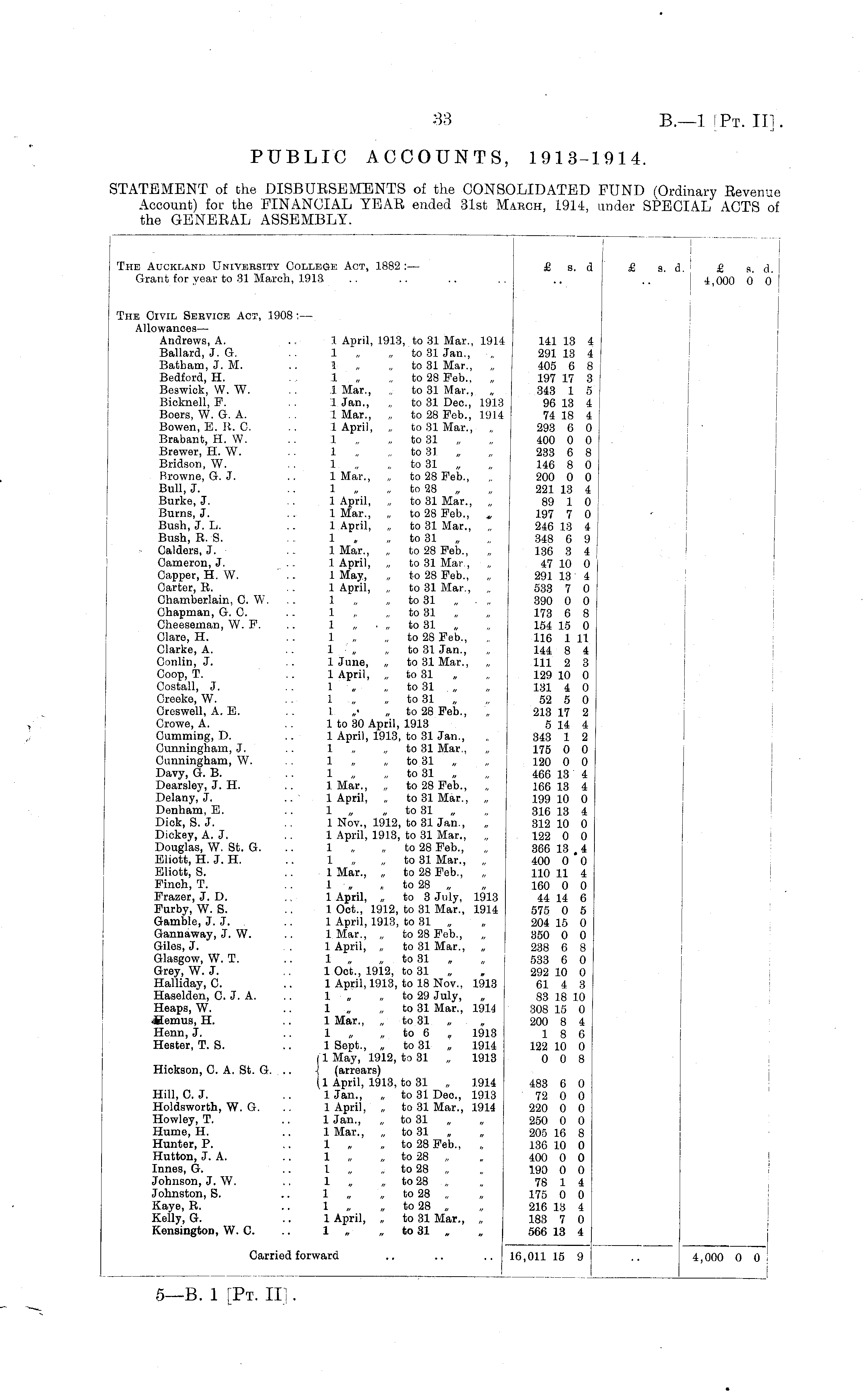 The Auckland University College Act, 1882 :— Grant for year to 31 March, 1913 £ s. d £ s. d. £ s. d. I 4,000 0 0 The Civil Service Act, 1908; — Allowances — Andrews, A. 1 April, 1913, to 31 Mar., 1914 Ballard, J. G. .. 1 „ „ to 31 Jan., , Batbam, J. M. .. 1 „ „ to 31 Mar., Bedford, H. . . 1 „ „ to 28 Feb., „ Beswick, W. W. . . 1 Mar., ., to 31 Mar., „ Bieknell, F. .. 1 Jan., „ to 31 Dec, 1913 Boers, W. G. A. .. 1 Mar., „ to 28 Feb., 1914 Bowen, E. R. C. .. 1 April, „ to 31 Mar., „ Brabant, H. W. .. 1 „ to 31 Brewer, H. W. .. 1 ., ,. to 31 „ Bridson, W. 1 „ „ to 31 Rrowne, G. J. .. 1 Mar., „ to 28 Feb., Bull, J. ... I „ „ to 28 „ Burke, J. .. 1 April, „ to 31 Mar., „ Burns, J. .. IMar., „ to 28 Feb., Bush, J. L. .. 1 April, „ to 31 Mar., „ Bush, R. S. . . 1 . „ to 31 „ Calders, J. ... 1 Mar., „ to 28 Feb., Cameron, J. .. 1 April, „ to 31 Mar , Capper, H. W. .. 1 May, „ to 28 Feb., „ Carter, R. 1 April, „ to 31 Mar., „ Chamberlain, C. W. .. 1 „ to 31 Chapman, G. C. .. 1 „ to 31 Cheeseman, W. F. .. 1 „ ■ „ to 31 Clare, H. 1 „ to 28 Feb., „ Clarke, A. .. 1 to 31 Jan., Conlin, J. .. 1 June, „ to 31 Mar., Coop, T. 1 April, „ to 31 Costall, J. . . 1 to 31 Creeke, W. .. 1 to 31 „ Creswell, A. E. .. 1 „■ „ to 28 Feb., „ Crowe, A. .. 1 to 30 April, 1913 Gumming, D. .. 1 April, 1913, to 31 Jan., Cunningham, J. .. 1 —„ to 31 Mar., Cunningham, W. .. 1 „ to 31 Davy, G. B. .. 1 „ „ to 31 „ Dearsley, J. H. .. IMar., „ to 28 Feb., „ Delany, J. 1 April, „ to 31 Mar., „ Denham, E. .. 1 „ to 31 Dick, S. J. .. 1 Nov., 1912, to 31 Jan., Dickey, A. J. .. 1 April, 1913, to 31 Mar., „ Douglas, W. St. G. .. 1 „ „ to 28 Feb., „ Eliott, H. J. H. .. 1 „ „ to 31 Mar., „ Eliott, S. .. 1 Mar., „ to 28 Feb., „ Finch, T. .. 1 „ „ to 28 „ Frazer, J. D. .. 1 April, „ to 3 July, 1913 Furby, W. S. .. 1 Oct., 1912, to 31 Mar., 1914 Gamble, J. J. .. 1 April, 1913, to 31 , Gannaway, J. W. .. IMar., „ to 28 Feb., Giles, J. .. 1 April, „ to 31 Mar., „ Glasgow, W. T. .. 1 , „ to 31 „ Grey, W. J. 1 Oct., 1912, to 31 „ Halliday, C. .. 1 April, 1913, to 18 Nov., 1913 Haselden, C. J. A. .. 1 „ „ to 29 July, Heaps, W. .. 1 „ „ to 31 Mar., 1914 Hemus, H. .. 1 Mar., „ to 31 Henn, J. .. 1 „ „ to 6 „ 1913 Hester, T. S. .. 1 Sept., „ to 31 „ 1914 |'l May, 1912, to 31 „ 1913 Hickson, C. A. St. G. .. \ (arrears) (l April, 1913, to 31 . 1914 Hill, C. J. .. 1 Jan., „ to 31 Dec, 1913 Holdsworth, W. G. .. 1 April, „ to 31 Mar., 1914 Howley, T. .. 1 Jan., „ to 31 Hume, H. .. IMar., „ to 31 „ Hunter, P. .. 1 „ „ to 28 Feb., „ Hutton, J. A. .. 1 „ „ to 28 „ Innes, G. .. 1 „ „ to 28 „ Johnson, J. W. .. 1 „ „ to 28 „ Johnston, S. .. 1 „ to 28 „ Kaye, R. 1 „ to 28 „ Kelly, G. .. 1 April, „ to 31 Mar., „ Kensington, W. C. .. 1 „ „ to 31 „ 141 13 4 291 13 4 405 6 8 197 17 3 343 1 5 96 13 4 74 18 4 293 6 0 400 0 0 233 6 8 146 8 0 200 0 0 221 13 4 89 1 0 197 7 0 246 13 4 348 6 9 136 3 4 47 10 0 291 13 4 533 7 0 390 0 0 173 6 8 154 15 0 116 1 11 144 8 4 111 2 3 129 10 0 131 4 0 52 5 0 213 17 2 5 14 4 343 1 2 175 0 0 120 0 0 466 13 4 166 13 4 199 10 0 316 13 4 312 10 0 122 0 0 366 13 . 4 400 0 0 110 11 4 160 0 0 44 14 6 575 0 5 204 15 0 350 0 0 238 6 8 533 6 0 292 10 0 61 4 3 83 18 10 308 15 0 200 8 4 18 6 122 10 0 0 0 8 I 483 6 0 72 0 0 220 0 0 250 0 0 205 16 8 136 10 0 400 0 0 190 0 0 78 1 4 175 0 0 216 13 4 183 7 0 566 13 4 I Carried forward 16,011 15 9 4,000 0 0