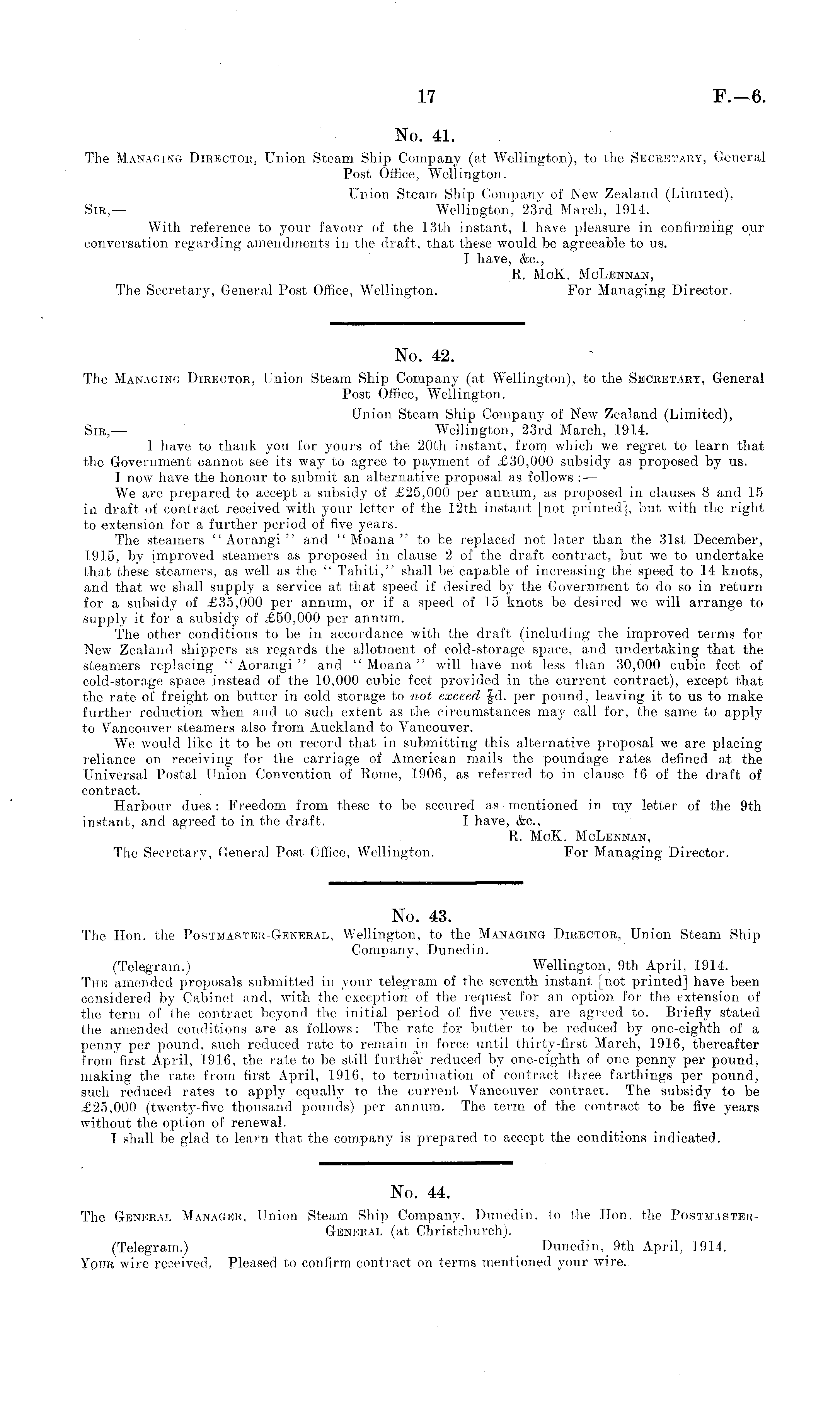 No. 41. The Managing Director, Union Steam Ship Company (at Wellington), to the Secretary, General Post Office, Wellington. Union Steam Ship Company of New Zealand (Limited). Sir,— Wellington, 23rd March, 1914. With reference to your favour of the 13th instant, I have pleasure in confirming our conversation regarding amendments in the draft, that these would be agreeable to us. I have, &c, R. MoK. McLennan, The Secretary, General Post Office, Wellington. For Managing Director.