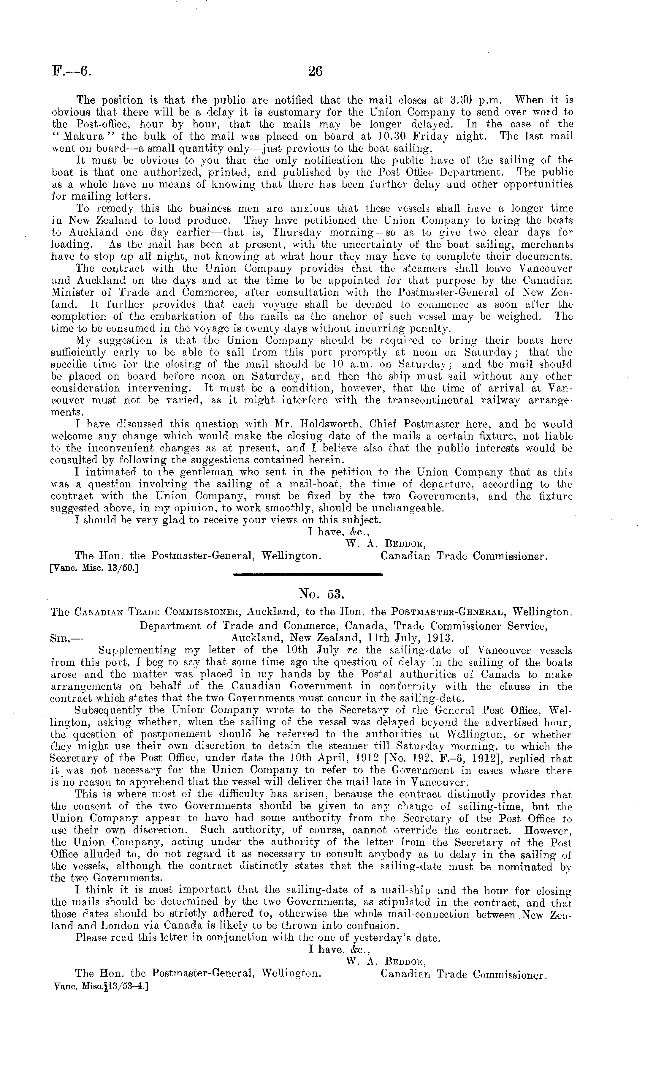 No. 53. The Canadian Tbade Commissioner, Auckland, to the Hon. the Postmaster-General, Wellington. Department of Trade and Commerce, Canada, Trade Commissioner Service, Sir, — Auckland, New Zealand, 11th July, 1913. Supplementing my letter of the 10th July re the sailing-date of Vancouver vessels from this port, I beg to say that some time ago the question of delay in the sailing of the boats arose and the matter was placed in my hands by the Postal authorities of Canada to make arrangements on behalf of the Canadian Government in conformity with the clause in the contract which states that the two Governments must concur in the sailing-date. Subsequently the Union Company wrote to the Secretary of the General Post Office, Wellington, asking whether, when the sailing of the vessel was delayed beyond the advertised hour, the question of postponement should be referred to the authorities at Wellington, or whether they might use their own discretion to detain the steamer till Saturday morning, to which the Secretary of the Post Office, under date the 10th April, 1912 [No. 192, F.-6, 1912], replied that it was not necessary for the Union Company to refer to the Government in cases where there is no reason to apprehend that the vessel will deliver the mail late in Vancouver. This is where most of the difficulty has arisen, because the contract distinctly provides that the consent of the two Governments should be given to any change of sailing-time, but the Union Company appear to have had some authority from the Secretary of the Post Office to use their own discretion. Such authority, of course, cannot override the contract. However, the Union Company, acting under the authority of the letter from the Secretary of the Post Office alluded to, do not regard it as necessary to consult anybody as to delay in the sailing of the vessels, although the contract distinctly states that the sailing-date must be nominated by the two Governments. I think it is most important that the sailing-date of a mail-ship and the hour for closing the mails should be determined by the two Governments, as stipulated in the contract, and that those dates should be strictly adhered to, otherwise the whole mail-connection between New Zealand and London via Canada is likely to be thrown into confusion. Please read this letter in conjunction with the one of yesterday's date. I have, &c., W. A. Beddok, The Hon. the Postmaster-General, Wellington. Canadian Trade Commissioner, Vane. Miso.|l 3/53-4.]