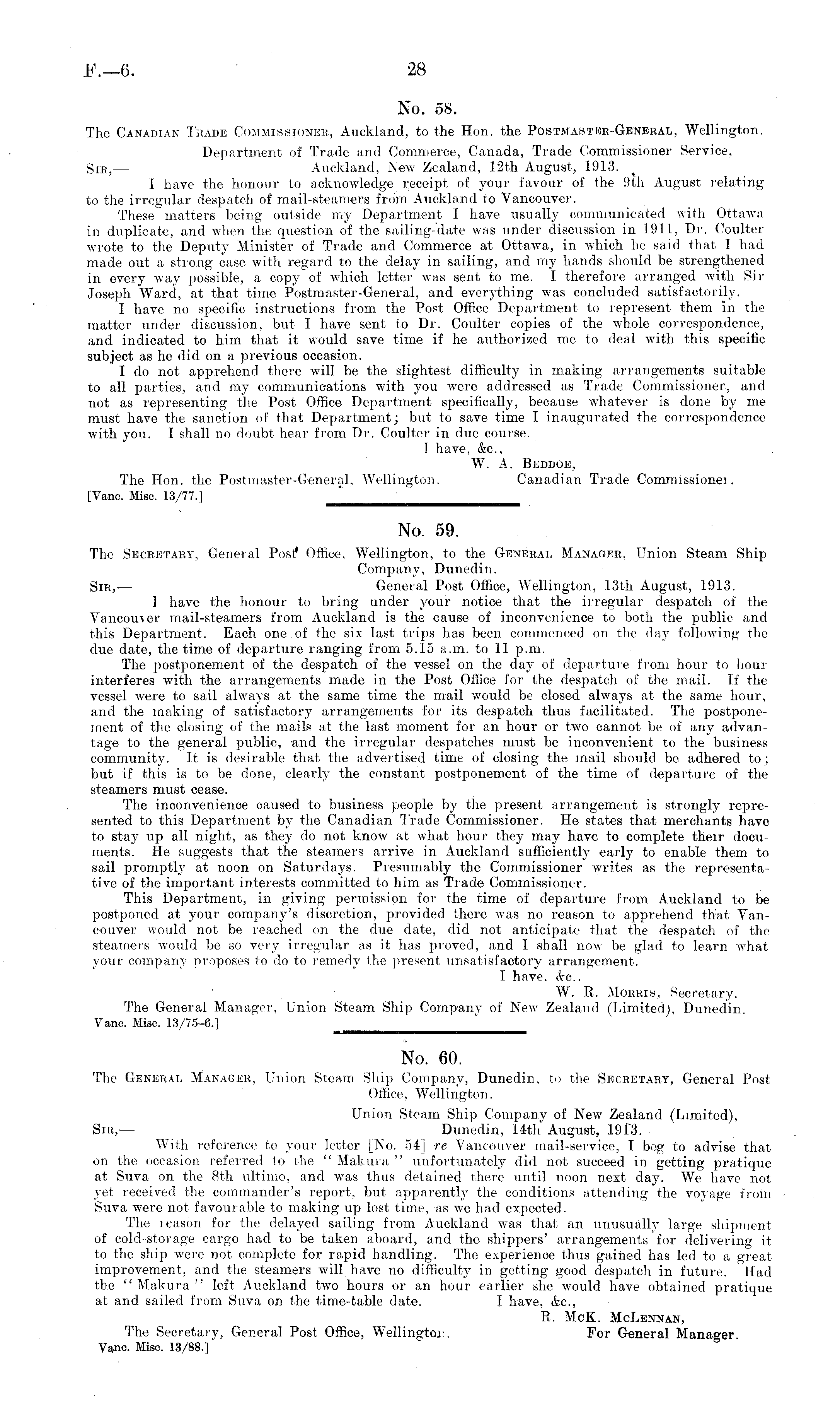 No. 59. The Secretary, General Posl Office, Wellington, to the General Manager, Union Steam Ship Company, Dunedin. Sir, — General Post Office, Wellington, 13th August, 1913. 1 have the honour to bring under your notice that the irregular despatch of the Vancouver mail-steamers from Auckland is the cause of inconvenience to both the public and this Department. Each one of the six last trips has been commenced on the day following the due date, the time of departure ranging from 5.15 a.m. to 11 p.m. The postponement of the despatch of the vessel on the day of departure from hour to hour interferes with the arrangements made in the Post Office for the despatch of the mail. If the vessel were to sail always at the same time the mail would be closed always at the same hour, and the making of satisfactory arrangements for its despatch thus facilitated. The postponement of the closing of the mails at the last moment for an hour or two cannot be of any advantage to the general public, and the irregular despatches must be inconvenient to the business community. It is desirable that the advertised time of closing the mail should be adhered to ; but if this is to be done, clearly the constant postponement of the time of departure of the steamers must cease. The inconvenience caused to business people by the present arrangement is strongly represented to this Department by the Canadian Trade Commissioner. He states that merchants have to stay up all night, as they do not know at what hour they may have to complete their documents. He suggests that the steamers arrive in Auckland sufficiently early to enable them to sail promptly at noon on Saturdays. Presumably the Commissioner writes as the representative of the important interests committed to him as Trade Commissioner. This Department, in giving permission for the time of departure from Auckland to be postponed at your company's discretion, provided there was no reason to apprehend that Vancouver would not be reached on the due date, did not anticipate that the despatch of the steamers would be so very irregular as it has proved, and I shall now be glad to learn what your company proposes to do to remedy the present unsatisfactory arrangement. I have, &c, W. R. Morris, Secretary. The General Manager, Union Steam Ship Company of New Zealand (Limited), Dunedin. Vane. Misc. 13/75-6.] "