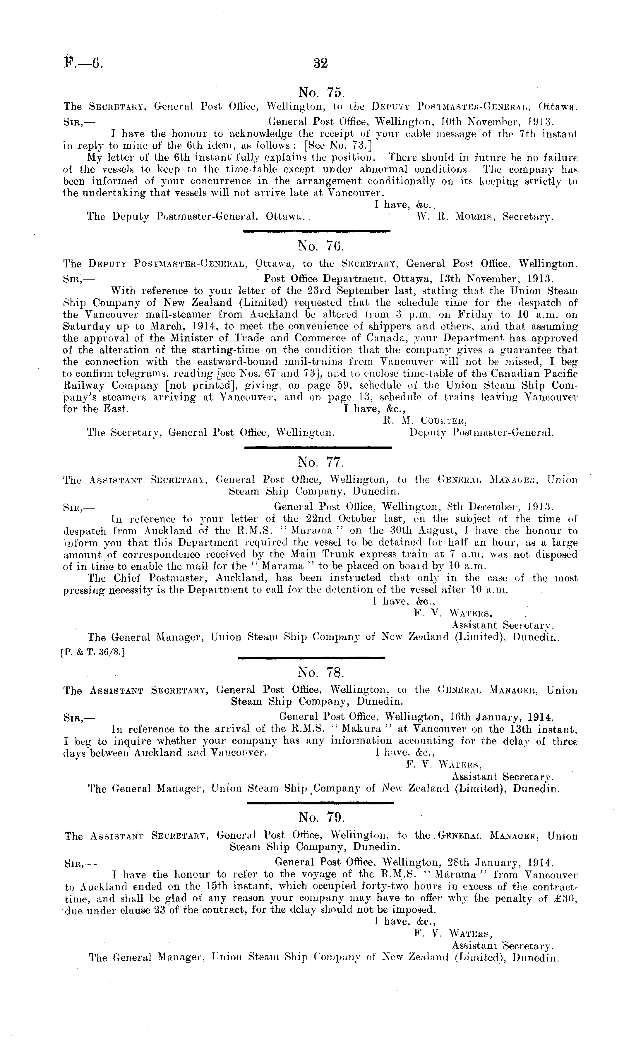 No. 78. The Assistant Secretary, General Post Office, Wellington, to the General Manager, Union Steam Ship Company, Dunedin. Sir, — General Post Office, Wellington, 16th January, 1914. In reference to the arrival of the R.M.S. " Makura " at Vancouver on the 13th instant, I beg to inquire whether your company has any information accounting for the delay of three days between Auckland and Vancouver. 1 h-ive, &c, F. V. Waters, Assistant Secretary. The General Manager, Union Steam Ship Company of New Zealand (Limited), Dunedin.