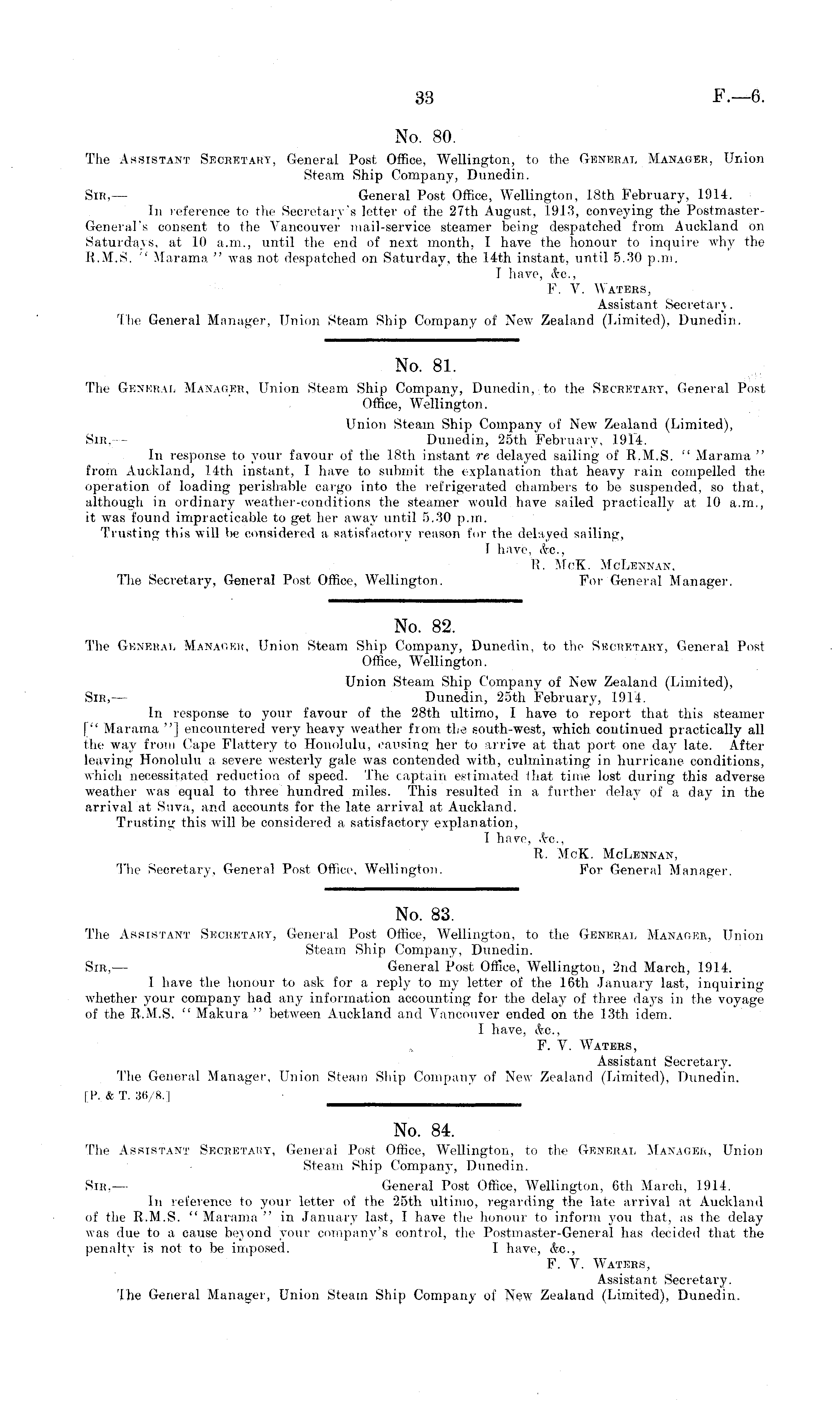 No. 84. The Assistant Secretary, General Post Office, Wellington, to the General Manager, Union Steam Ship Company, Dunedin. Sir, — General Post Office, Wellington, 6th March, 1914. In reference to your letter of the 25th ultimo, regarding the late arrival at Auckland of the R.M.S. " Marama " in January last, I have the honour to inform you that, as the delay was due to a cause beyond your company's control, the Postmaster-General has decided that the penalty is not to be imposed. I have, &c, F. V. Waters, Assistant Secretary. The General Manager, Union Steam Ship Company of New Zealand (Limited), Dunedin.